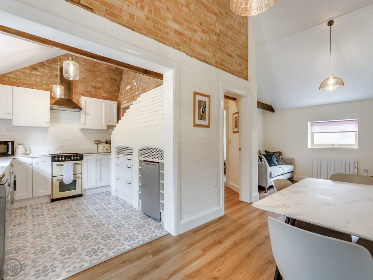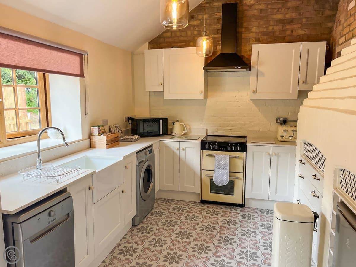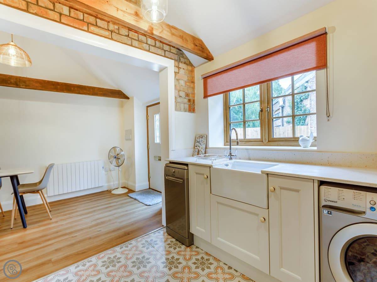 Inside, it's open plan. Exposed beams, wooden floors. There's underfloor heating, a washing machine, and a dishwasher. Wi-Fi is included.