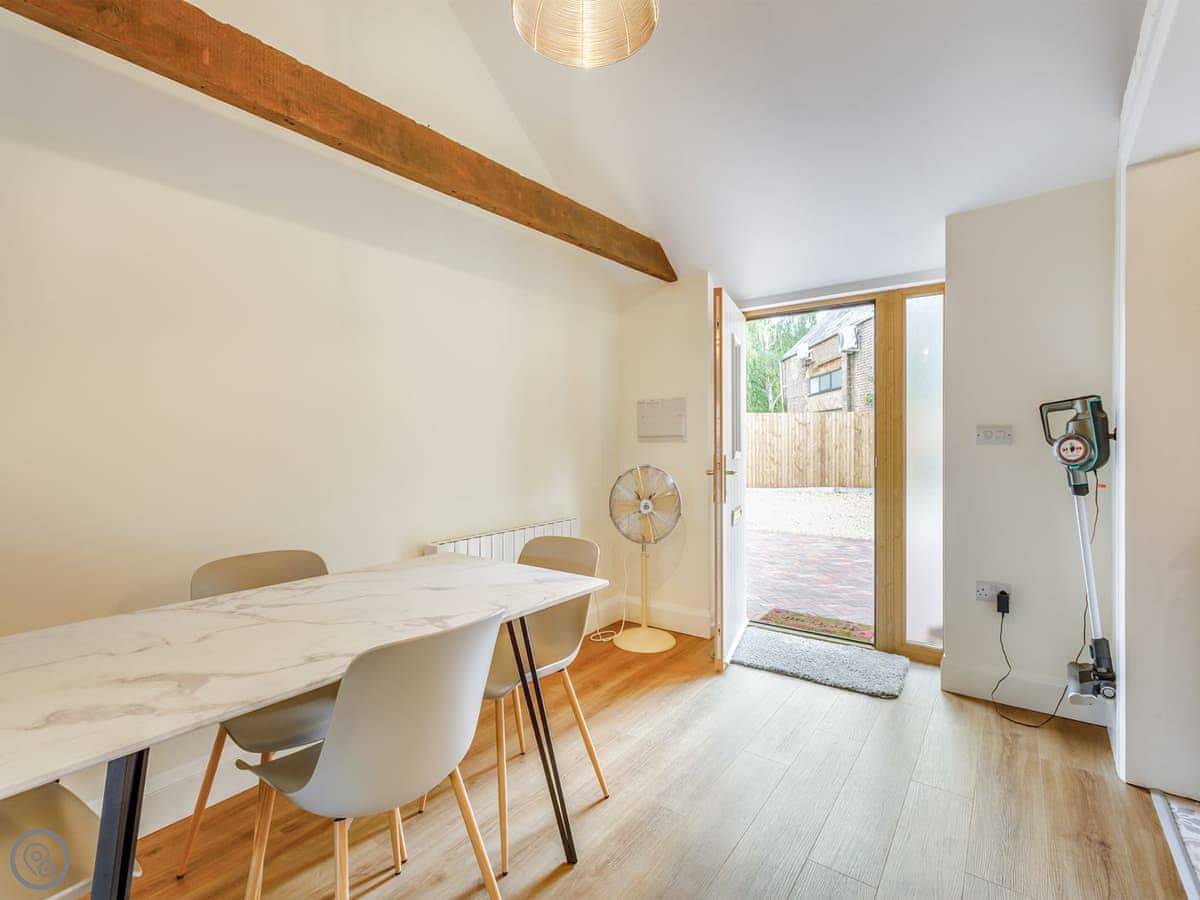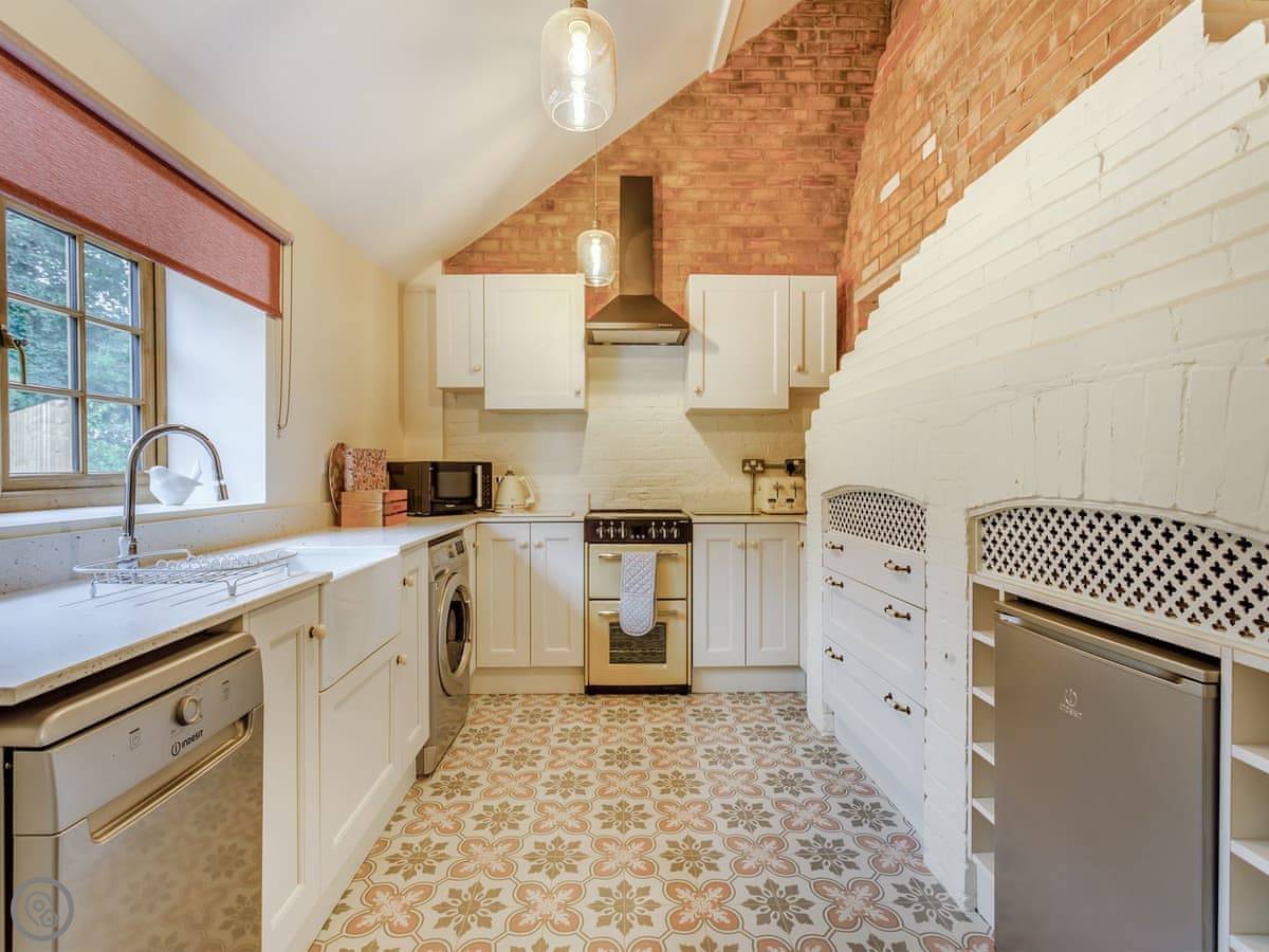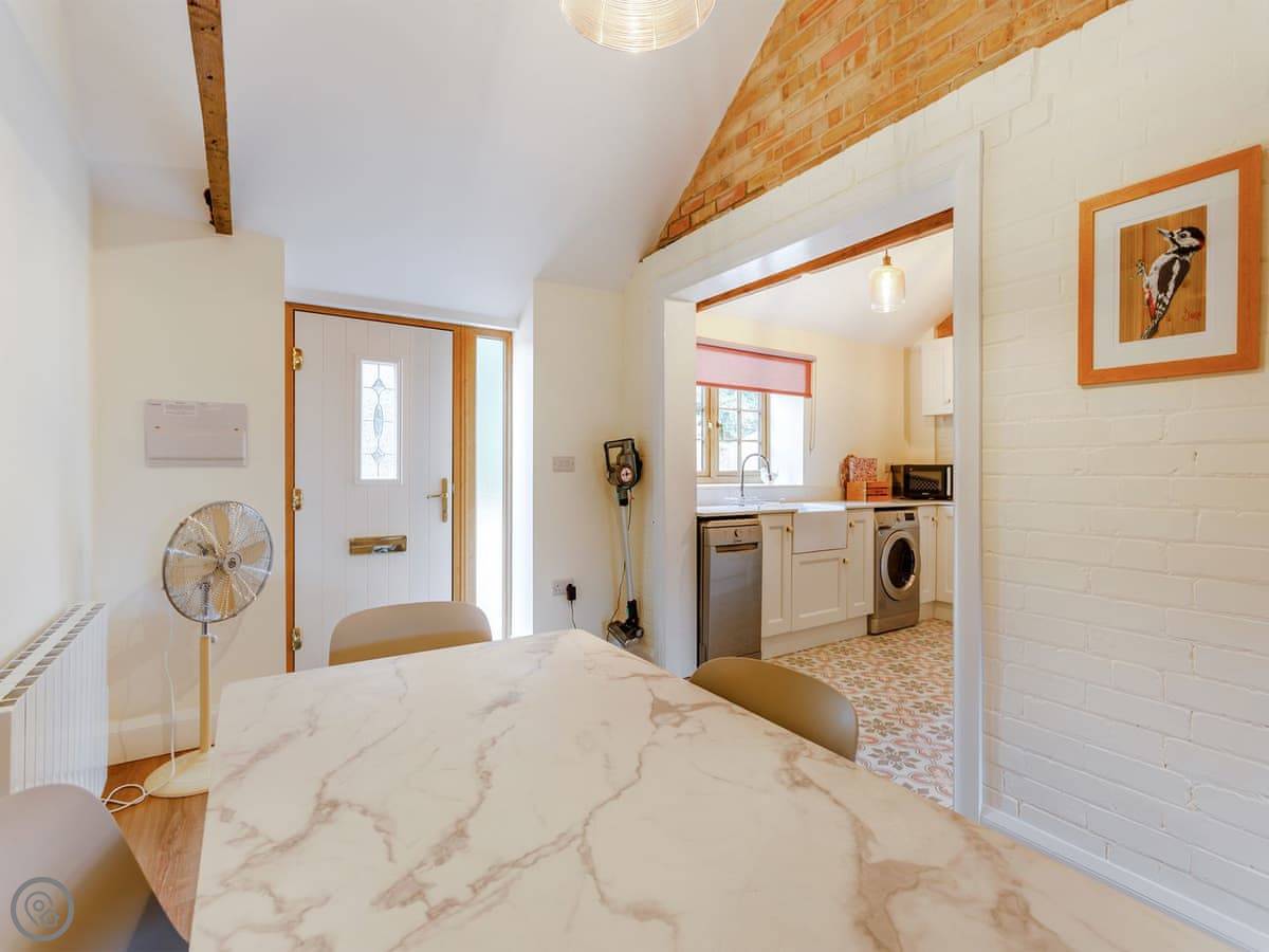 Inside, it's open plan. Exposed beams, wooden floors. There's underfloor heating, a washing machine, and a dishwasher. Wi-Fi is included.