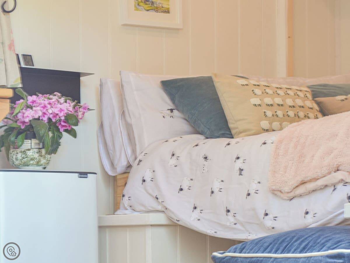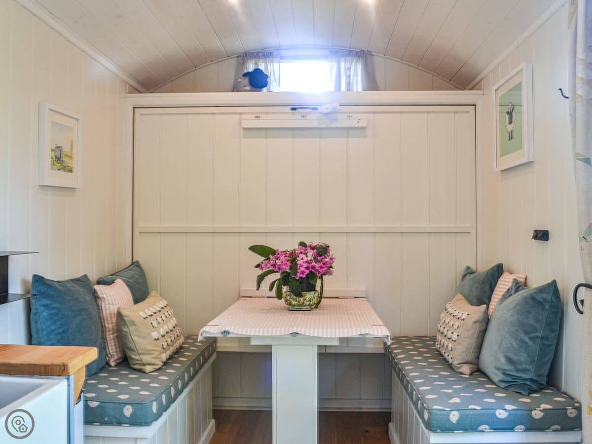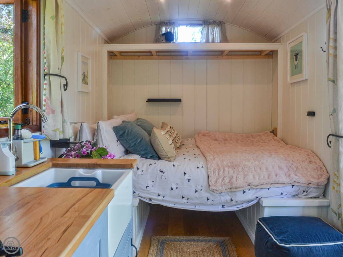 It's a glamping hut for two people. One bedroom, one bathroom. It's got a 5 Star rating, which means it's well-equipped and comfortable, but it's still a hut. It's powered by solar. You get lights, WiFi, a gas hob, and a little fridge. There's a wood burner for heat. The bed folds up against the wall to make more space for sitting.