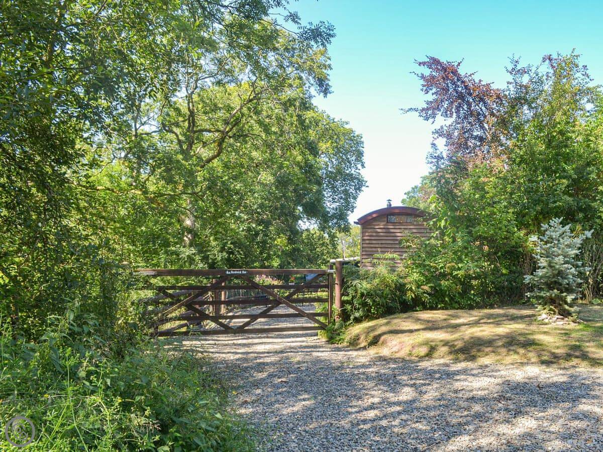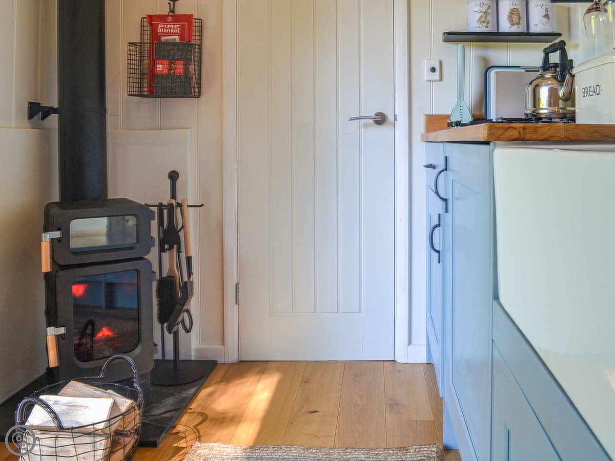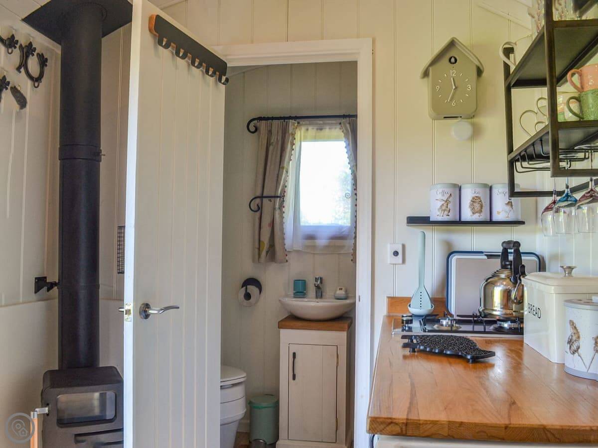It's a glamping hut for two people. One bedroom, one bathroom. It's got a 5 Star rating, which means it's well-equipped and comfortable, but it's still a hut. It's powered by solar. You get lights, WiFi, a gas hob, and a little fridge. There's a wood burner for heat. The bed folds up against the wall to make more space for sitting.