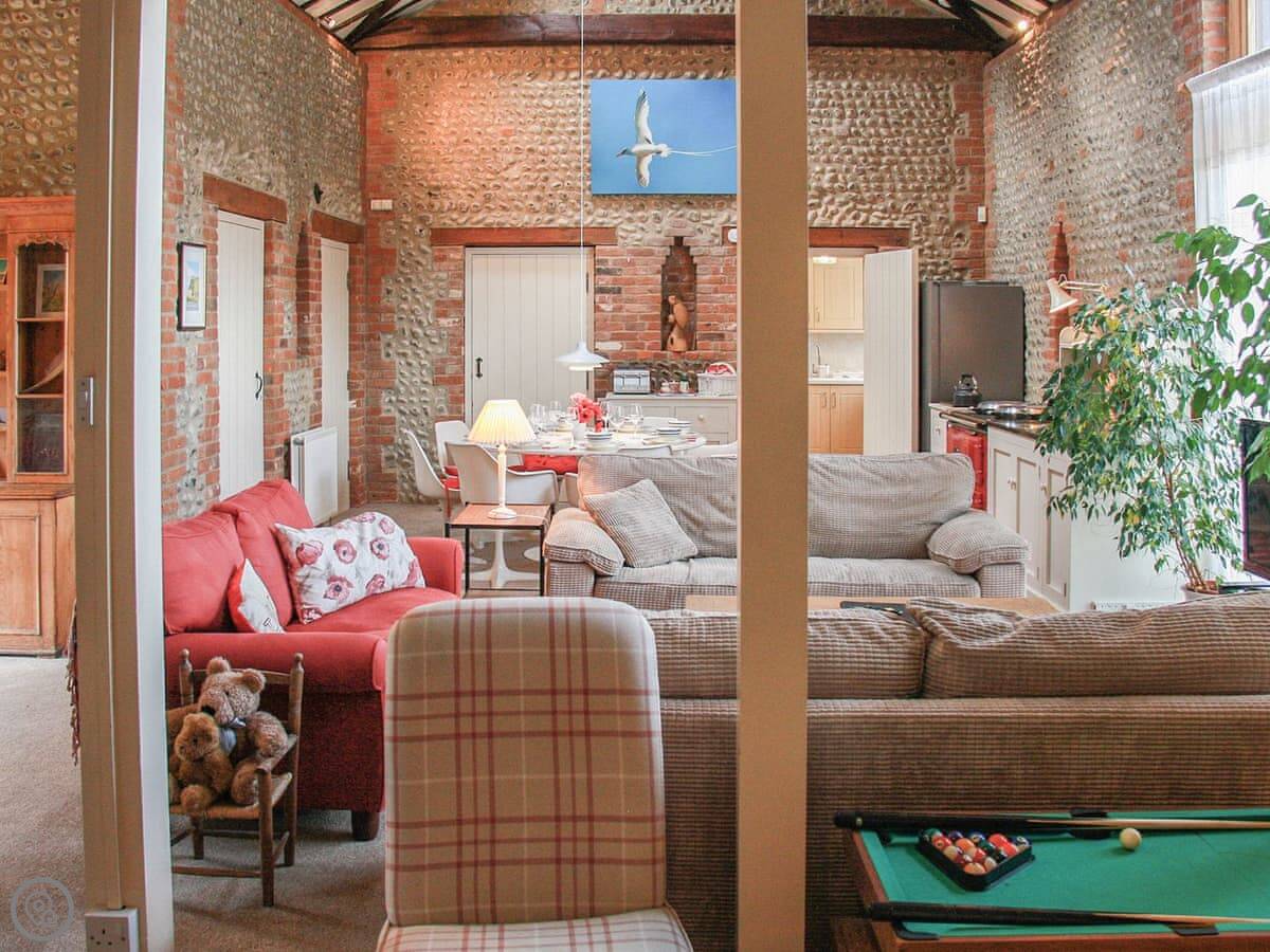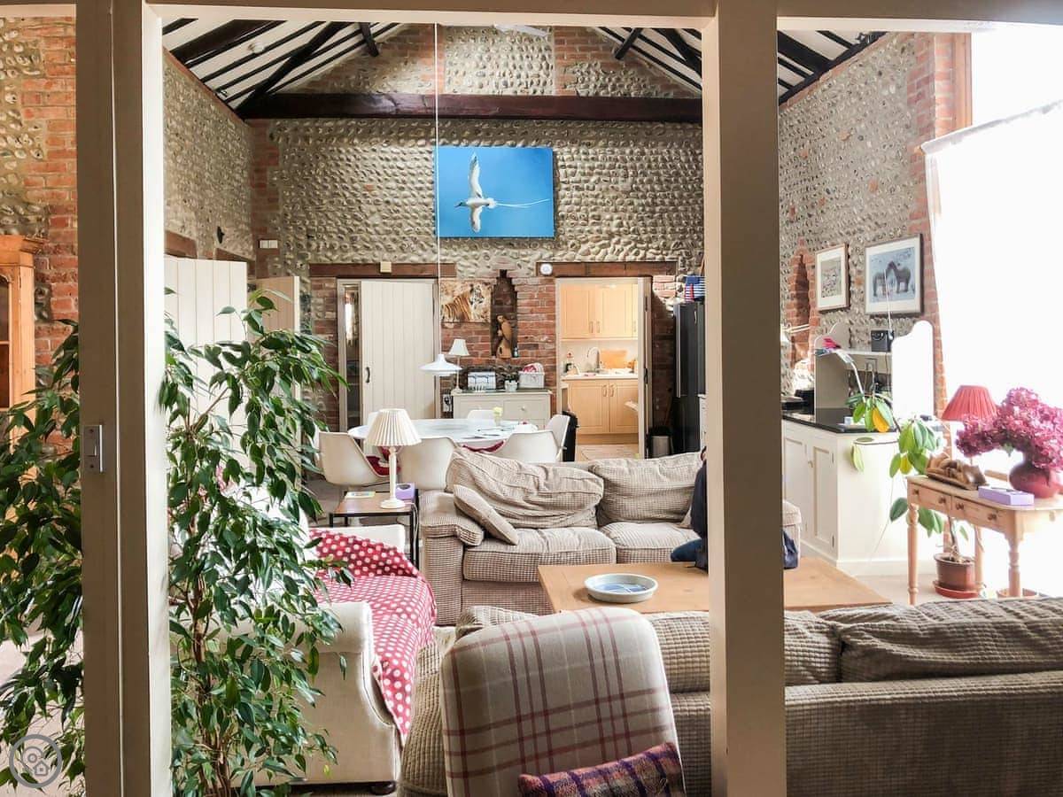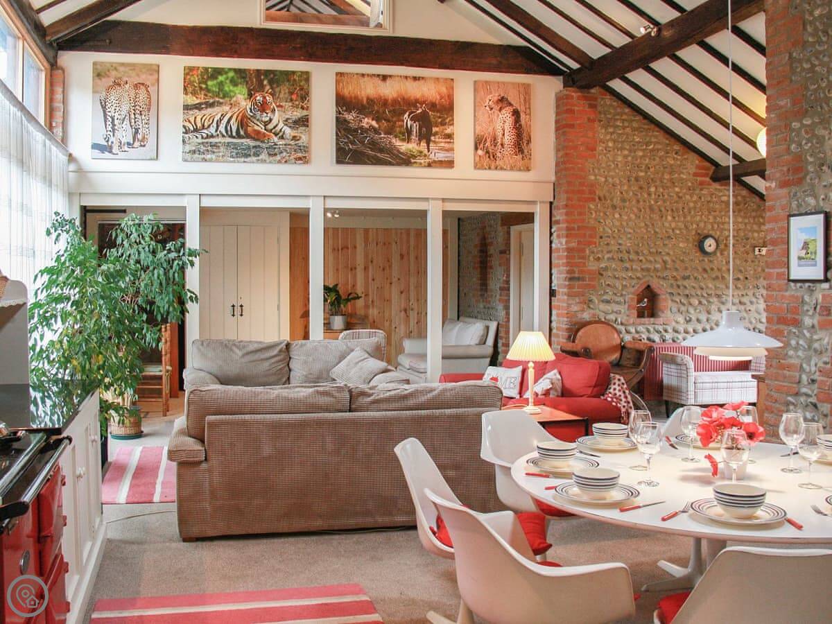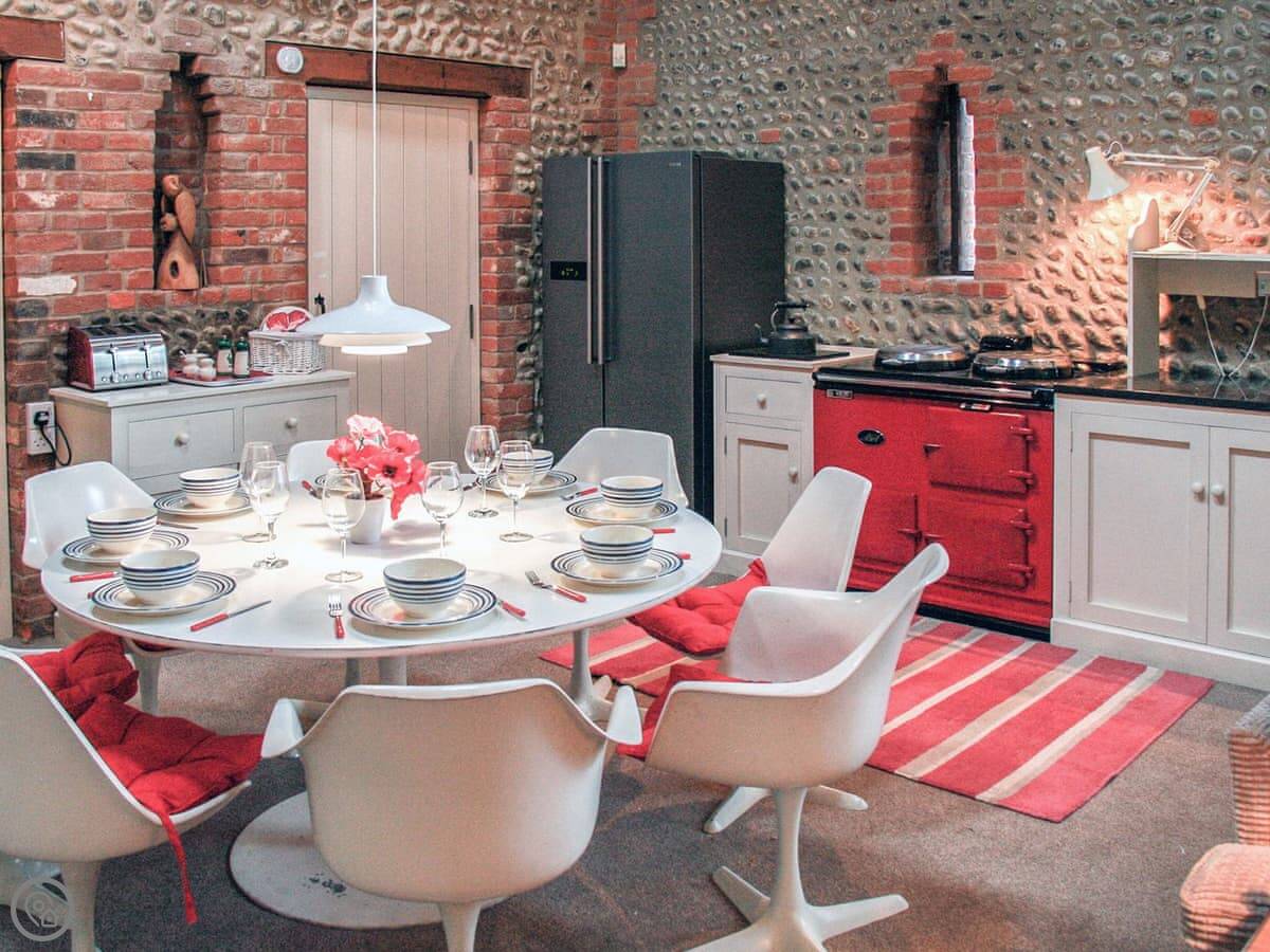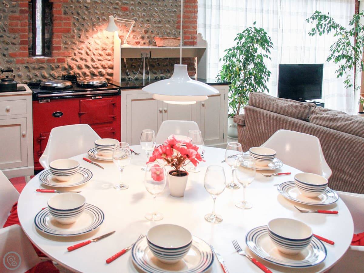 It's all open plan downstairs. The kitchen has an Aga and a normal electric cooker. The Aga is turned off in summer so it doesn't get too hot in here. There's a big round dining table and comfy sofas. Steps go out to your own enclosed garden with some seating.