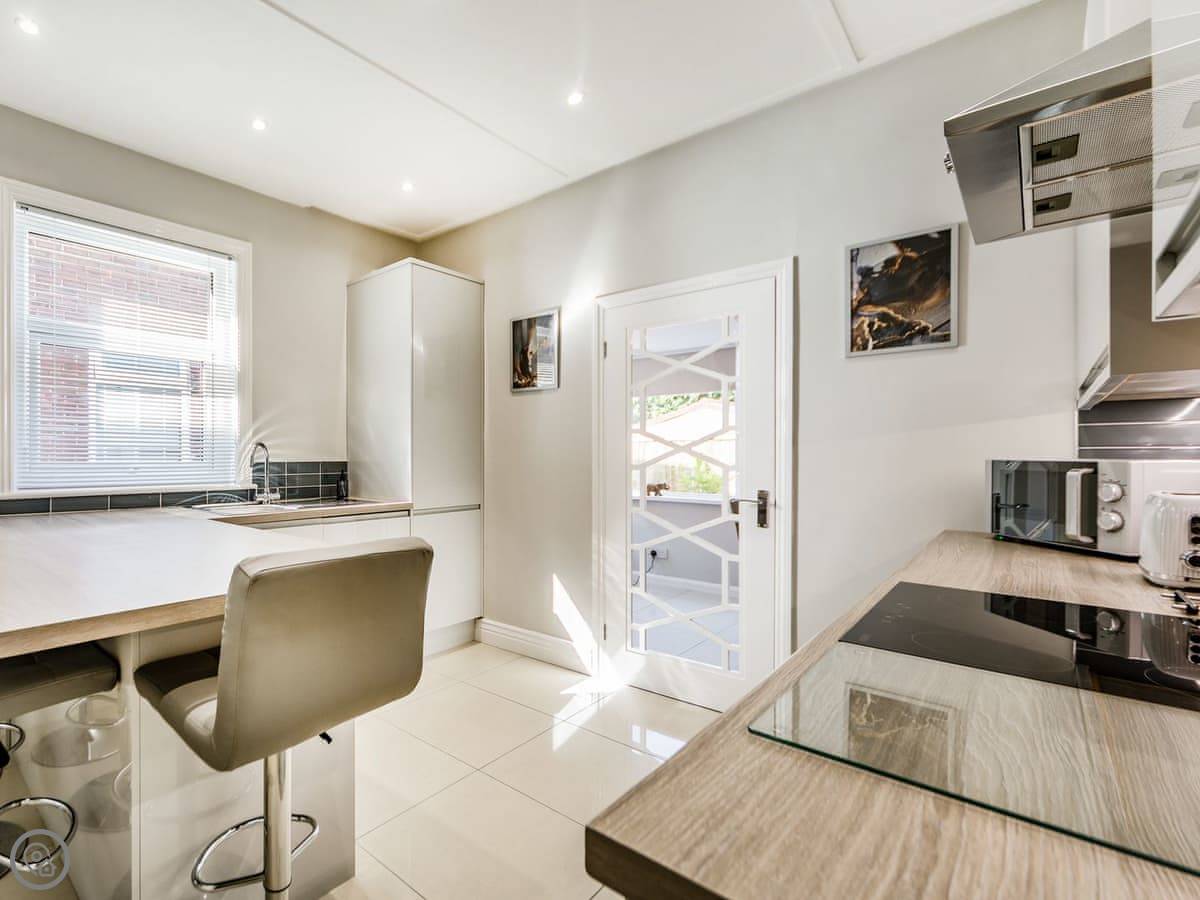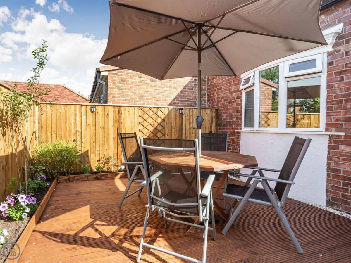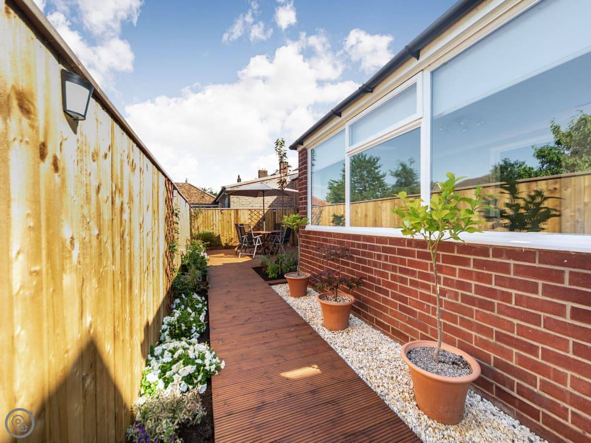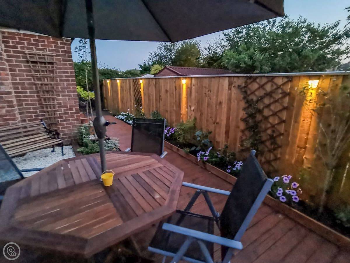The kitchen is new with a breakfast bar. The garden room has a table for eating. Outside, there's a decked area at the back. It's private, gets the sun. You can sit out there.