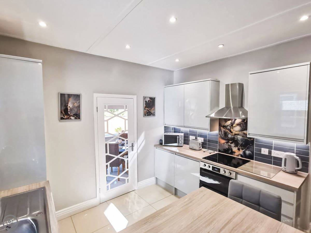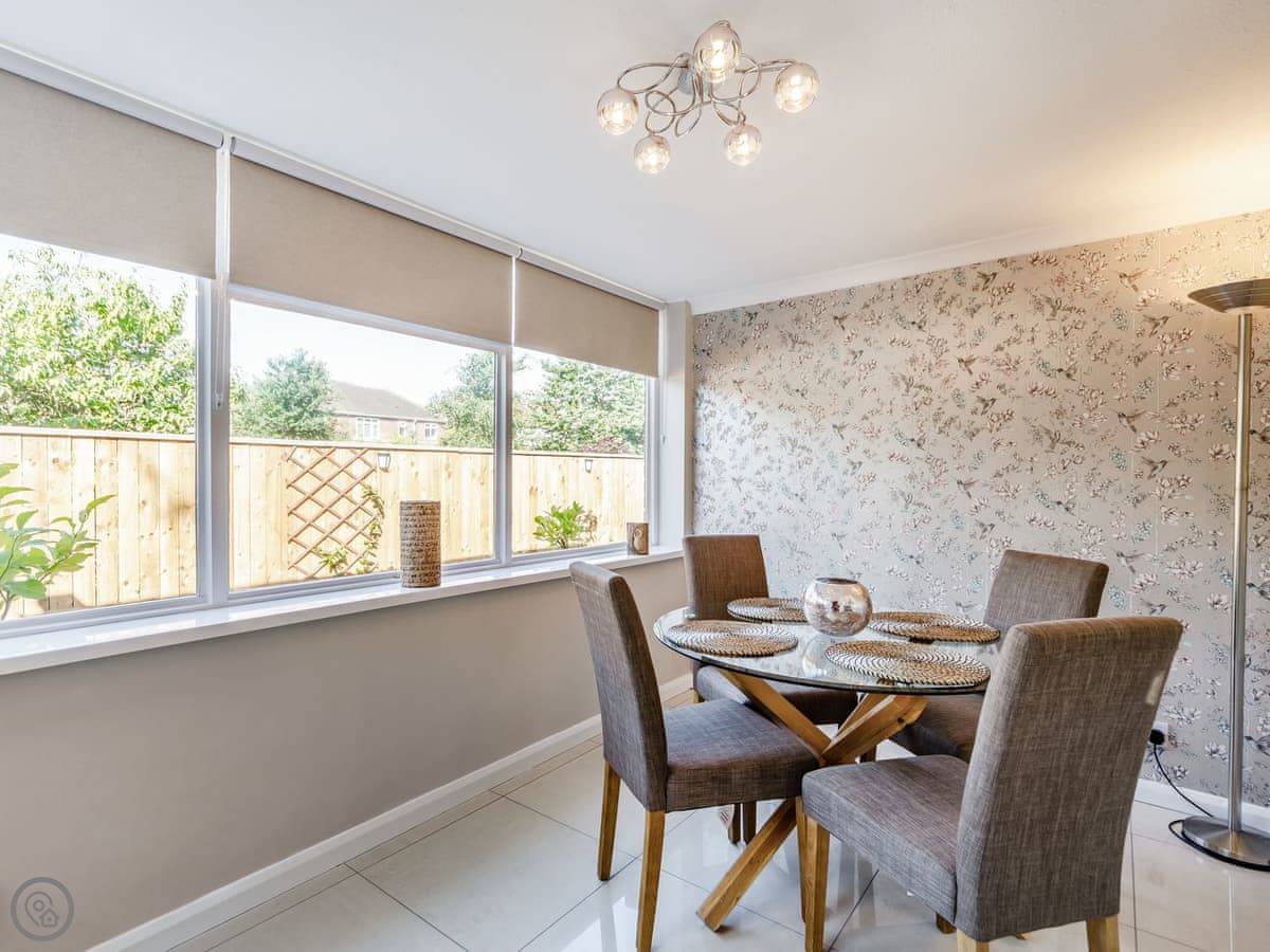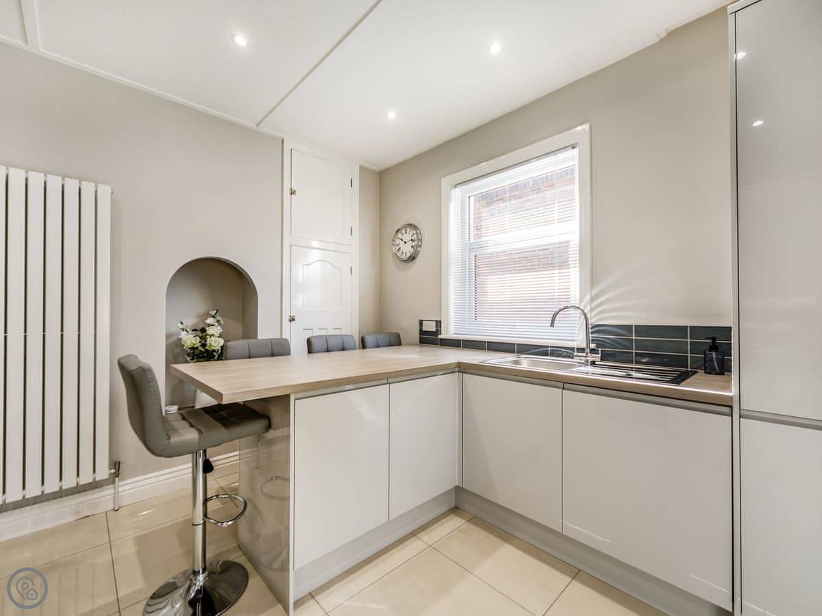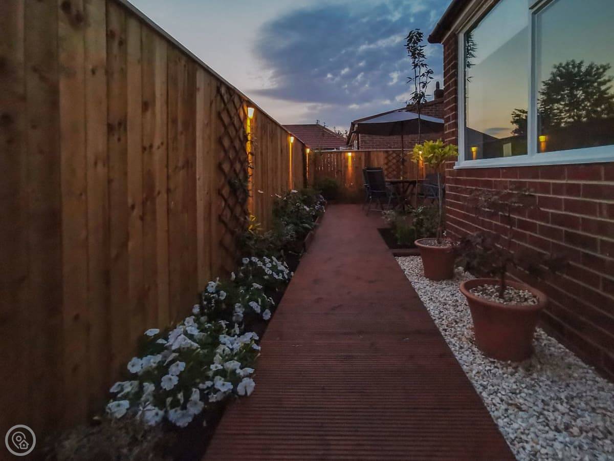 The kitchen is new with a breakfast bar. The garden room has a table for eating. Outside, there's a decked area at the back. It's private, gets the sun. You can sit out there.