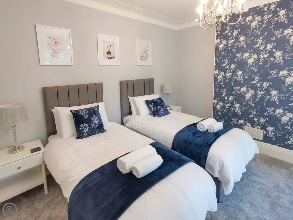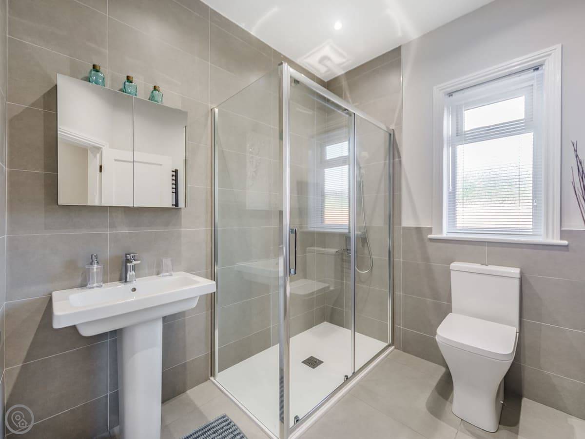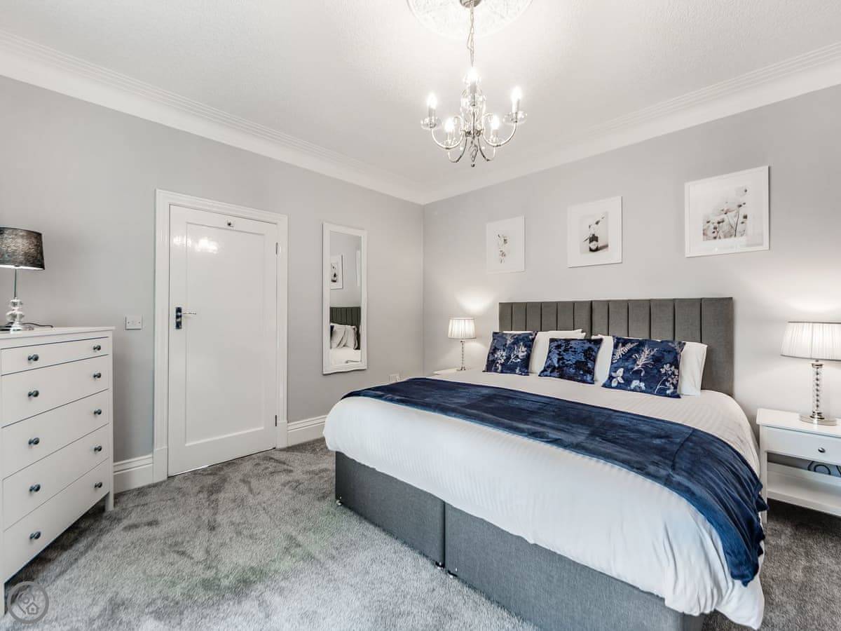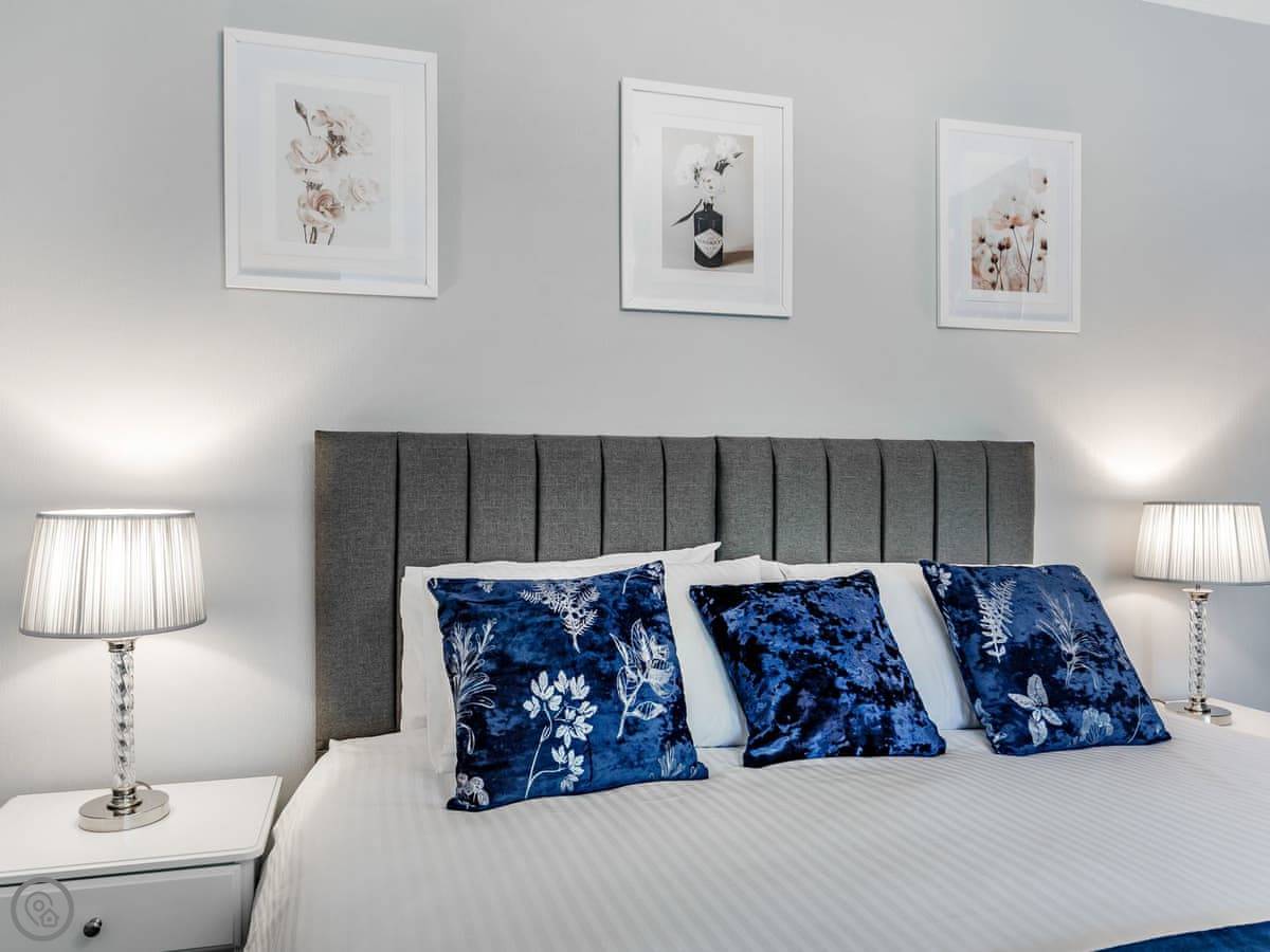 It's got two bedrooms. One super king bed, one king bed. Both rooms are a decent size. The bathroom has a walk-in shower, no bath.