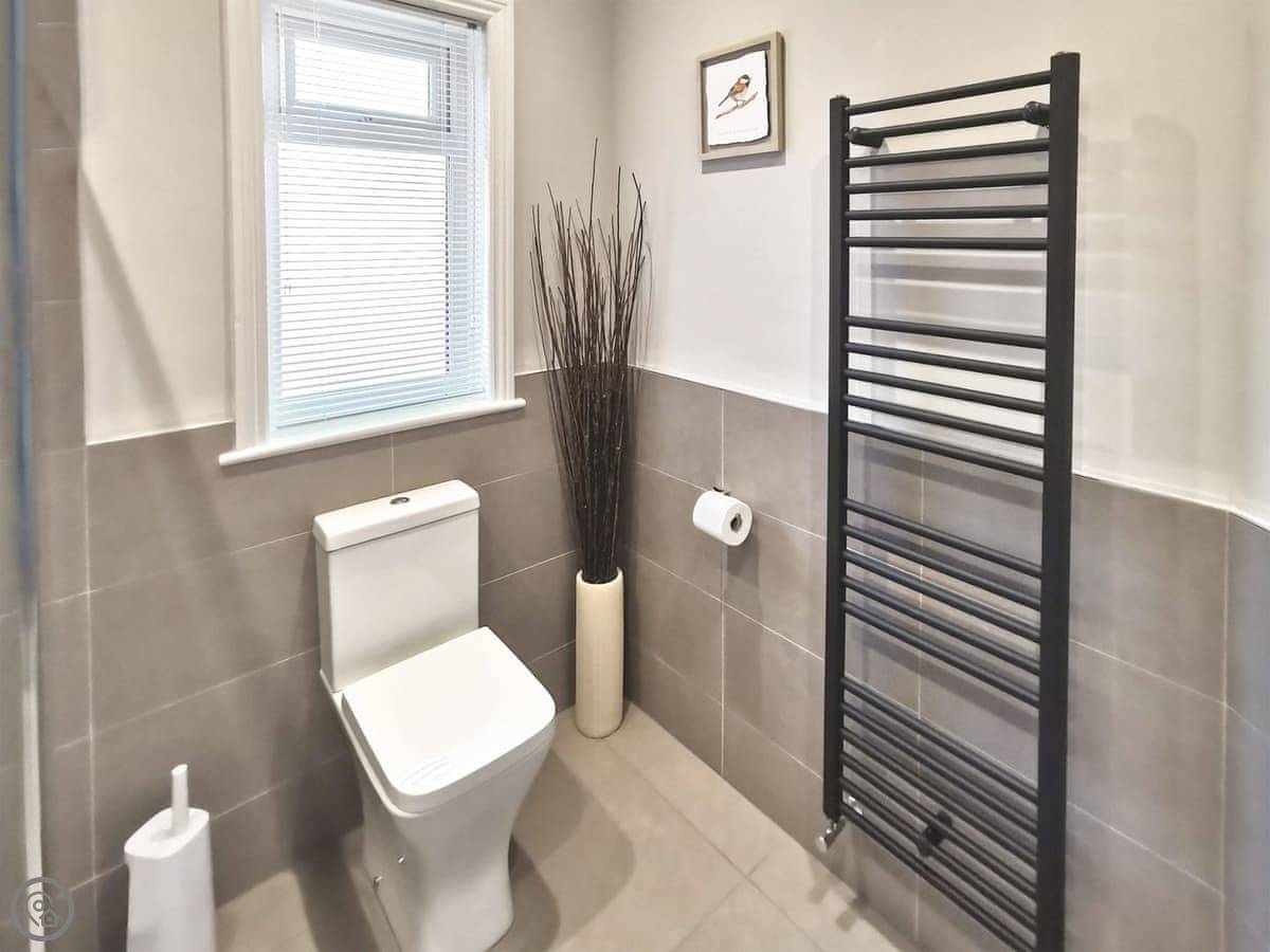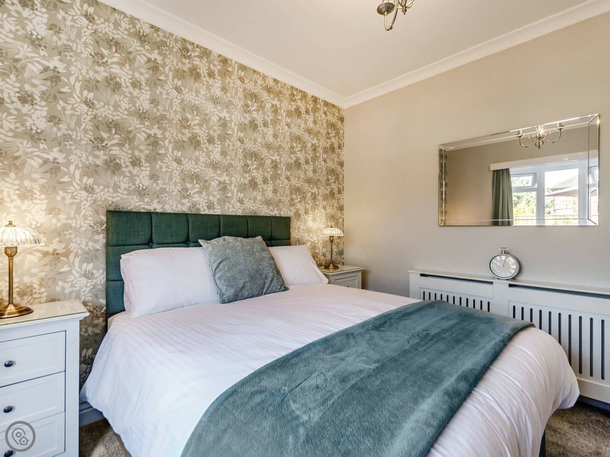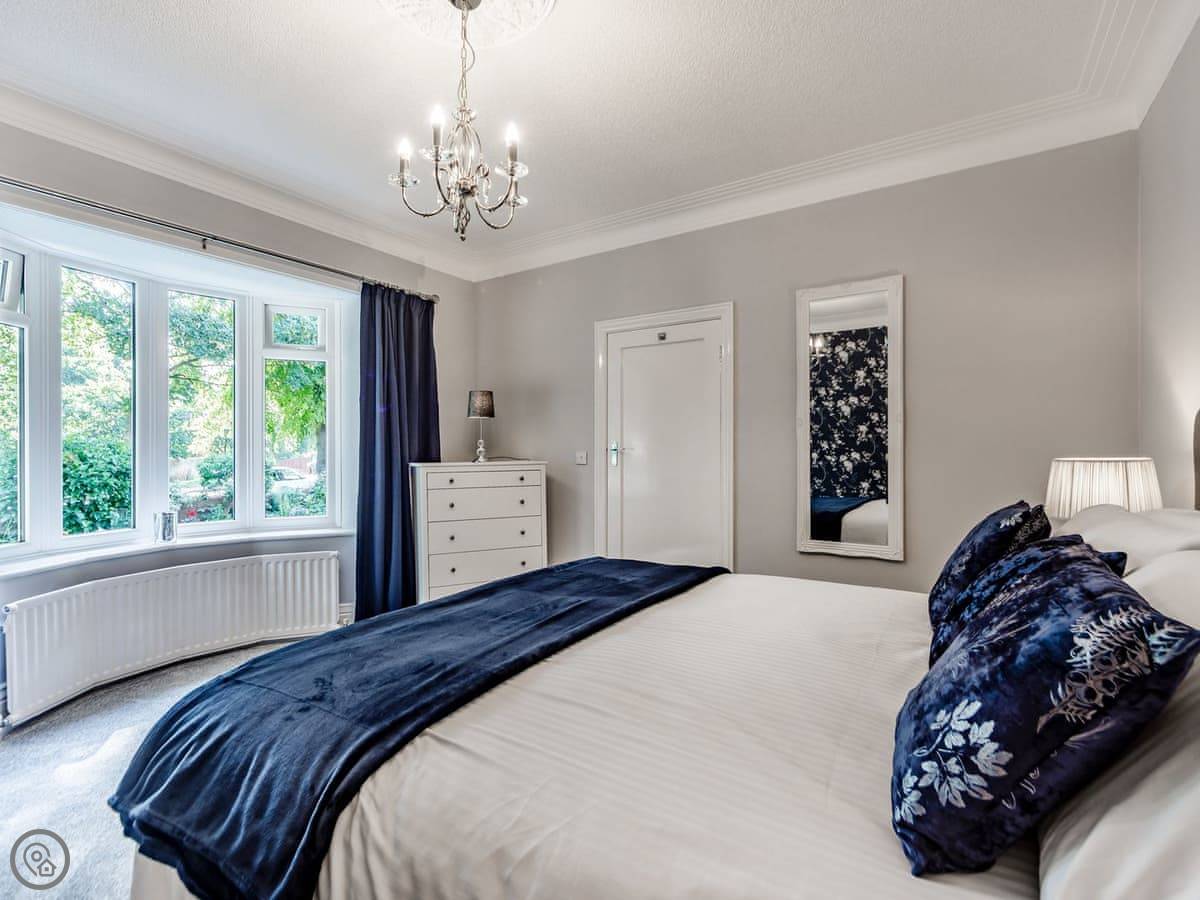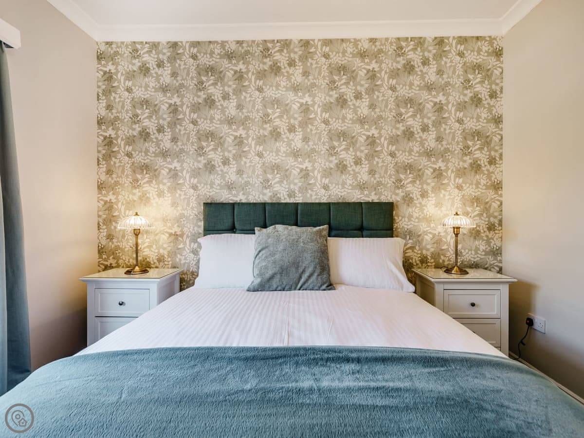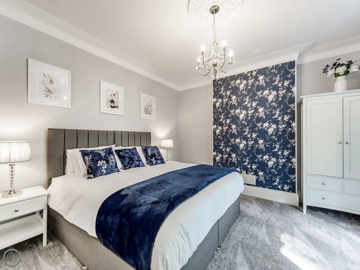 It's got two bedrooms. One super king bed, one king bed. Both rooms are a decent size. The bathroom has a walk-in shower, no bath.