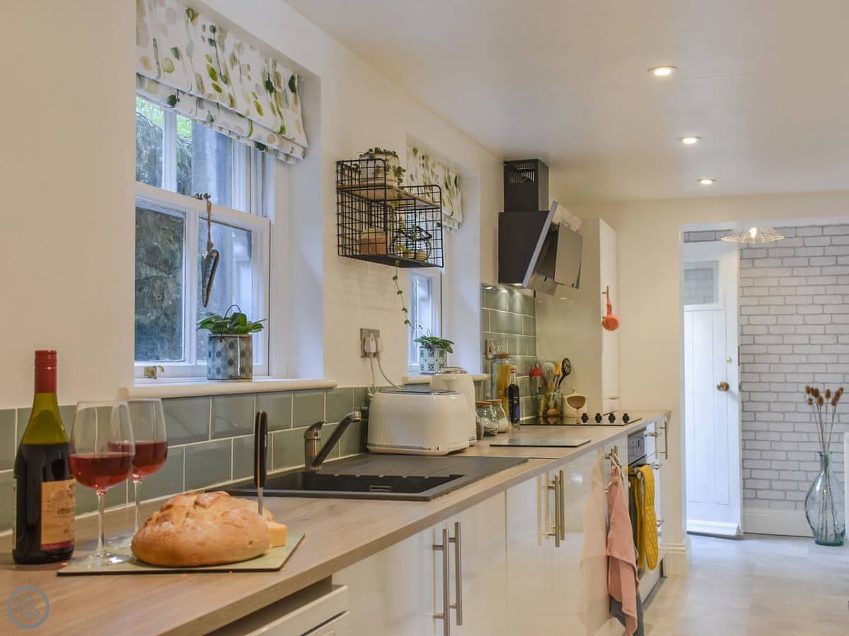 Downstairs is open plan. Living room with a dining area and a gas stove. The kitchen is through an archway. It's modern and has everything, including a dishwasher. It's a 4 Star place, which means it's comfortable and well kept.