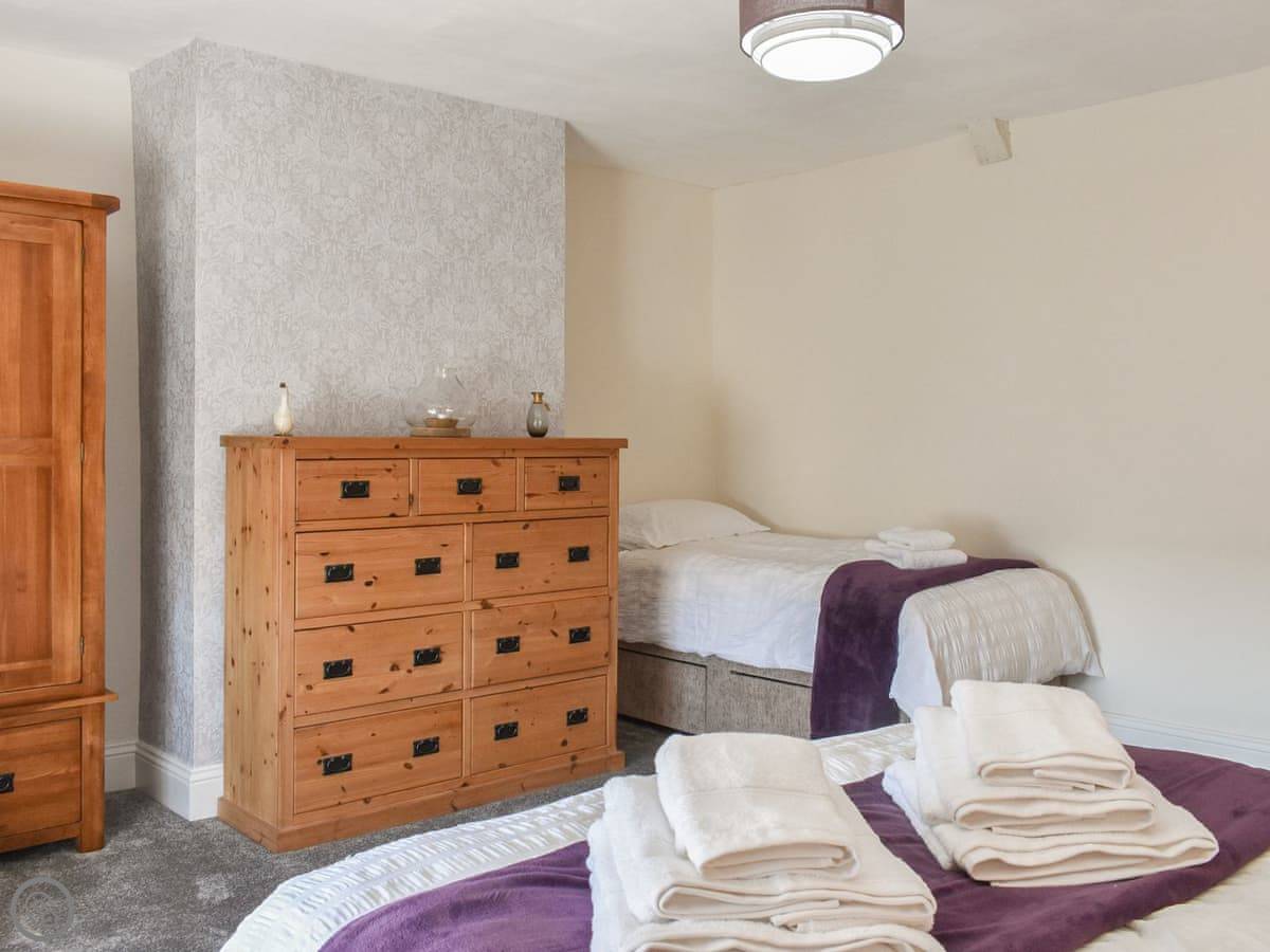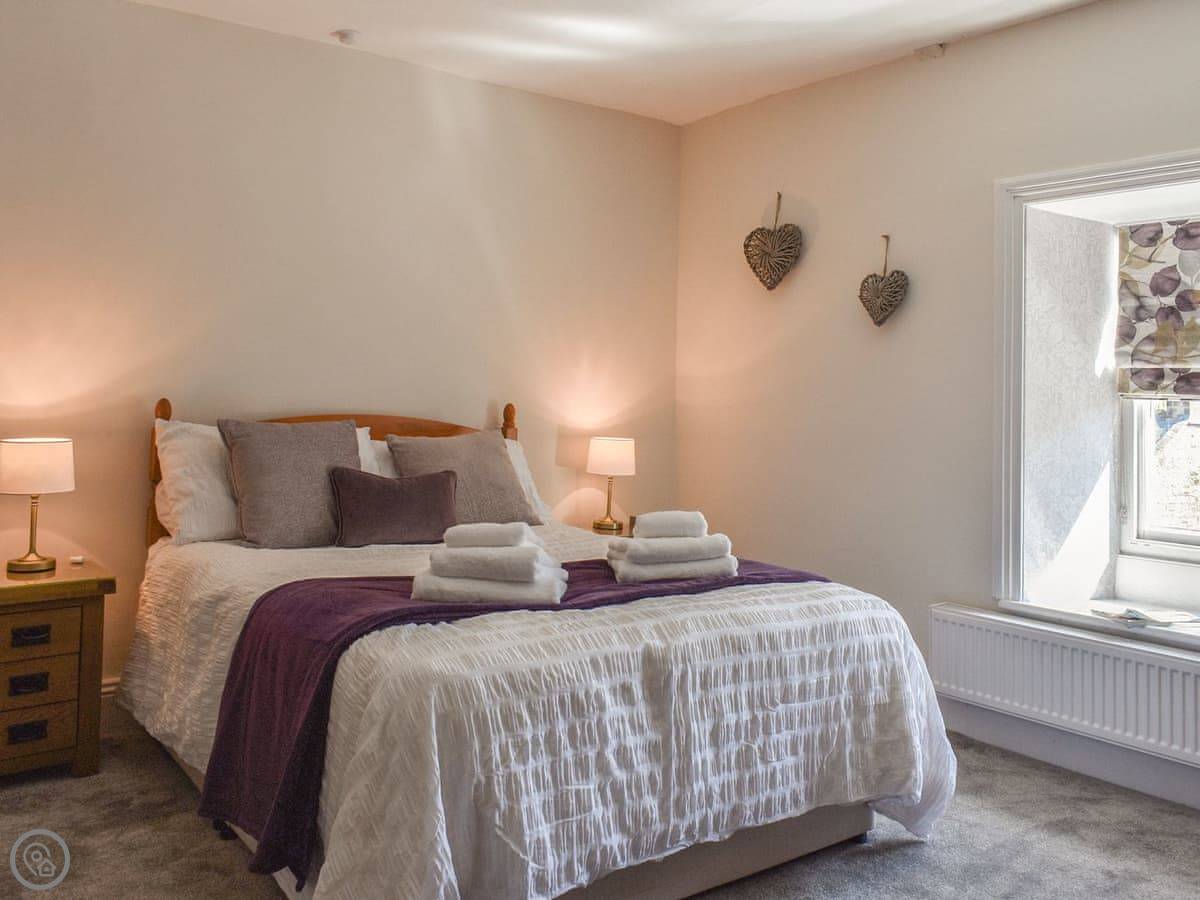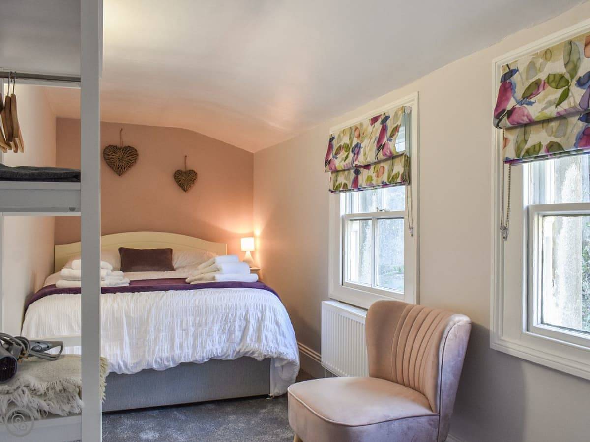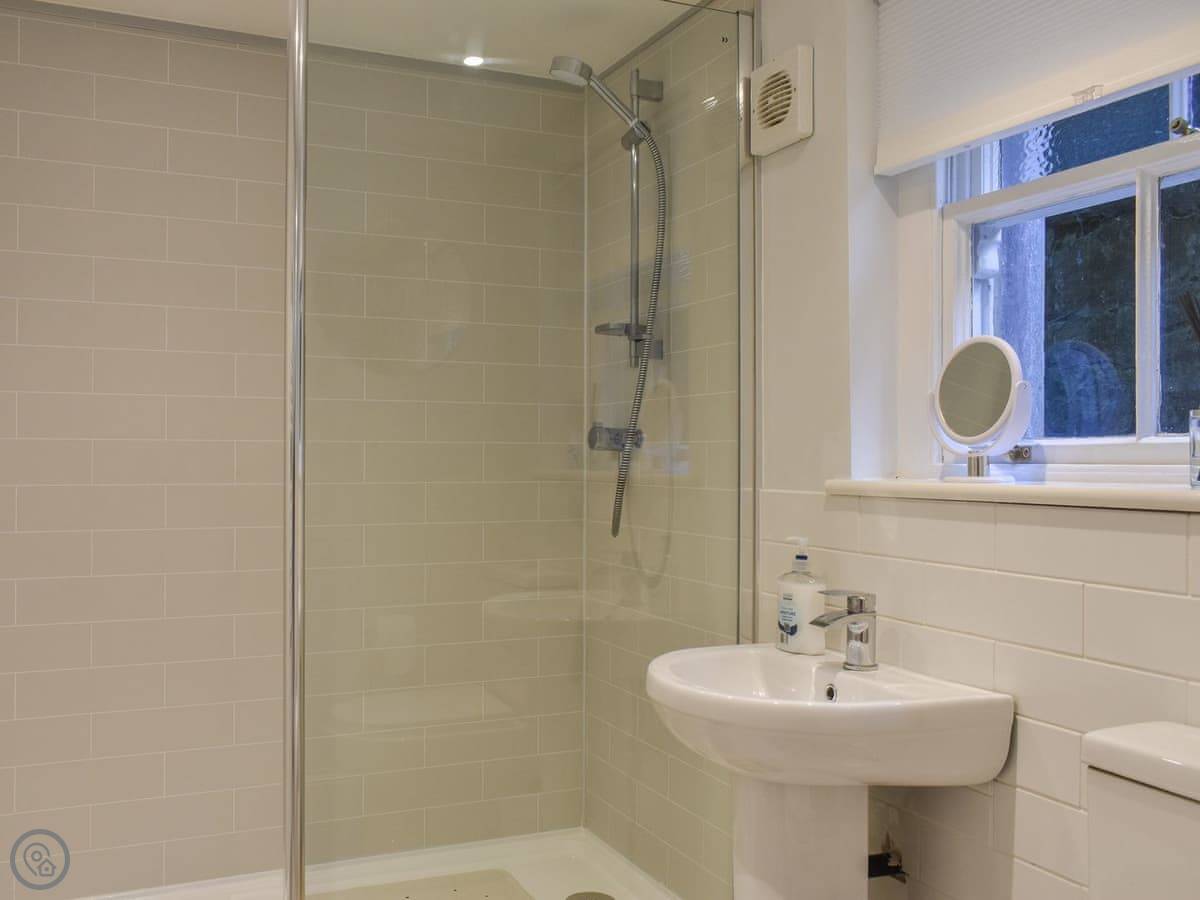 It sleeps four. Two bedrooms upstairs, both a good size. There's a bathroom with a walk-in shower downstairs, and a separate toilet upstairs. The stairs are wide, not steep like some places.