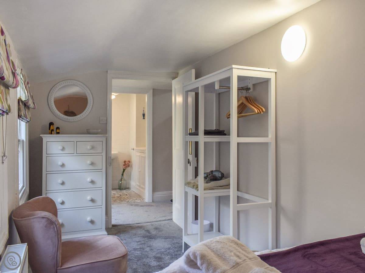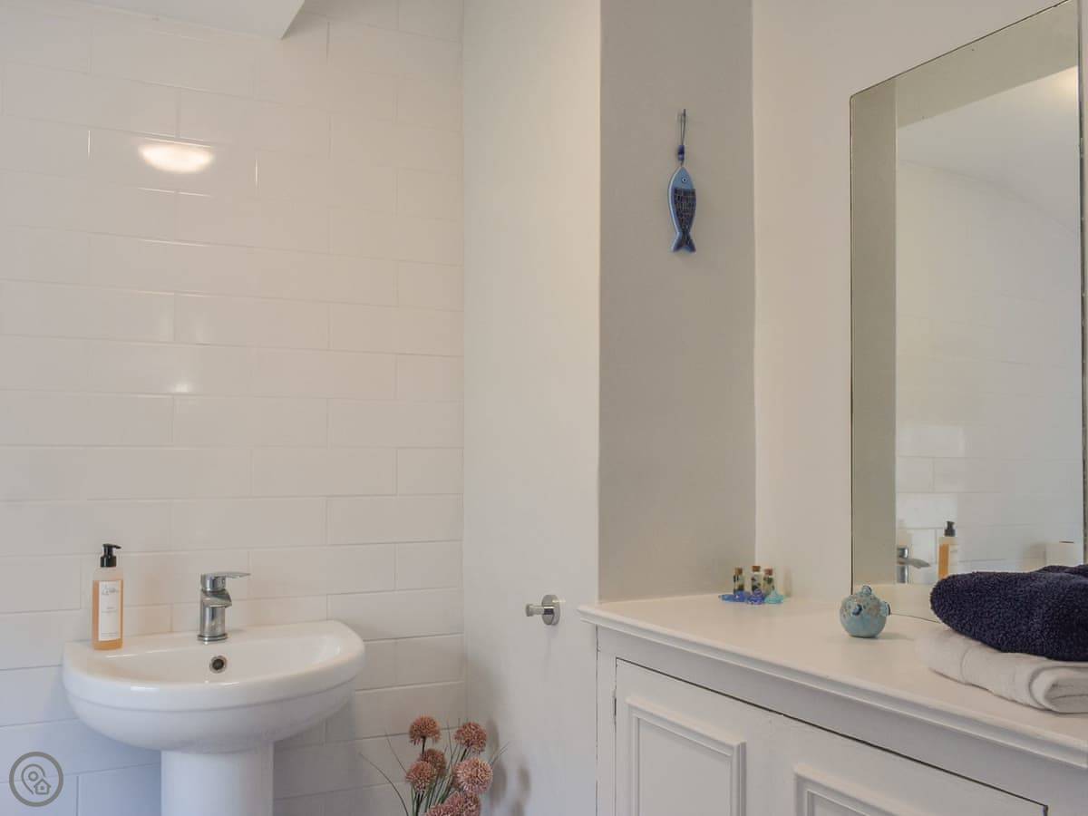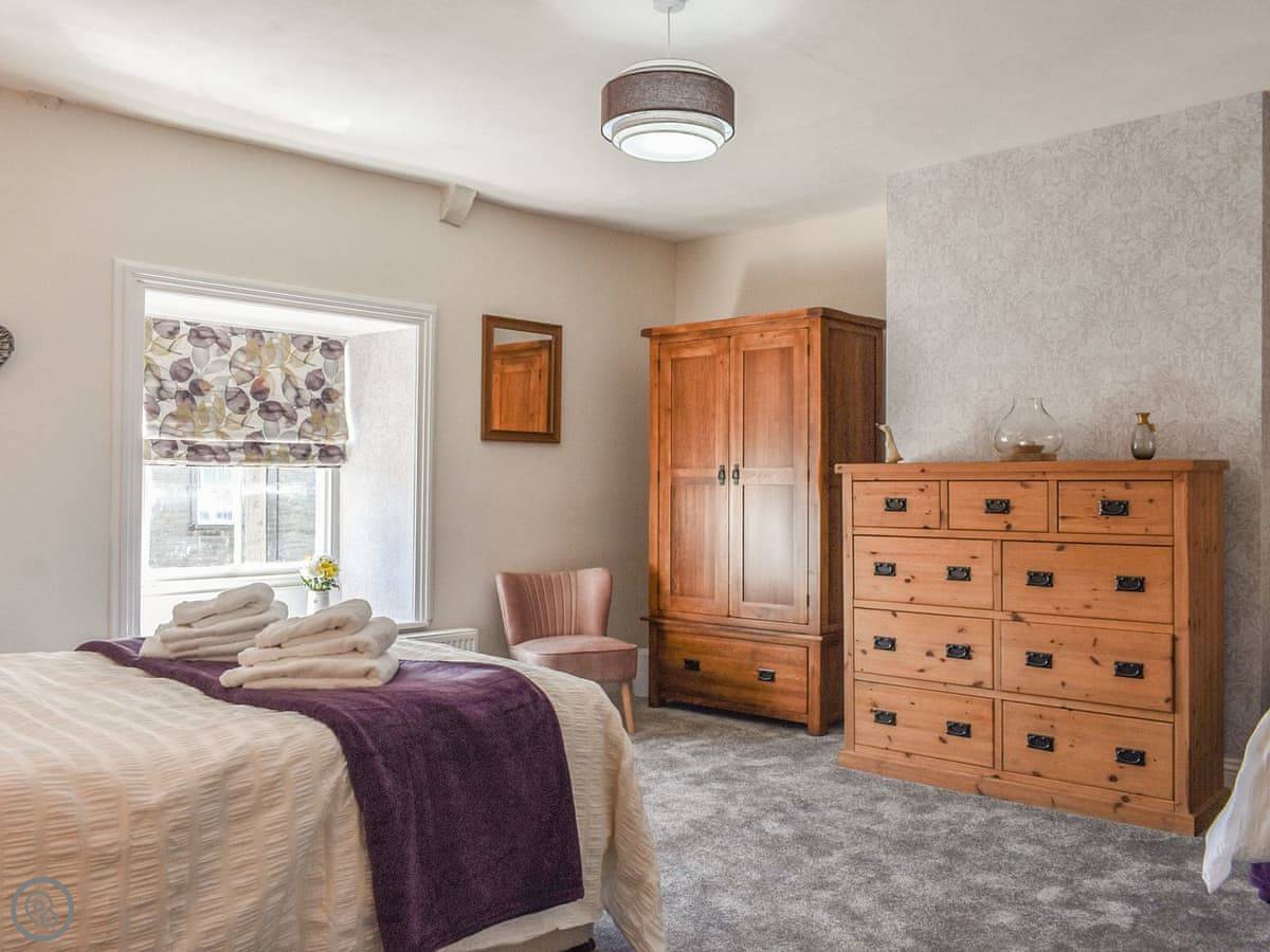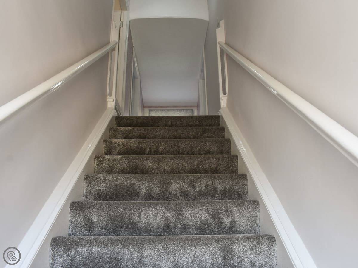 It sleeps four. Two bedrooms upstairs, both a good size. There's a bathroom with a walk-in shower downstairs, and a separate toilet upstairs. The stairs are wide, not steep like some places.