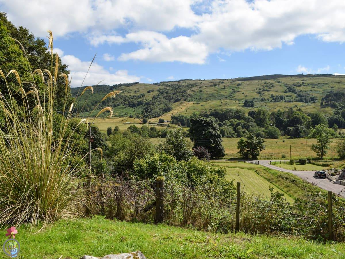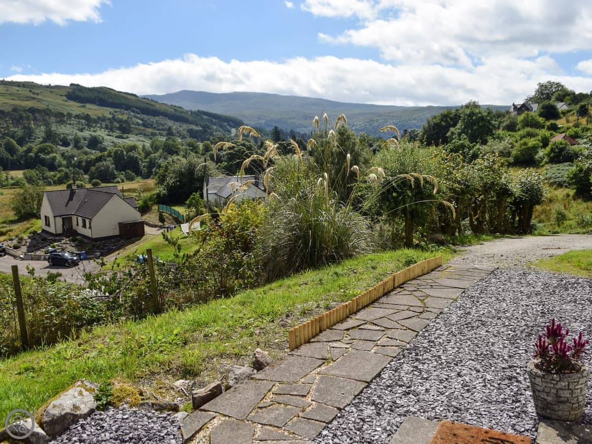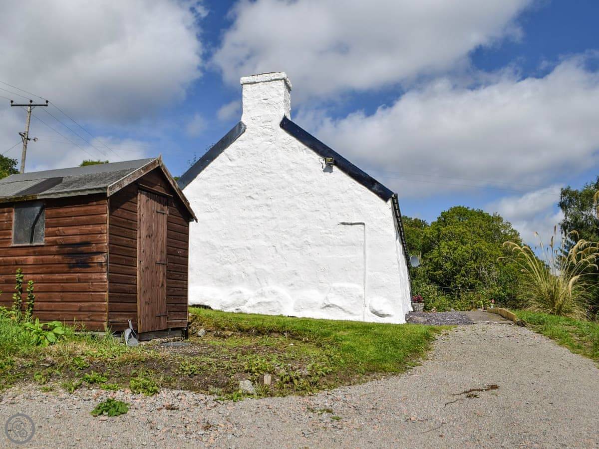 The cottage was a blackhouse, which is the old sort of crofter’s cottage. It’s been done up inside. There’s a wood-burning stove for heat and atmosphere. Outside, there’s a patio area with seating and a barbecue. The views from the garden are over the glen. There’s a shed for storing bikes or wet outdoor gear.