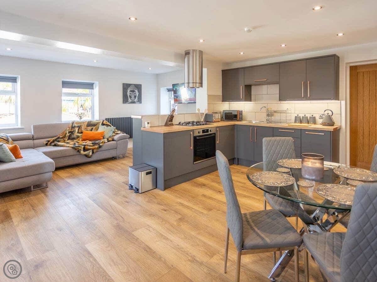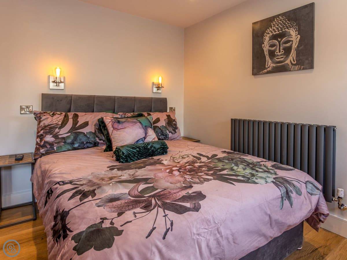 It sleeps four, but the second bed is a sofa bed in the living area. There's one proper bedroom with a double bed. Everything's on one level, and the doorways are wide enough for a wheelchair. It's all self-contained with its own front door.