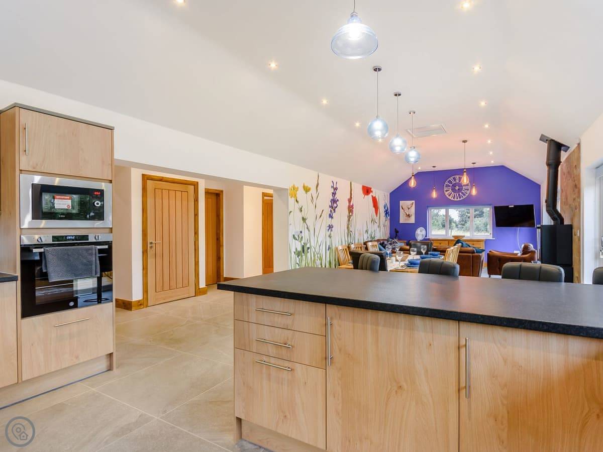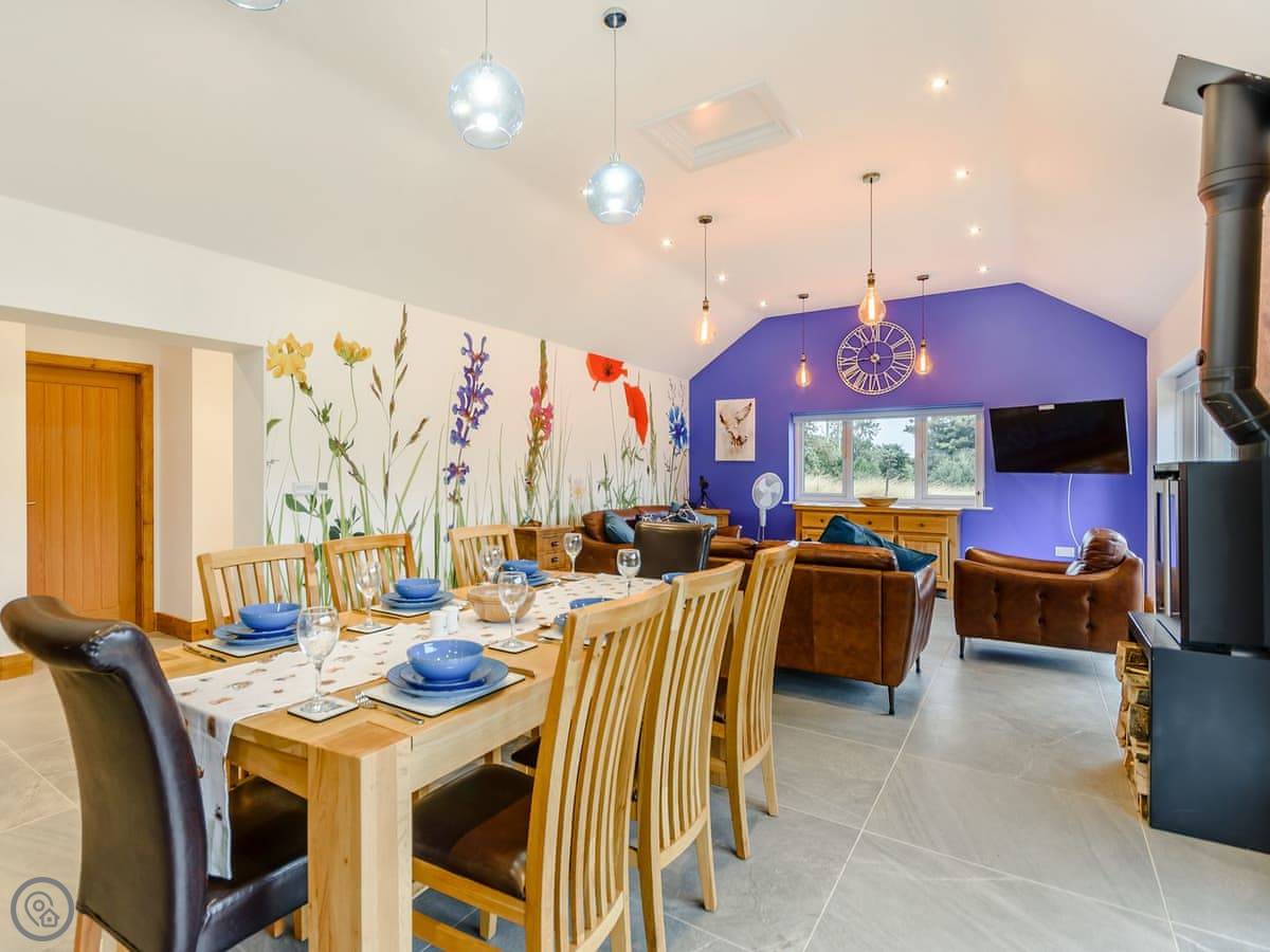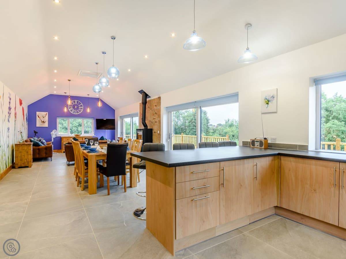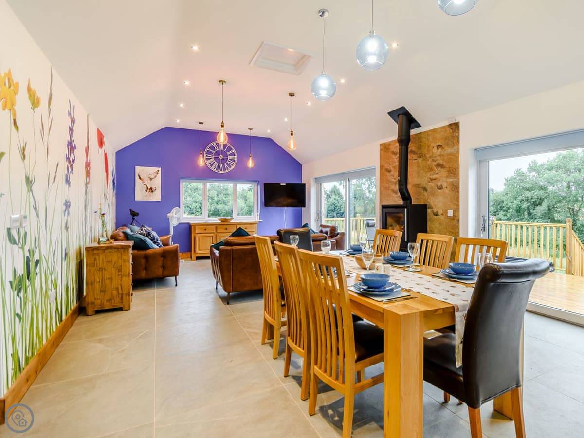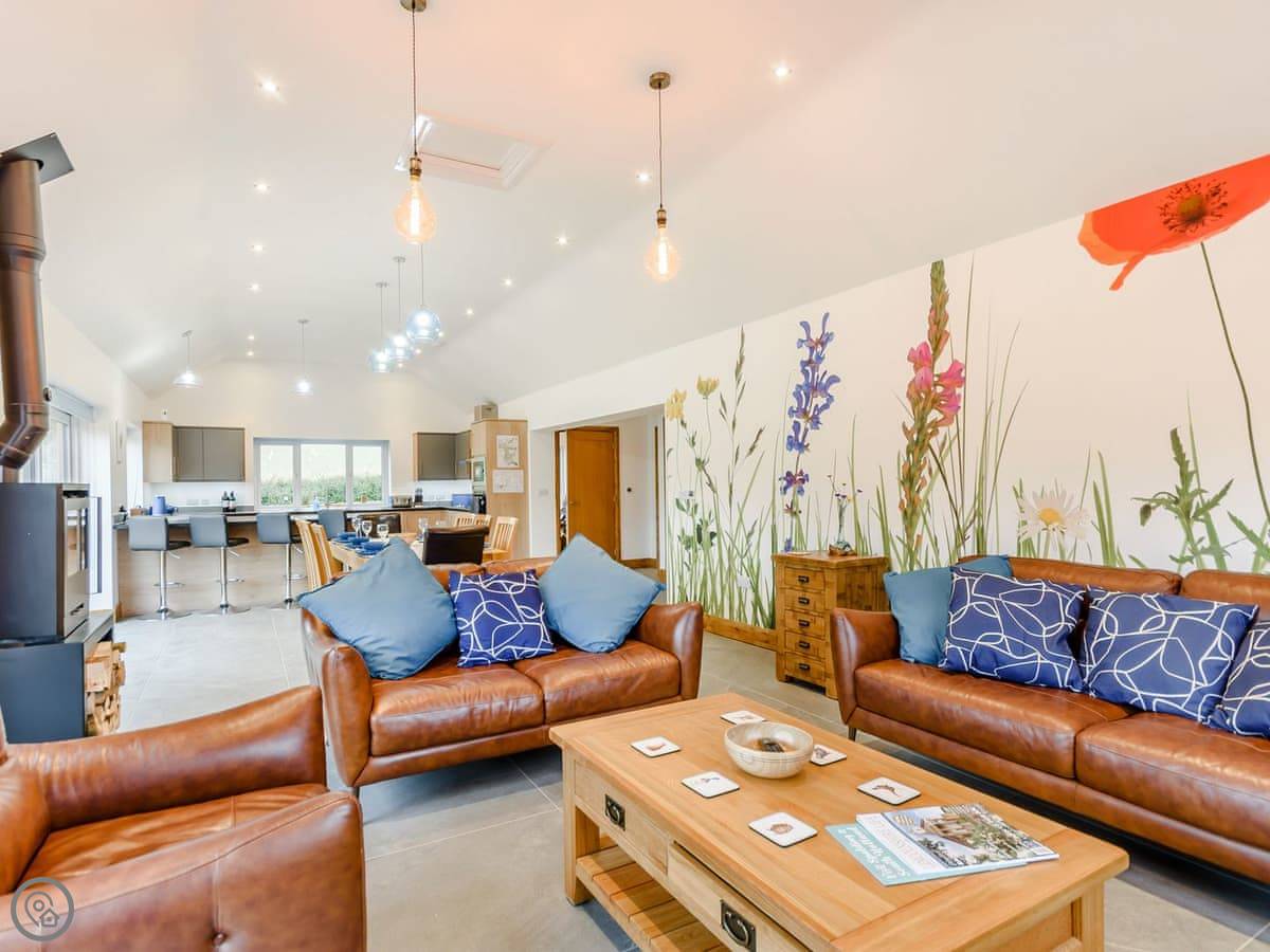 The main living space is open plan. It has a wood burner. The views from the front are over fields to an old windmill. From the back, you look out across the Wolds.
