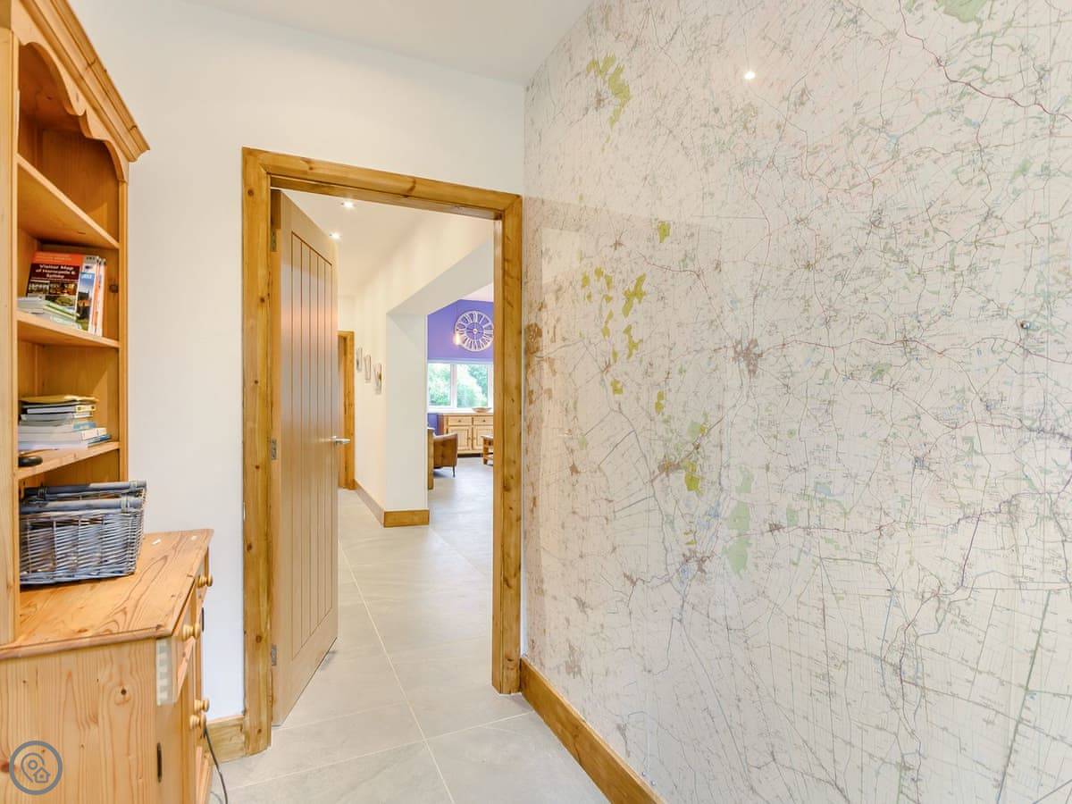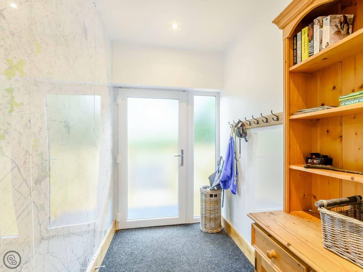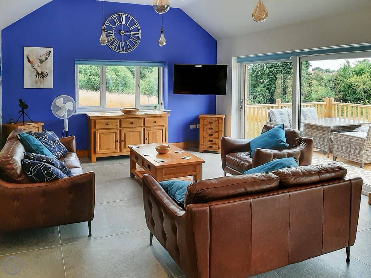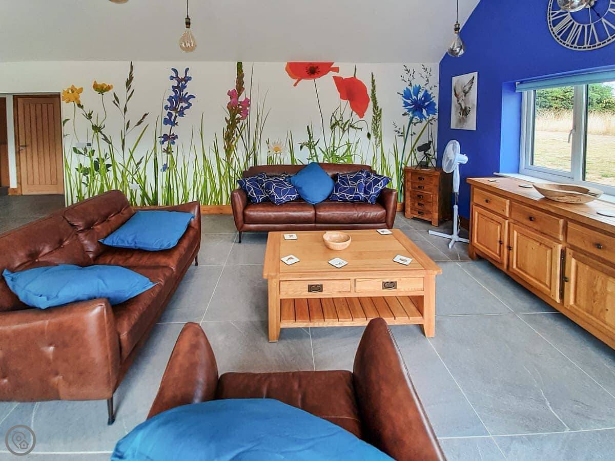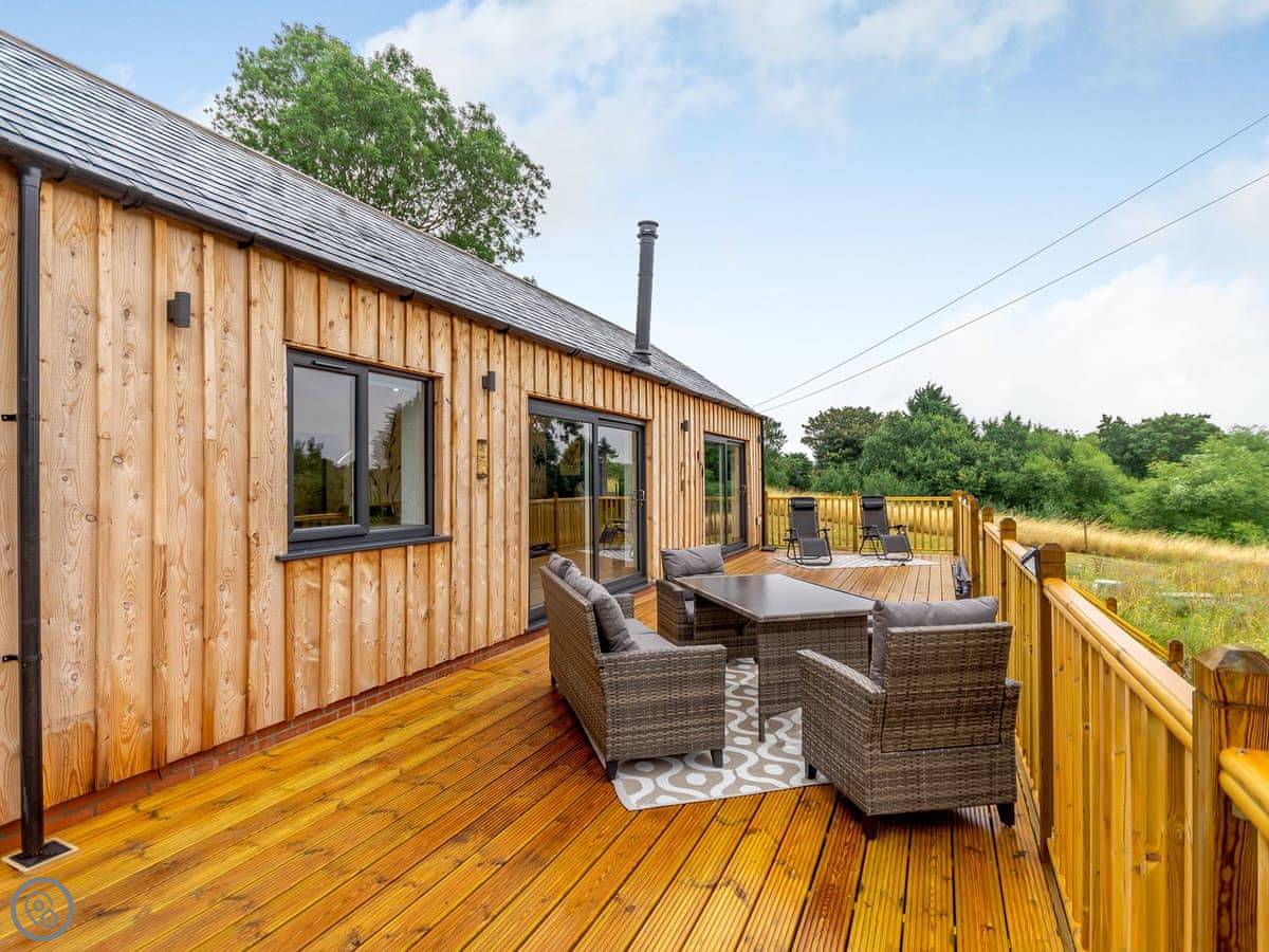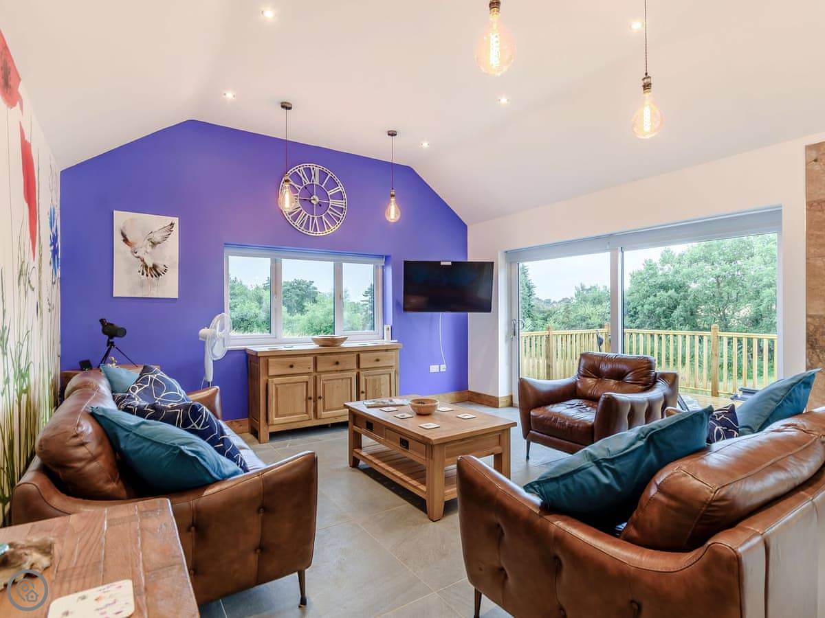 The main living space is open plan. It has a wood burner. The views from the front are over fields to an old windmill. From the back, you look out across the Wolds.