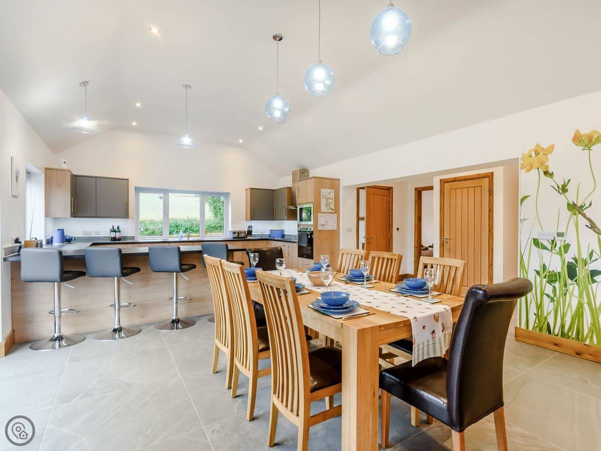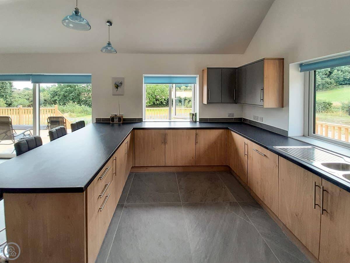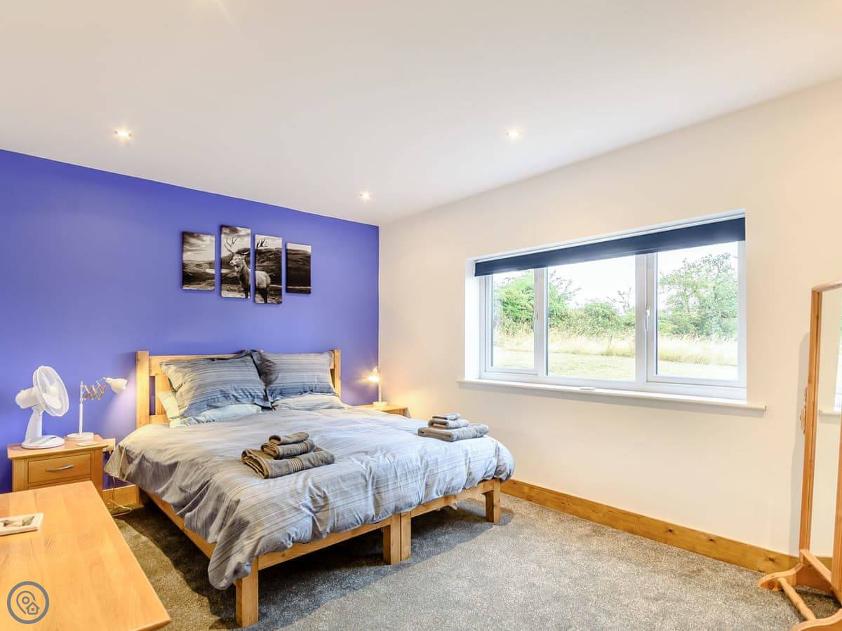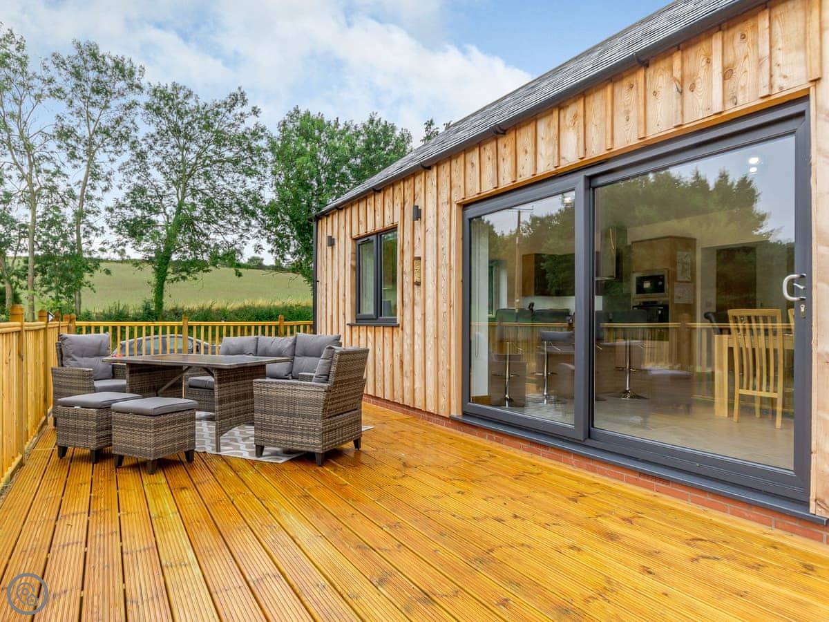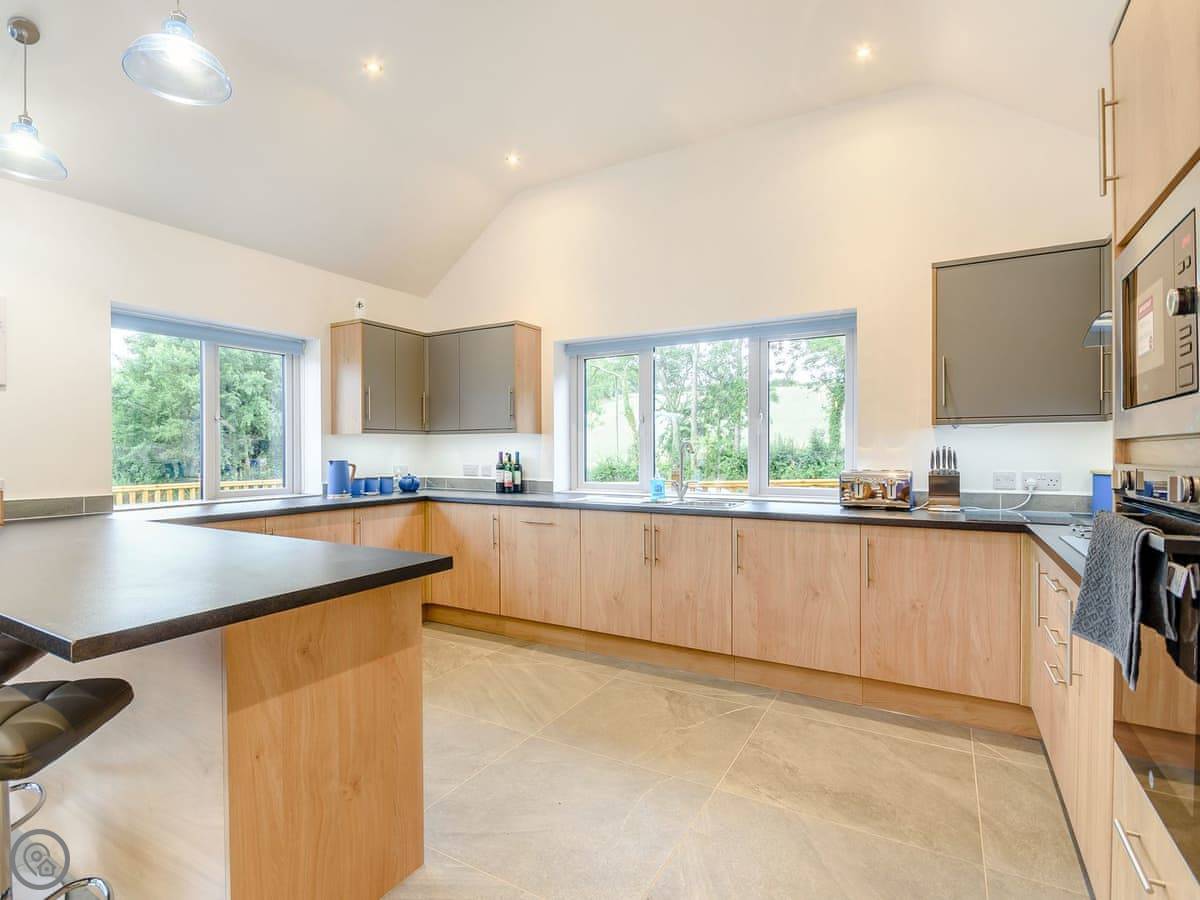The main living space is open plan. It has a wood burner. The views from the front are over fields to an old windmill. From the back, you look out across the Wolds.