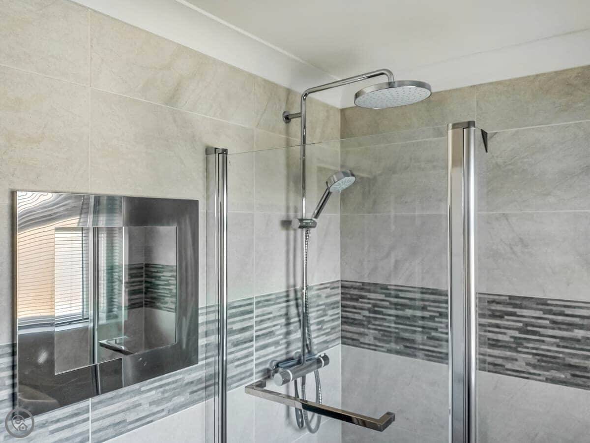 The living room is a good size with a big sofa and a TV on the wall. The kitchen is new and has a dishwasher. There's a spiral staircase up to the bedroom. It's a bit tight but you get used to it. The bed is a super kingsize and there's a walk-in wardrobe. The bathroom has a shower over the bath.