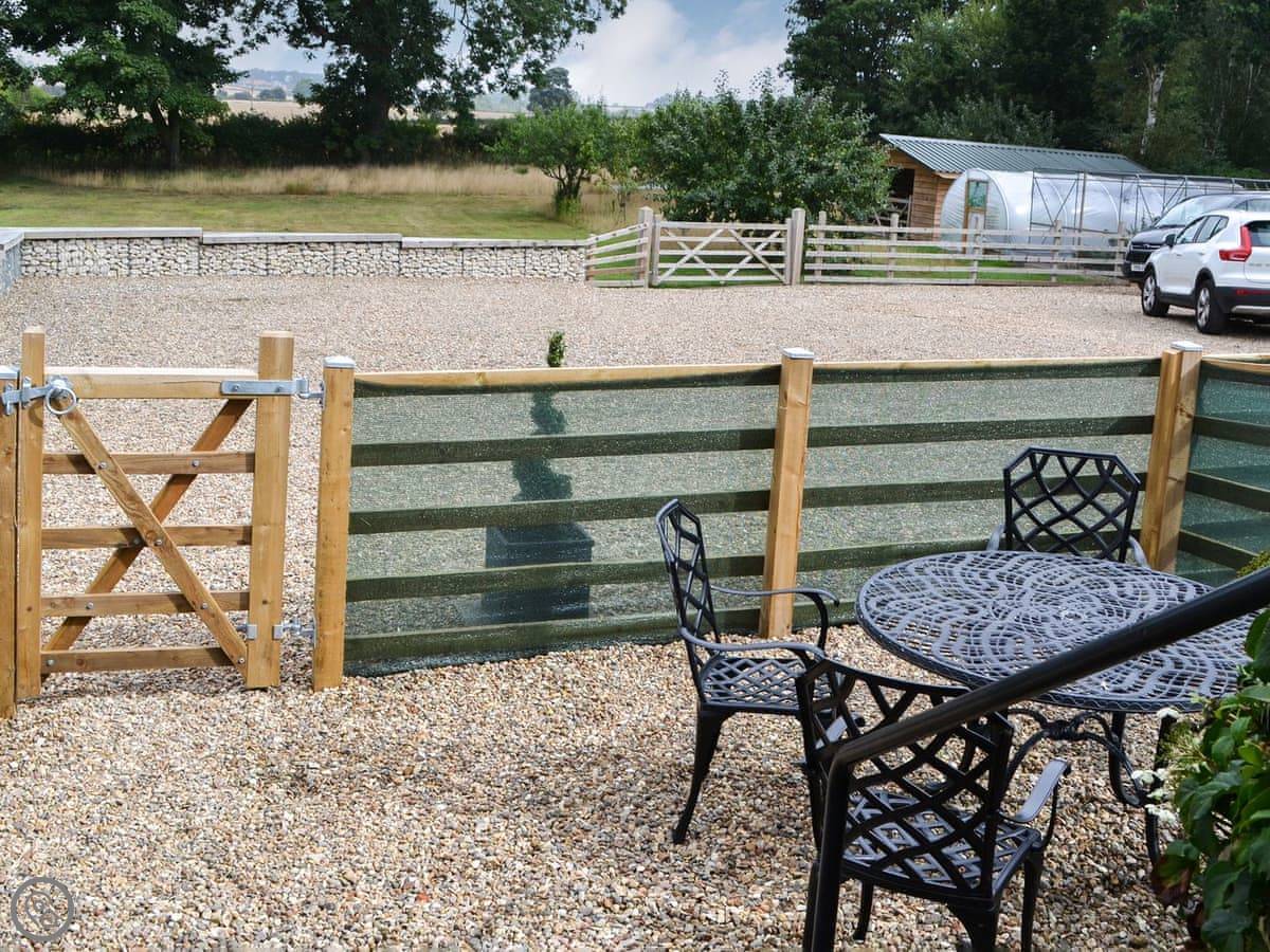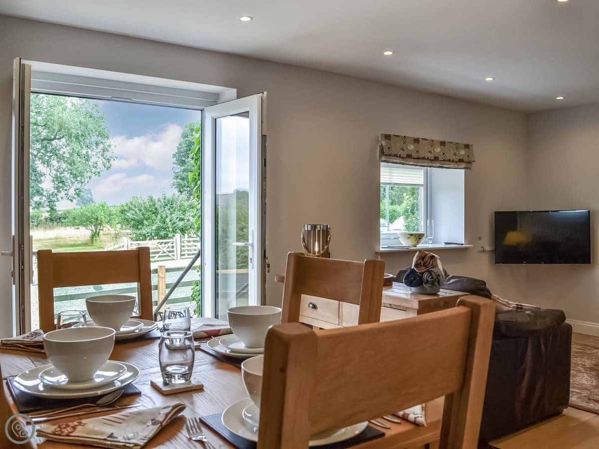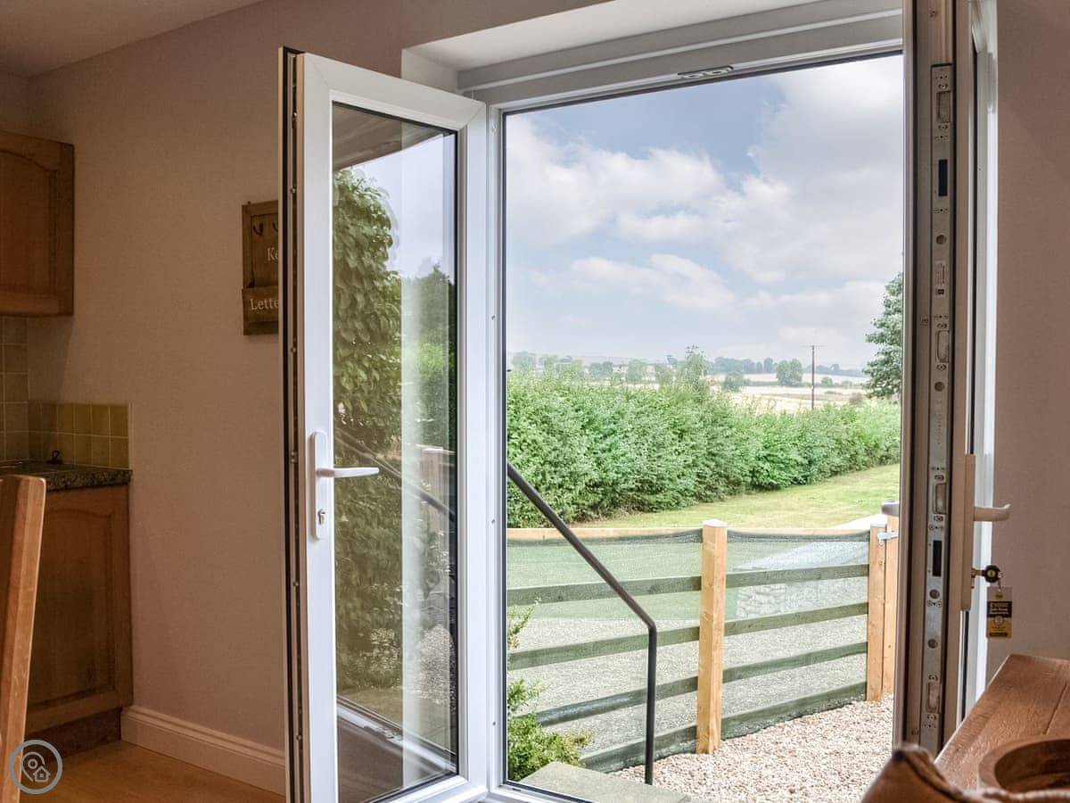 You walk straight into the main room. It's open plan. The French doors let in a lot of light and go out to a gravel garden. The garden is enclosed. It looks out over the fields. Good spot for a morning coffee.