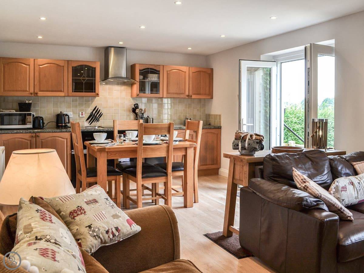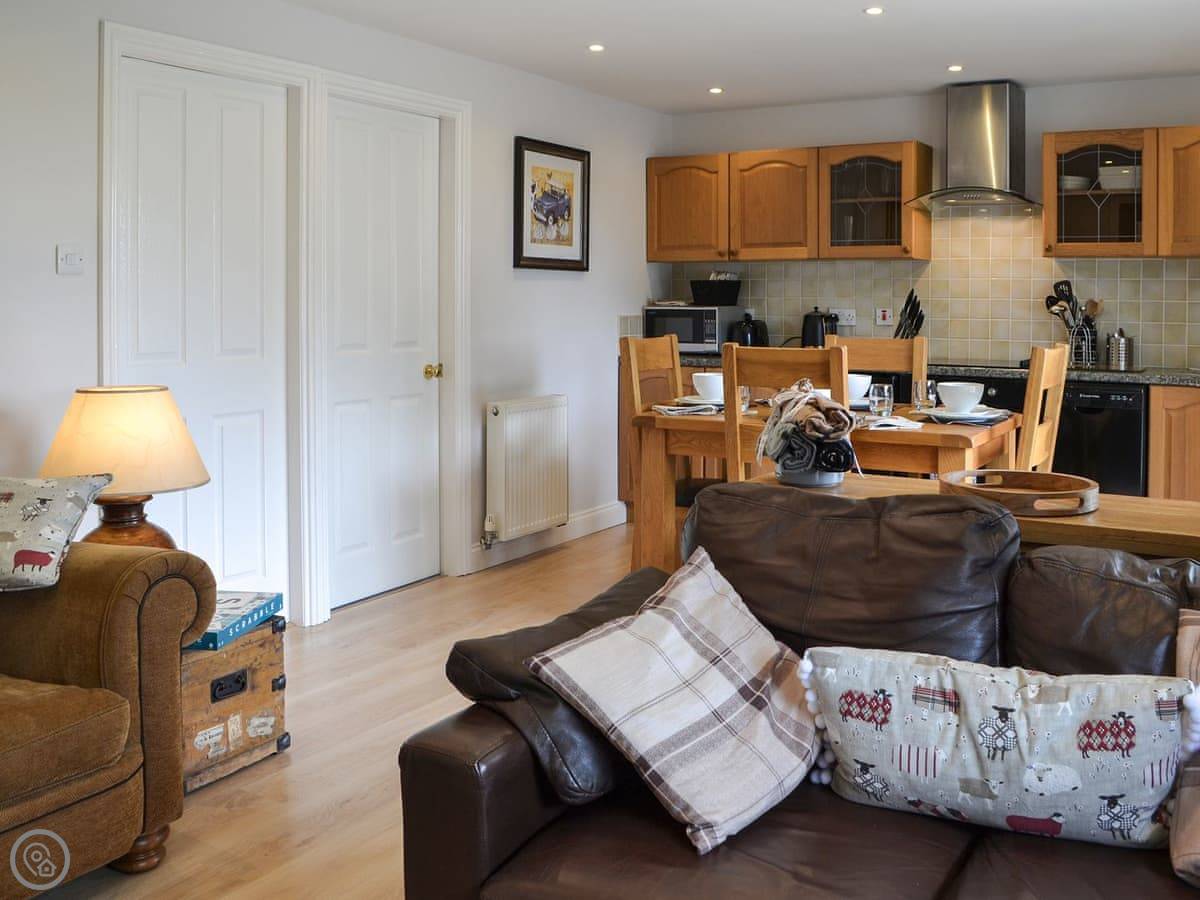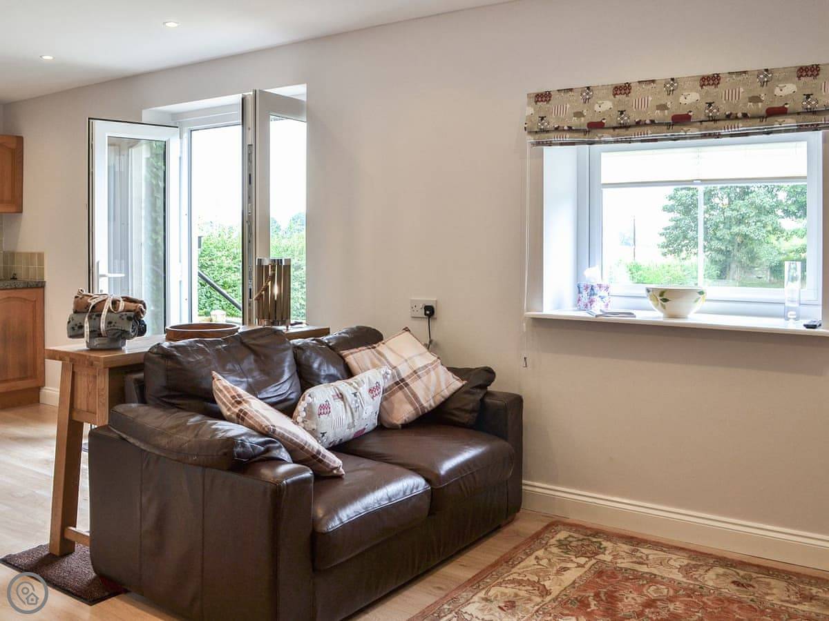 You walk straight into the main room. It's open plan. The French doors let in a lot of light and go out to a gravel garden. The garden is enclosed. It looks out over the fields. Good spot for a morning coffee.