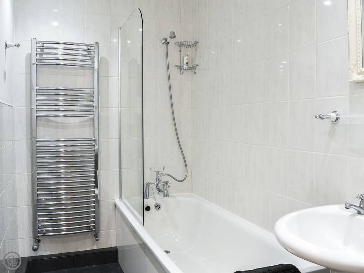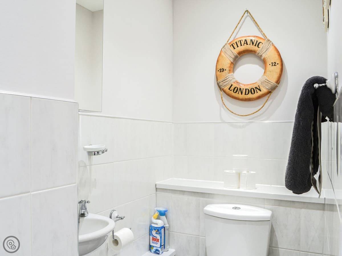 The stairs are here too, not steep but they are spiral. Something to be aware of. Both bedrooms are downstairs. They're doubles. Pastel colours, quiet. The bathroom has a bath with a shower over it.