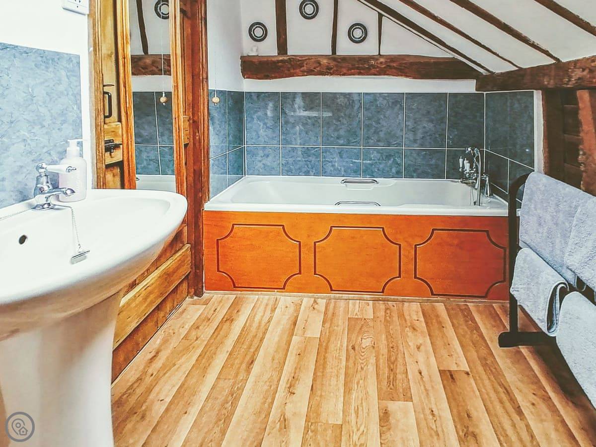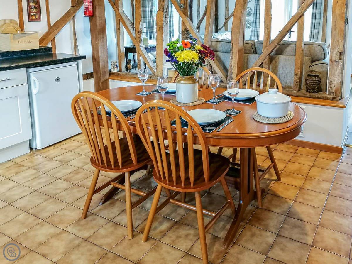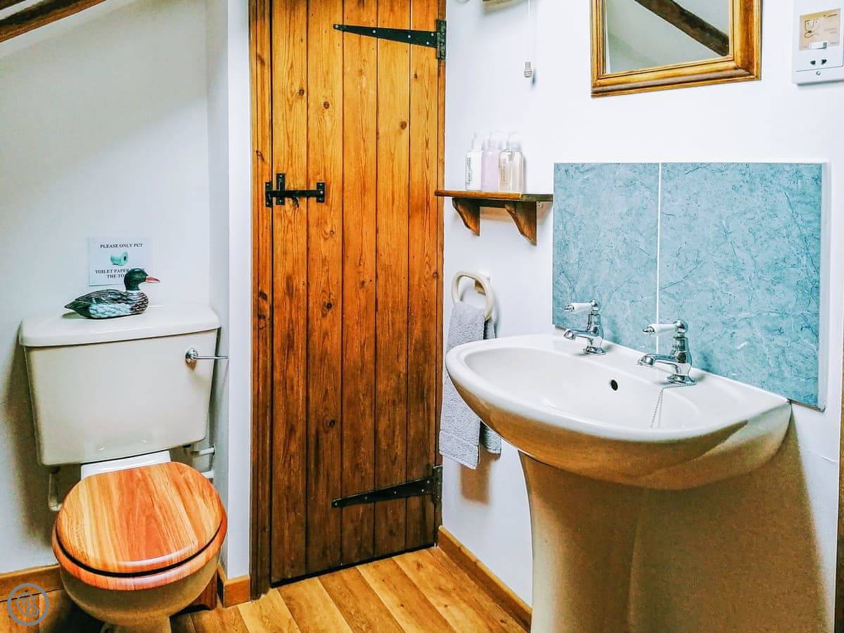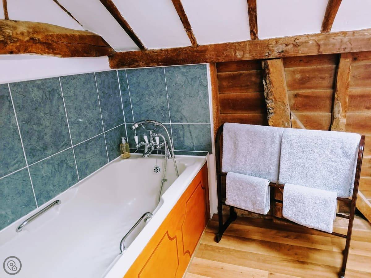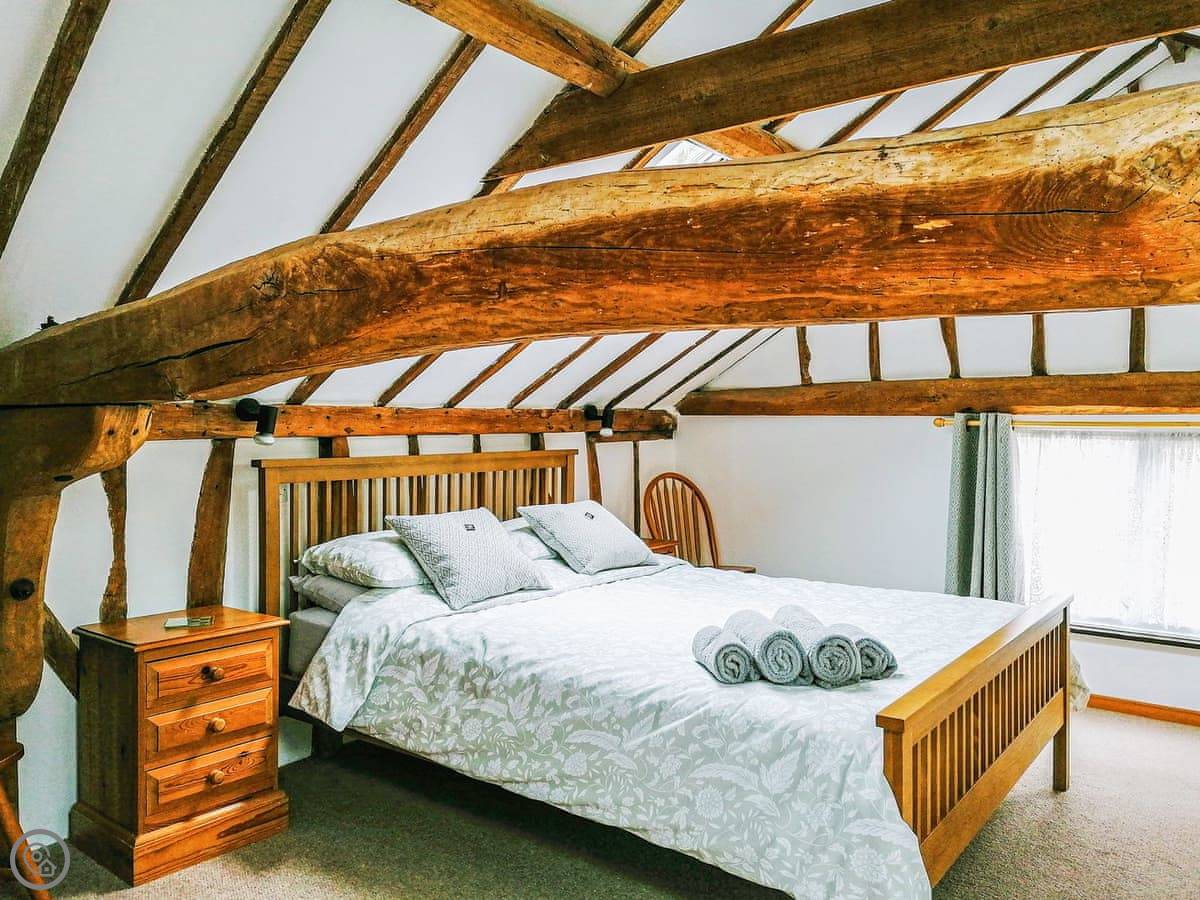 Cottage No 1 at Barn Cottages is set over two levels and is very spacious throughout. On the ground floor the cottage has wooden beams throughout. There is a well-equipped kitchen/diner and a spacious living room with two sofas. The living room has a log effect fire, TV and DVD player. The cottage is south facing and has patio doors leading to the picturesque shared cottage garden. Garden furniture is supplied to enable our guests to enjoy their surroundings. Barbecues are available on request. Upstairs also has wooden beams and there is one low beam in the bedroom which has a king size bed, an en-suite bathroom and ample storage facilities.
