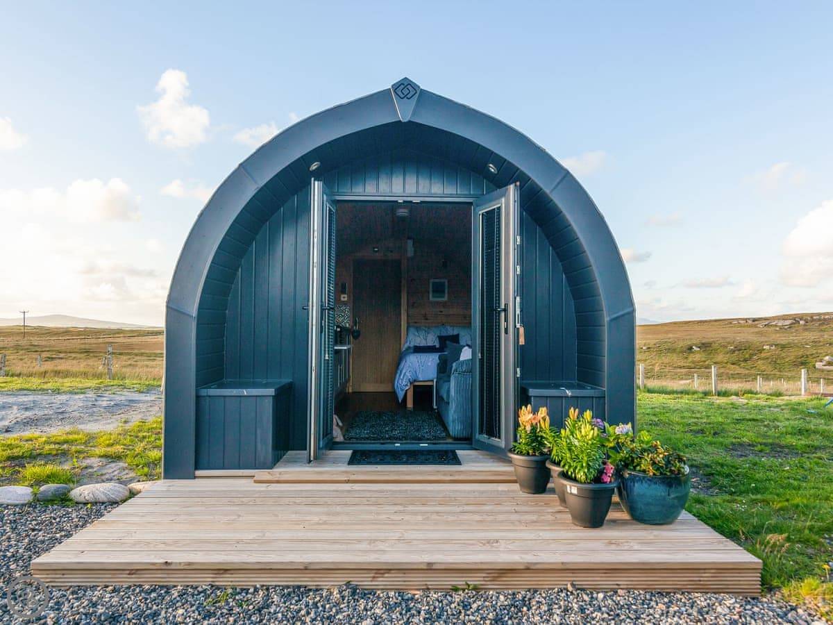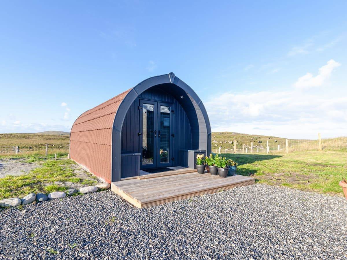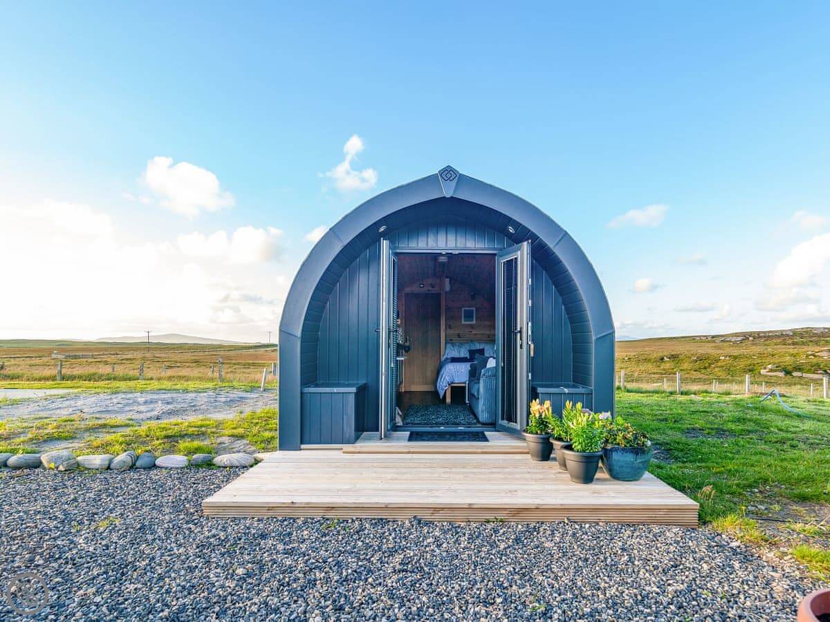 Boreray is situated on a croft with lovely views and sheep in the fields around you. It is just 10 minutes to "the wee beach", and there are great walks in the area, including along the famous 3-mile long white West Beach sands and Calchan Sands, only 3 miles away on Berneray. You can also walk to a bistro in Berneray. Enjoy the scenery, the fresh air and a good night’s sleep in the pod, which has underfloor heating, a small kitchen area where you can cook the local shellfish, a shower room with toilet, double bed and also a double sofa bed.