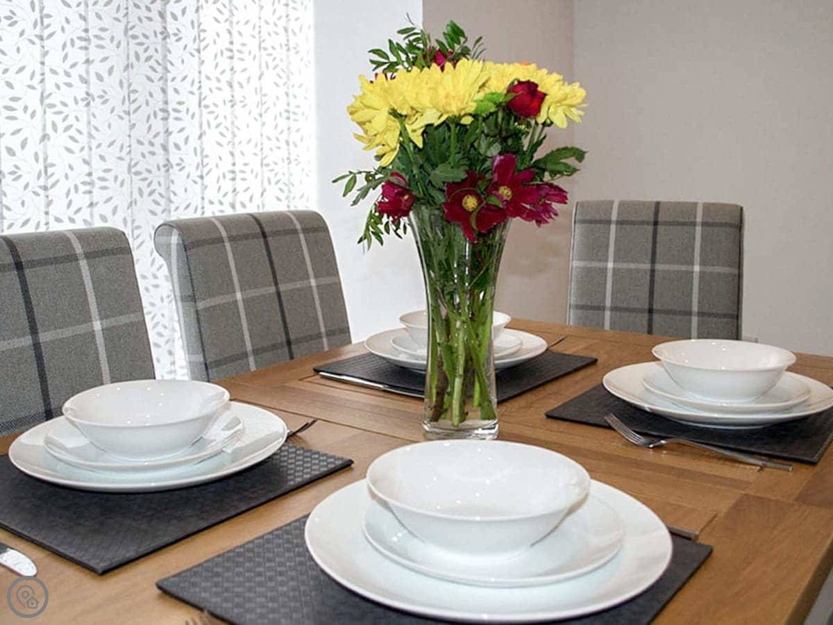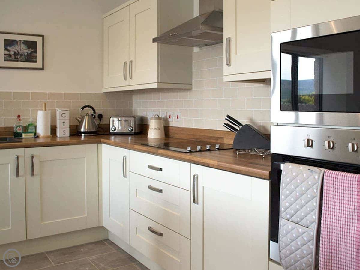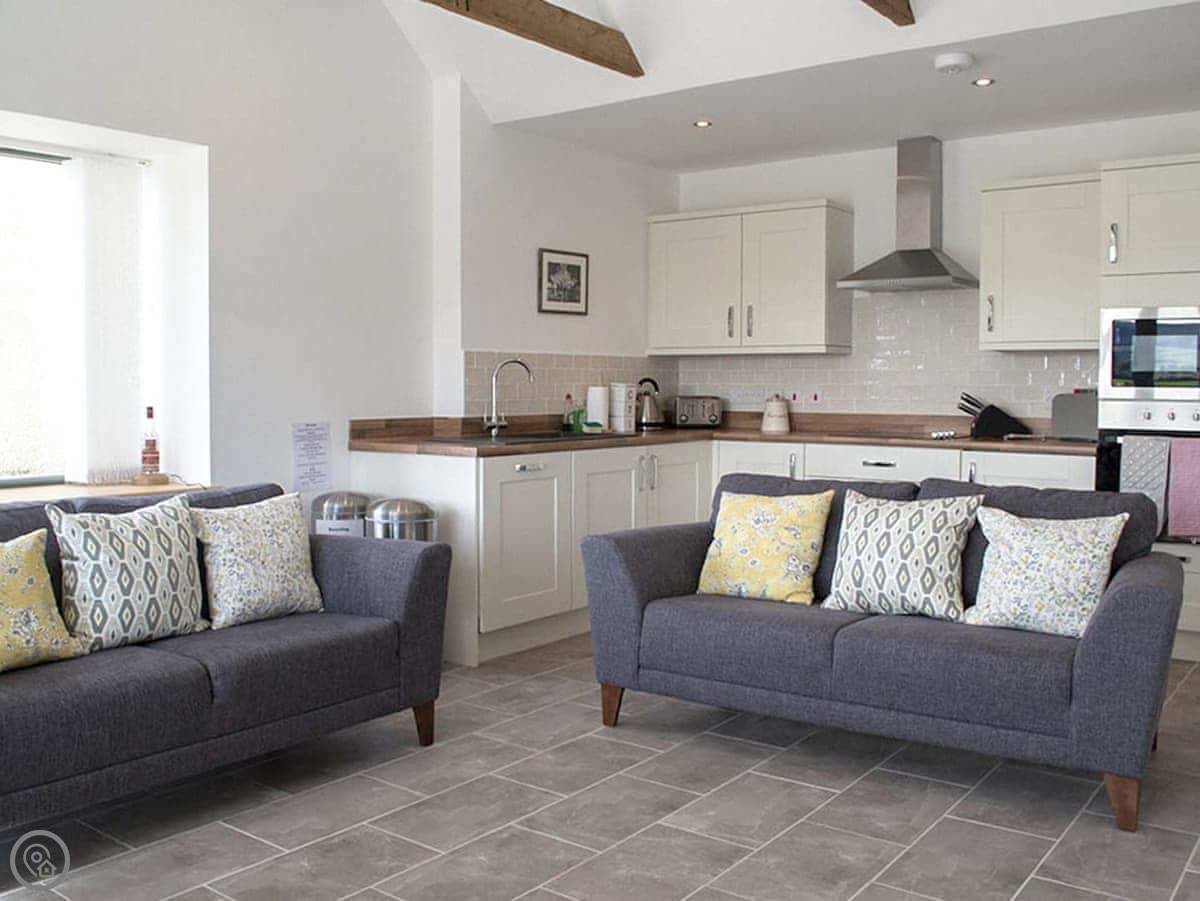 You’ve got an open plan living area. Big table for six, comfy sofas, and doors looking out over the fields. The kitchen has everything you’d expect. It’s underfloor heated, so you can set each room to what you like. There’s a wood burner for cosy evenings.