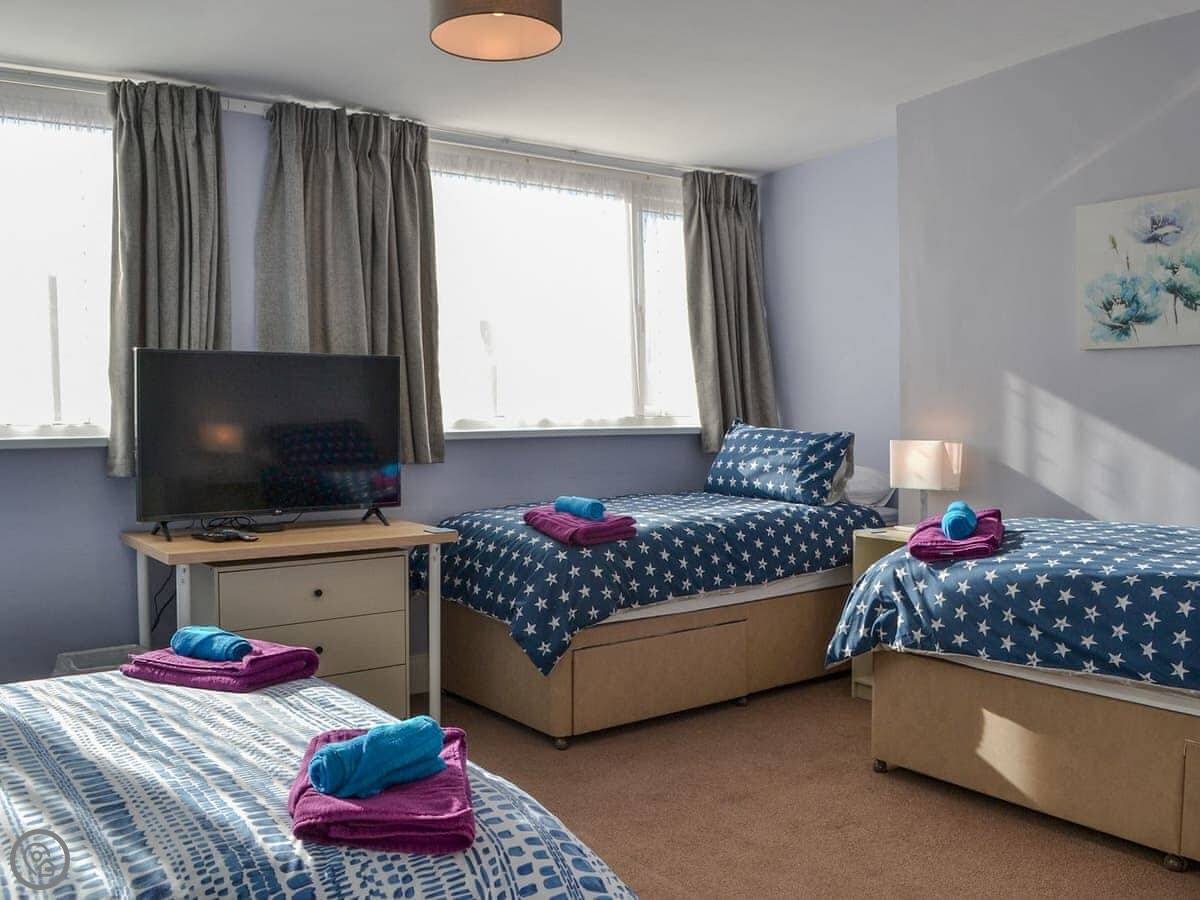It sleeps thirteen people, which gives you an idea of the size. There are five bedrooms and two bathrooms. It has a 4 Star rating. It's spread over three floors. There's a twin bedroom and a bathroom on the ground floor, which is handy.
