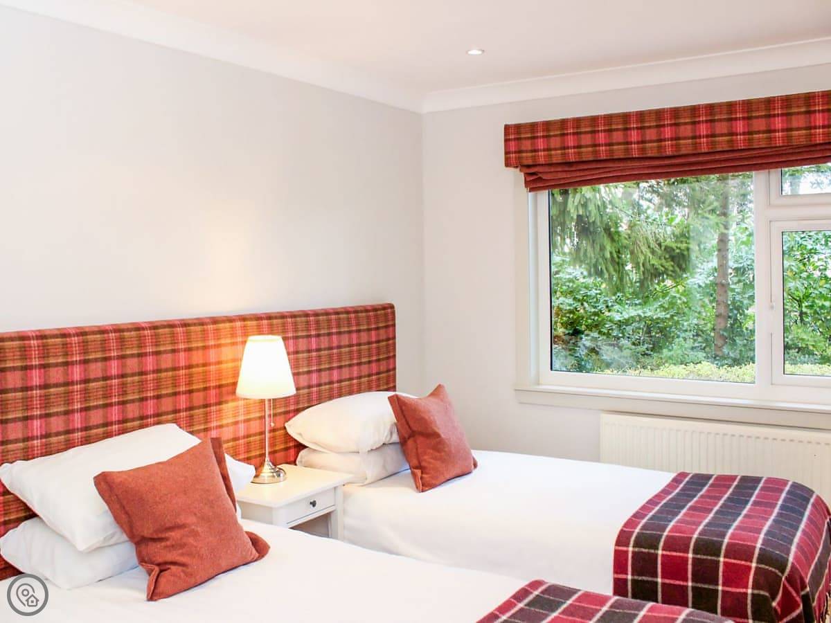 It sleeps eight people. Four bedrooms, and each one has its own bathroom, which is useful. There's a big lounge with doors out to a balcony. It looks over the hotel gardens and you can hear the burn running past. It's a nice sound.