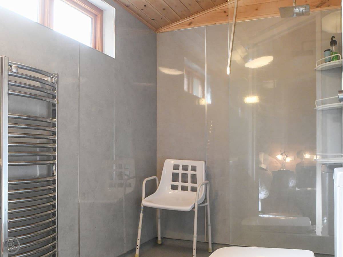 It sleeps four in two bedrooms. Both have their own shower room. The main room is all open plan, kitchen, dining and living area together. There are patio doors out to a decked balcony. It's wheelchair friendly and everything is on the same level.