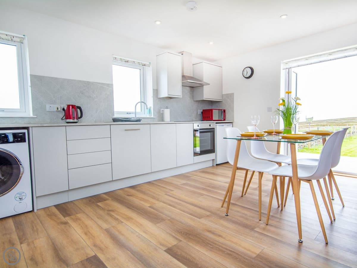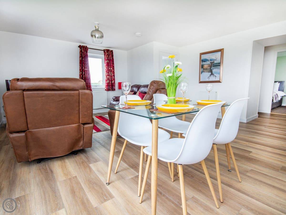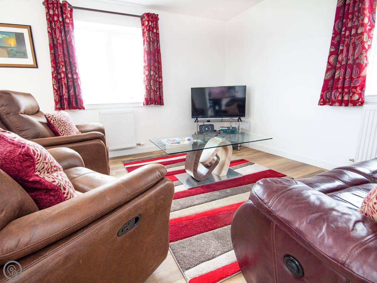 The main room is open plan. Kitchen at one end, sofas at the other. The kitchen is big enough to cook in without getting in anyone's way. There's a Smart TV on the wall. The garden is fully fenced, mainly grass, and you park right outside the door.