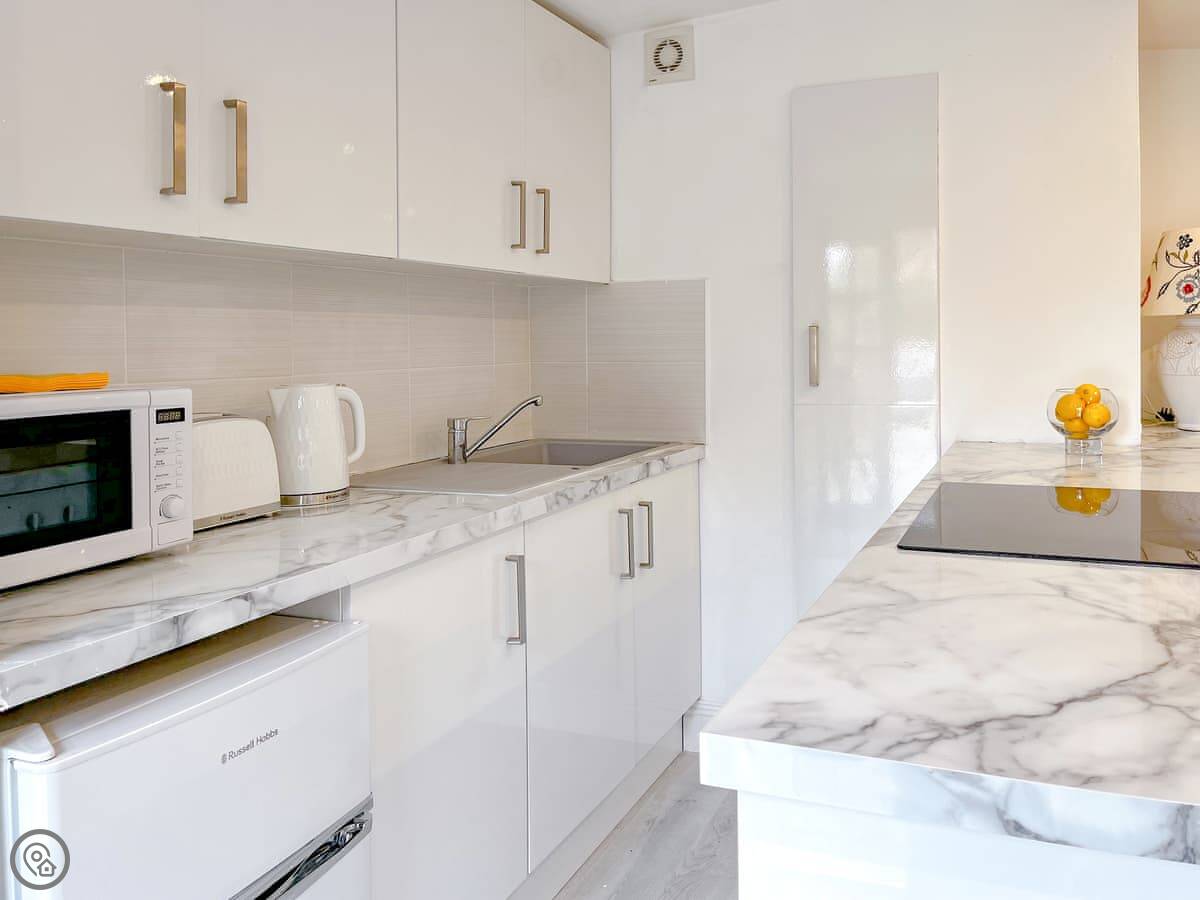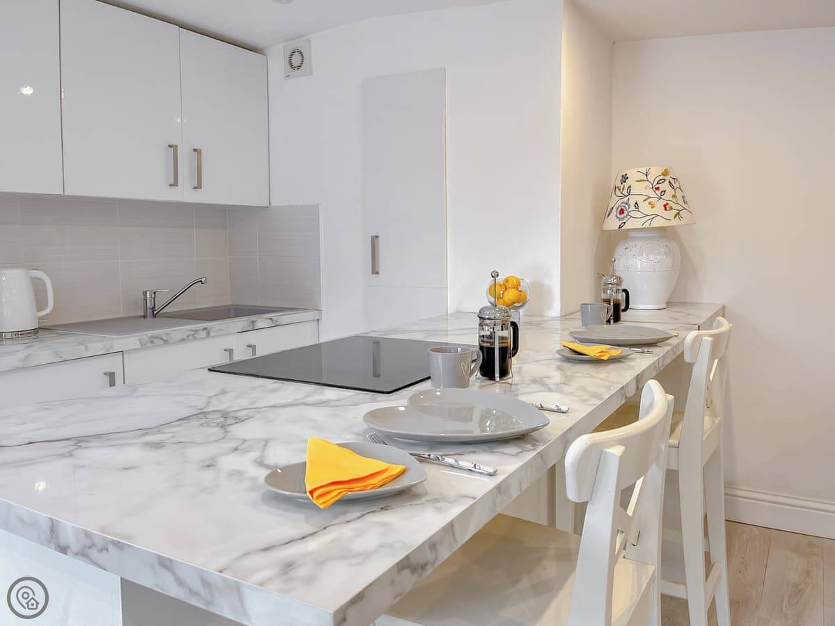 It's a 4 Star rating. It sleeps two, one bedroom with a double bed and one shower room. It's clean and has everything you need. The living area has a sofa and TV, and the kitchenette is small but has the basics. There's wifi.