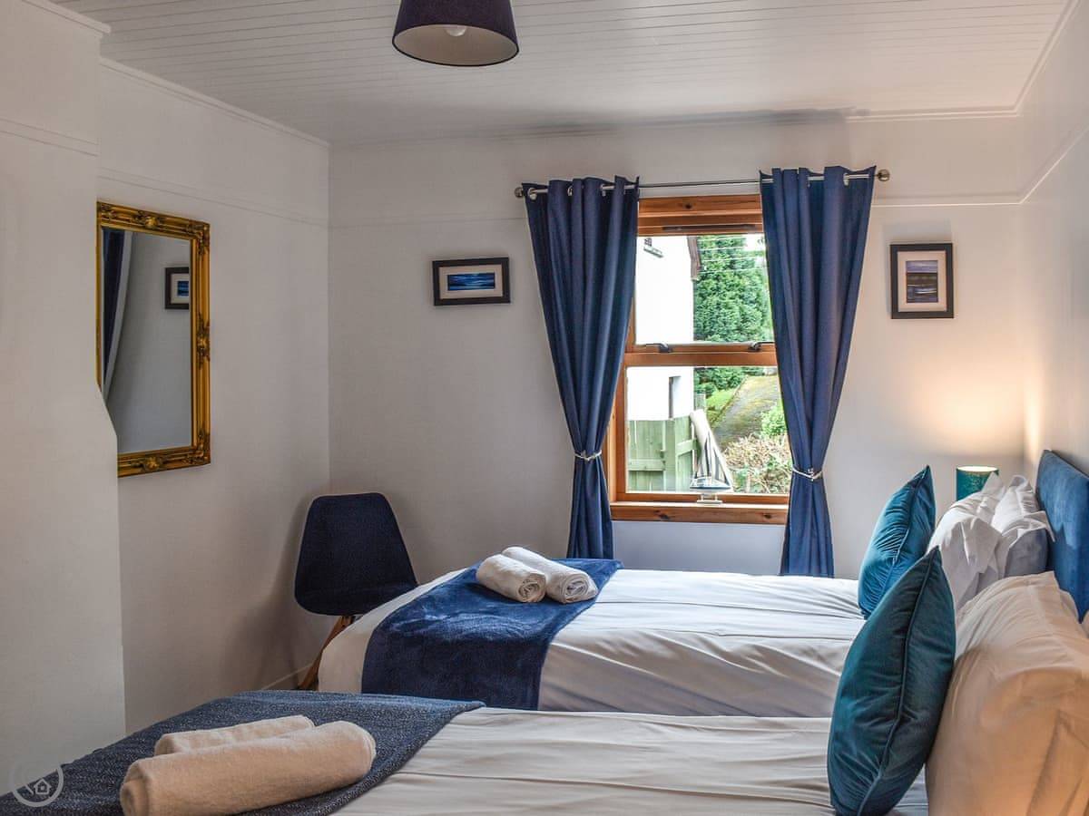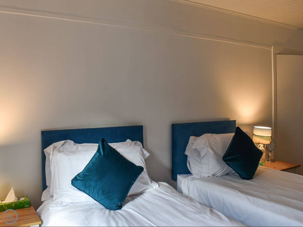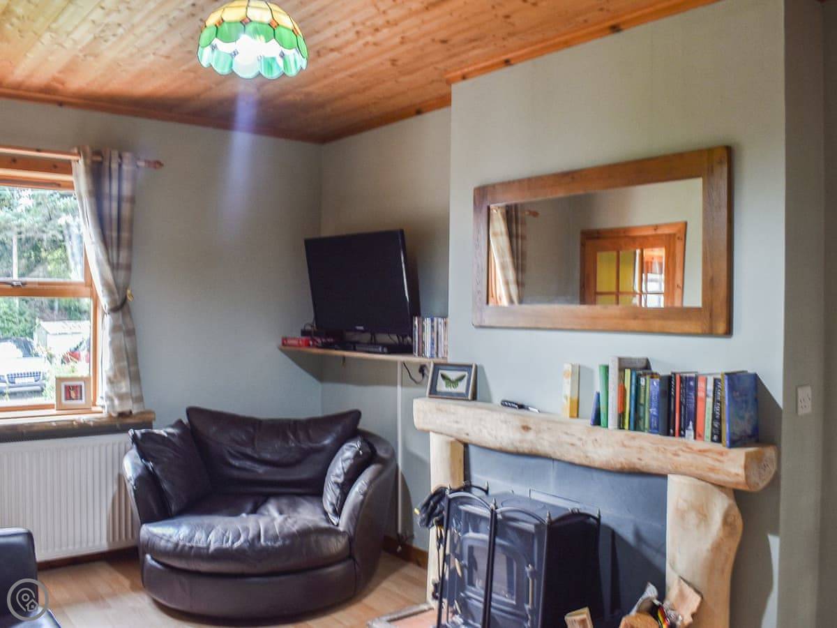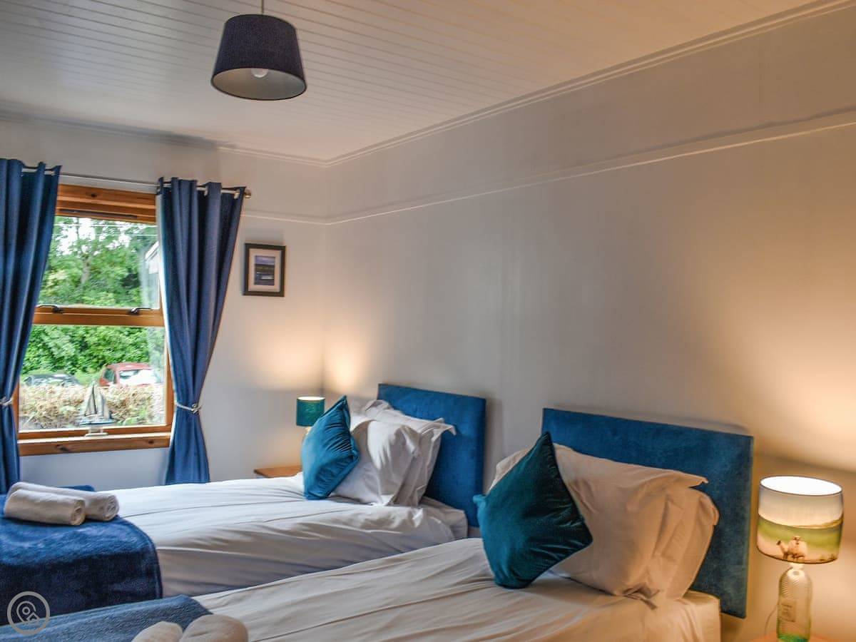 You come into the lounge with the wood burner. The kitchen's through there, it's modern and has one of those tables you can pull out. There's a decent shower room on the ground floor. The first bedroom is down there too, with twin beds that zip together into a double if you prefer.