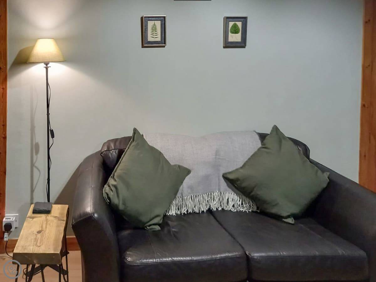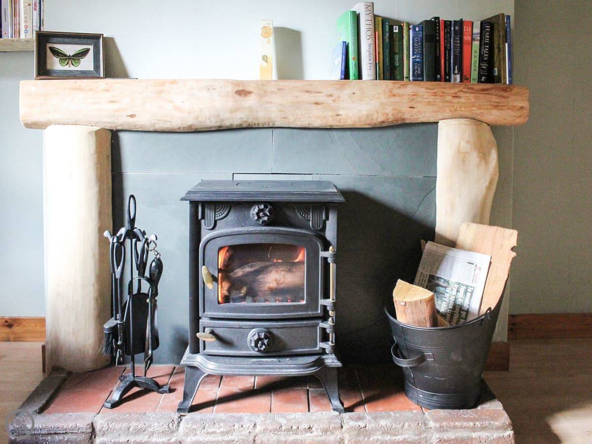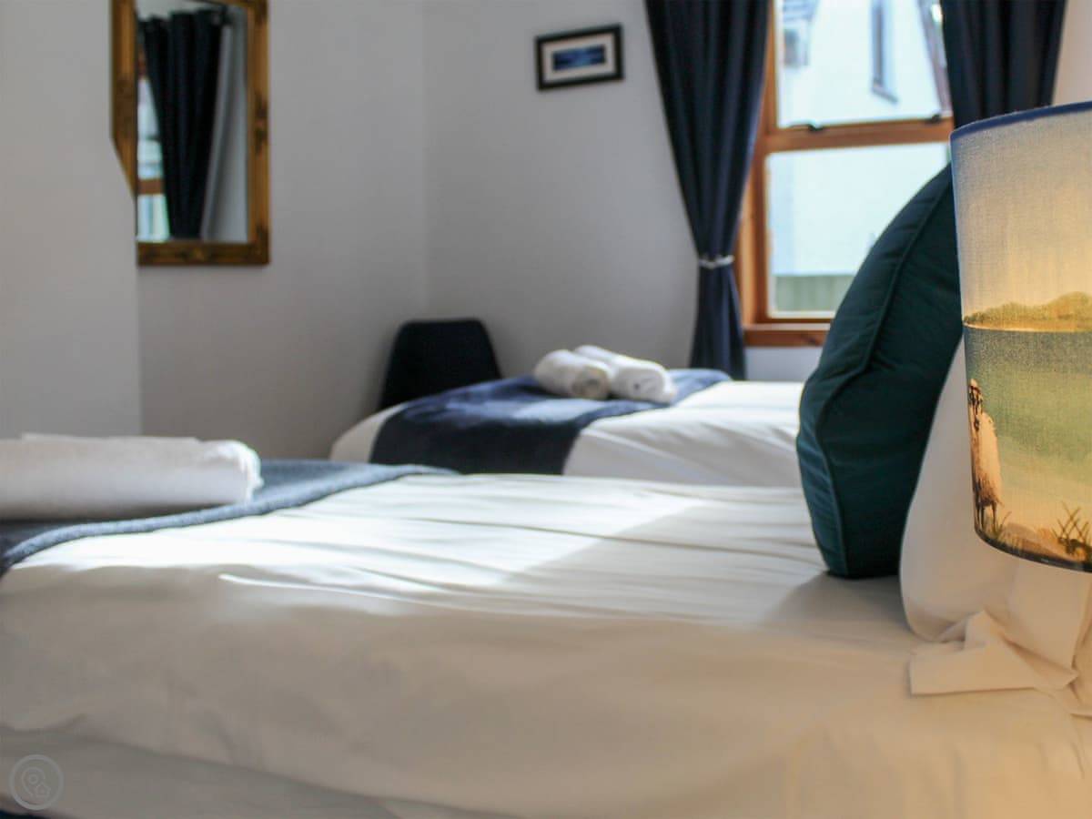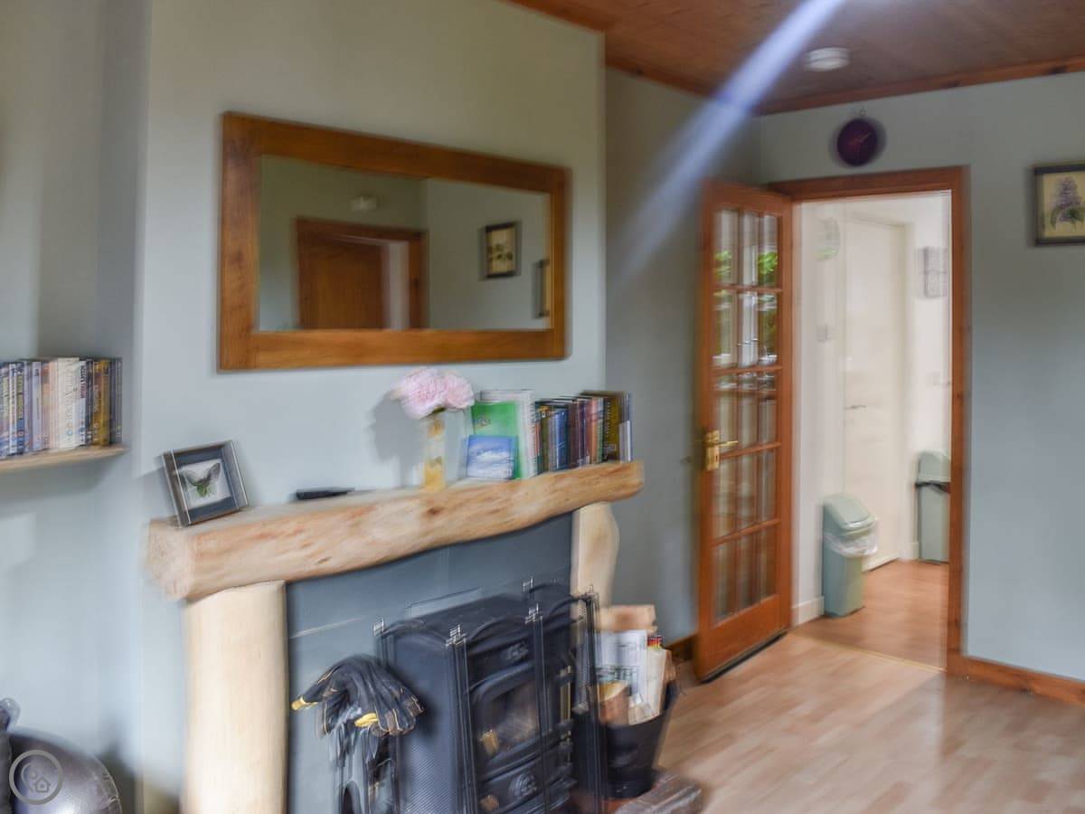 You come into the lounge with the wood burner. The kitchen's through there, it's modern and has one of those tables you can pull out. There's a decent shower room on the ground floor. The first bedroom is down there too, with twin beds that zip together into a double if you prefer.