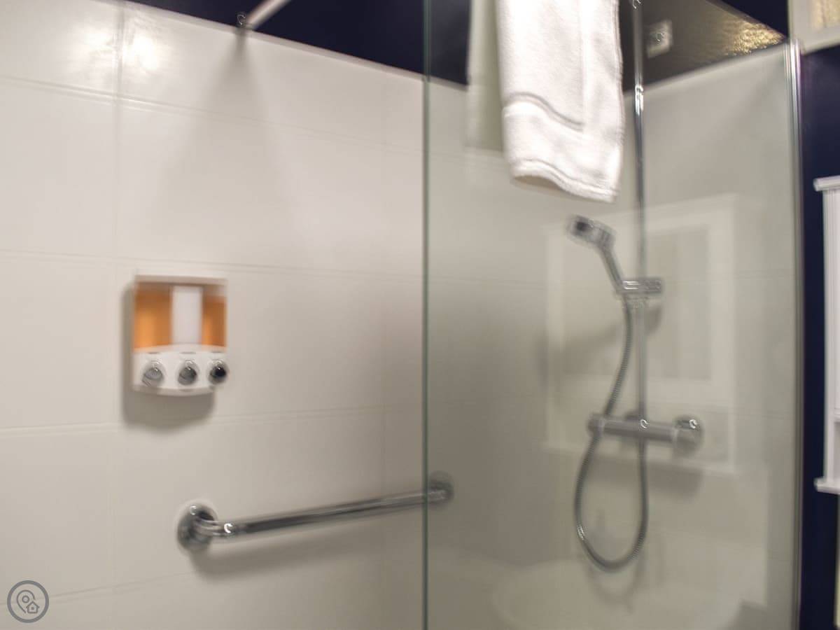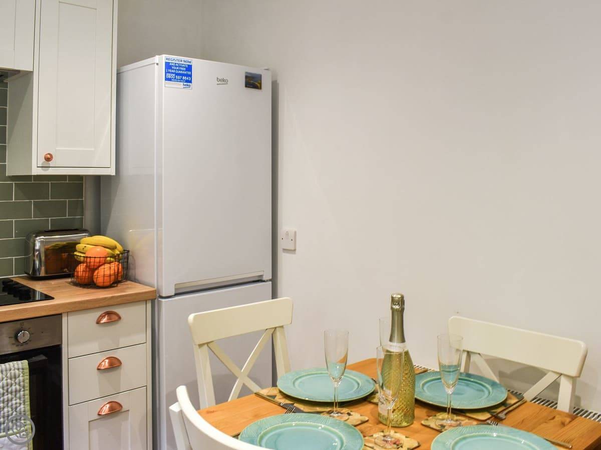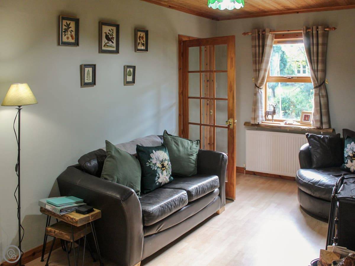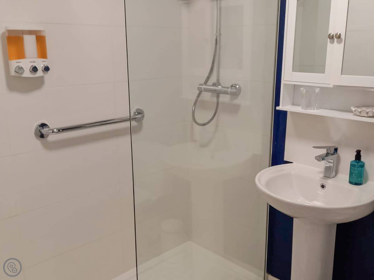 You come into the lounge with the wood burner. The kitchen's through there, it's modern and has one of those tables you can pull out. There's a decent shower room on the ground floor. The first bedroom is down there too, with twin beds that zip together into a double if you prefer.