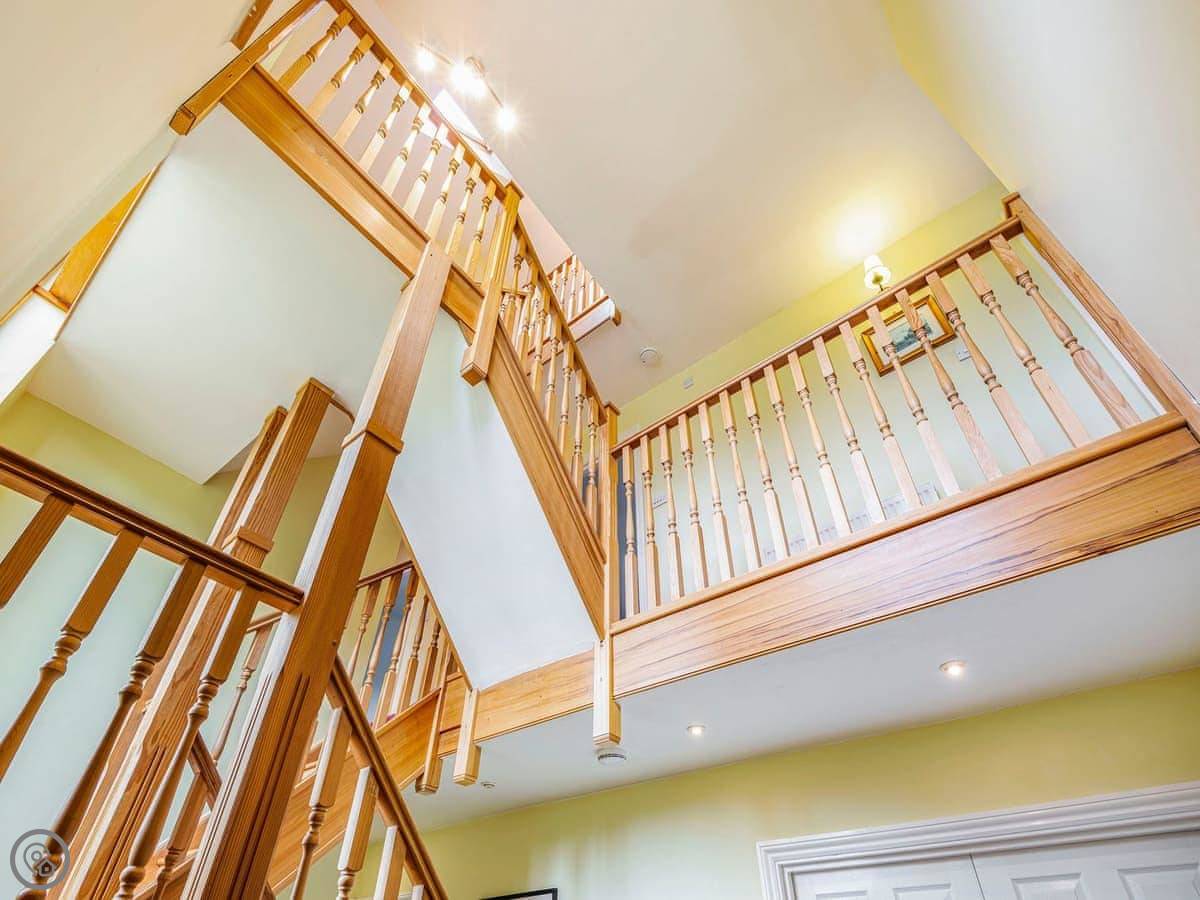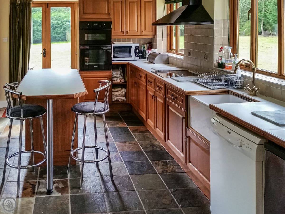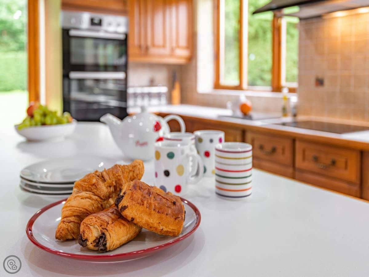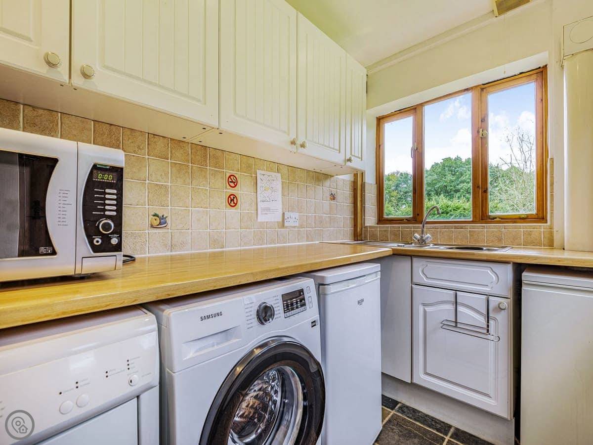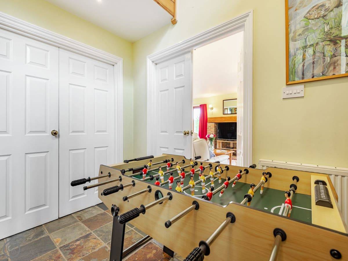 Inside, it's set up for a big group. There's a large living room, a dining room, and a second dining space or games room with a football table. The kitchen has what you need. There's a utility room with a washing machine. We provide bedding and towels. There's a cot and a highchair if you need them.