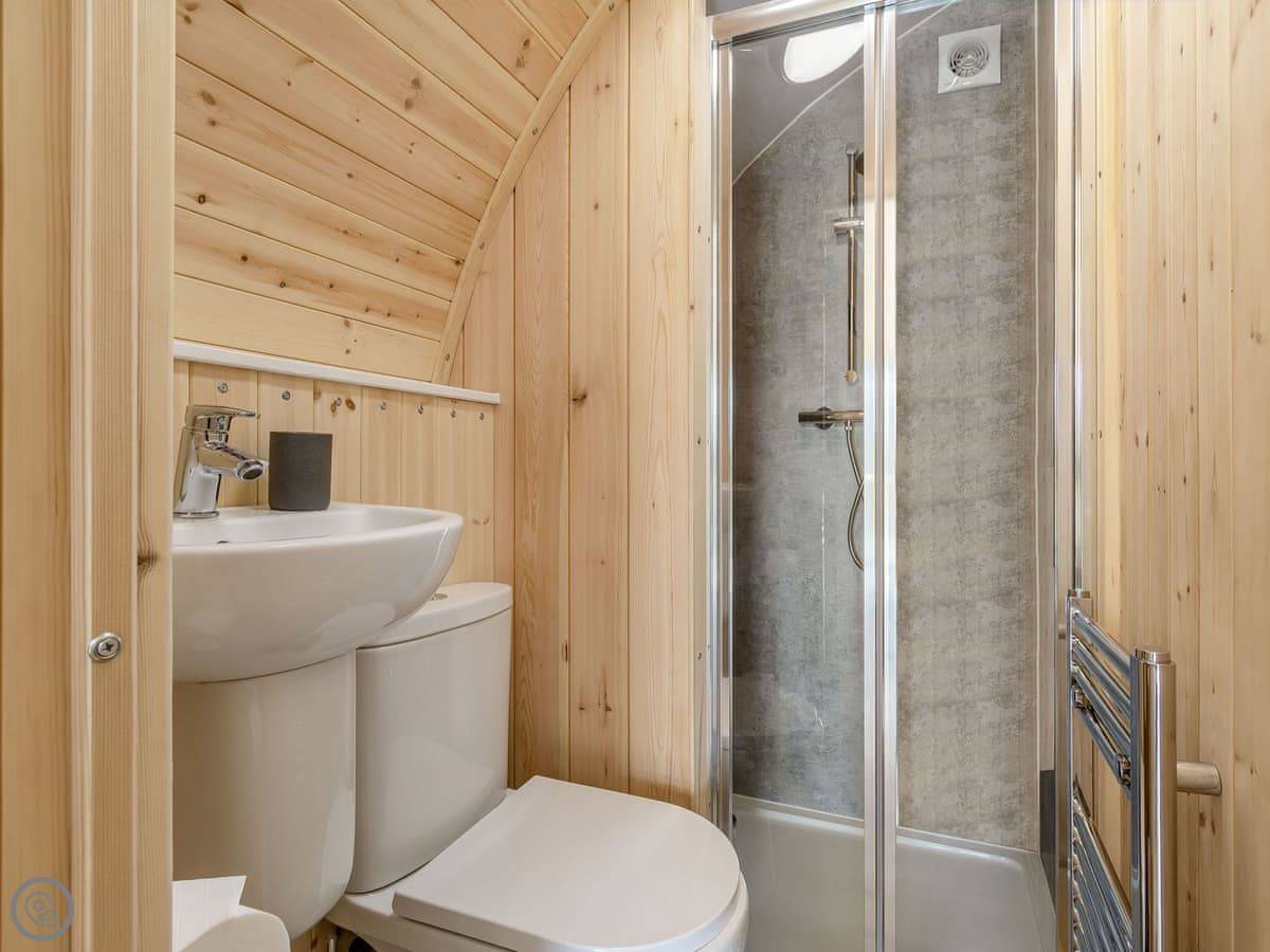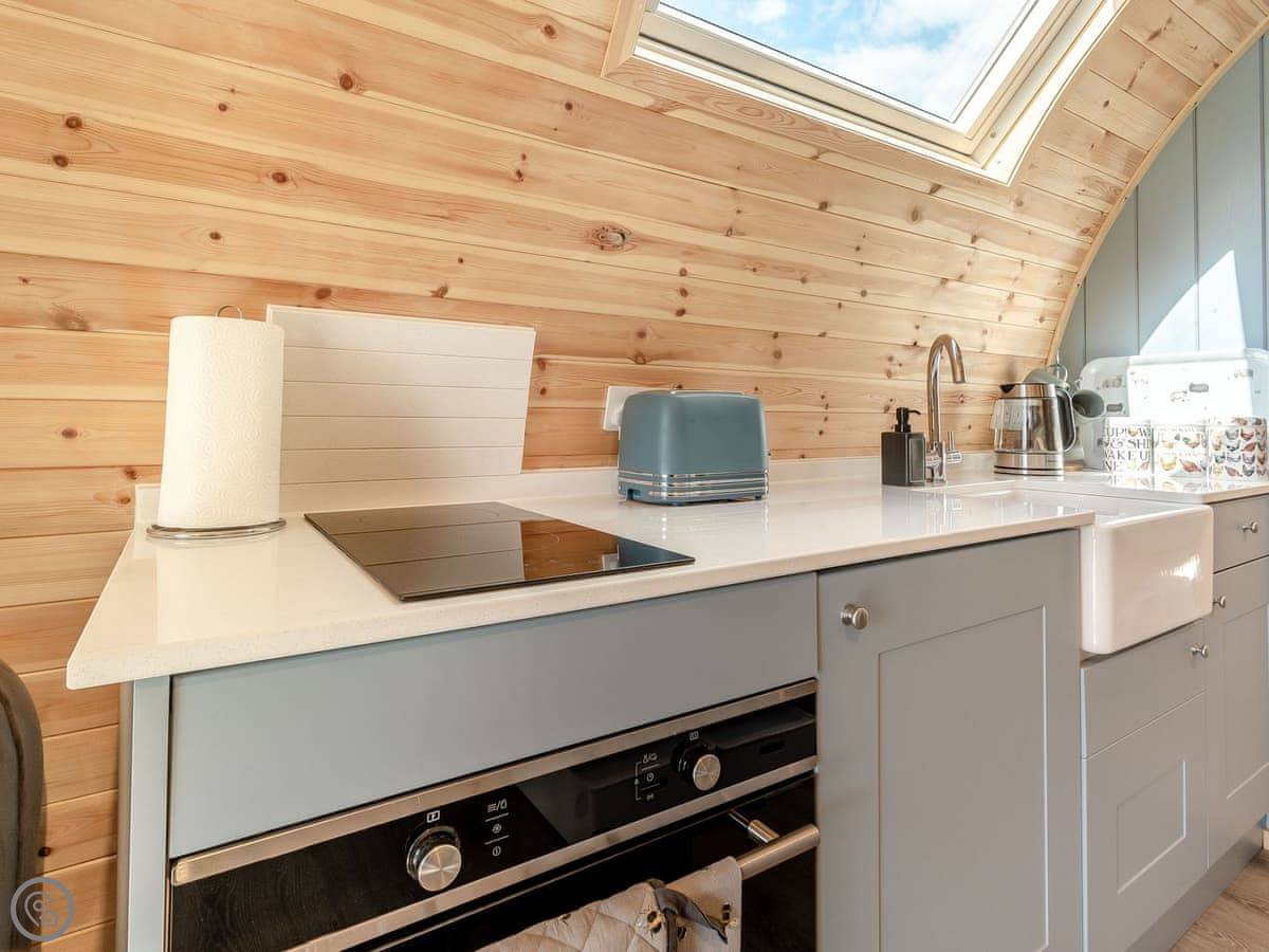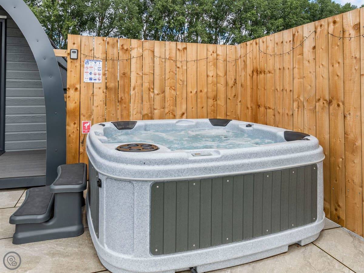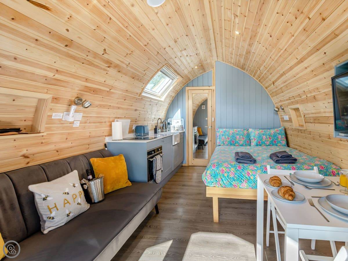 If you are looking for a getaway with a difference, then look no further than the Tamworth. Open plan throughout it features a plush double bed guaranteeing a perfect night’s slumber, a small kitchenette complete with induction hob, fridge with small freezer box, combi microwave oven/grill and plenty of space for food preparation. In addition the living area has a comfortable sofa with a Smart TV and built in Bluetooth speakers throughout. In the next room the pod has a fully fitted shower room with shower cubicle, heated towel rail, sink and toilet. To the rear of the pod there are also bunk beds which are great for children. The delightful, enclosed garden offers a lovely porcelain patio area with a fantastic private hot tub and lawned seating area. This area is a great place to kick back and relax whilst enjoying the views and having a well-deserved glass of fizz! Although just a mile from Thirsk you get a real feel for the countryside.