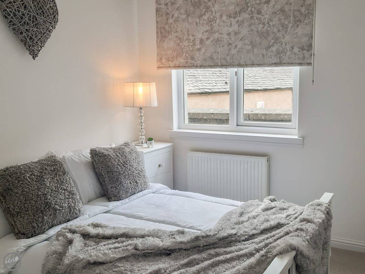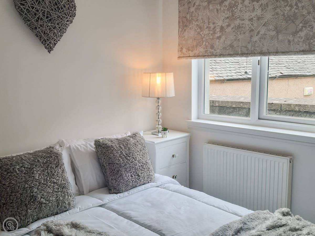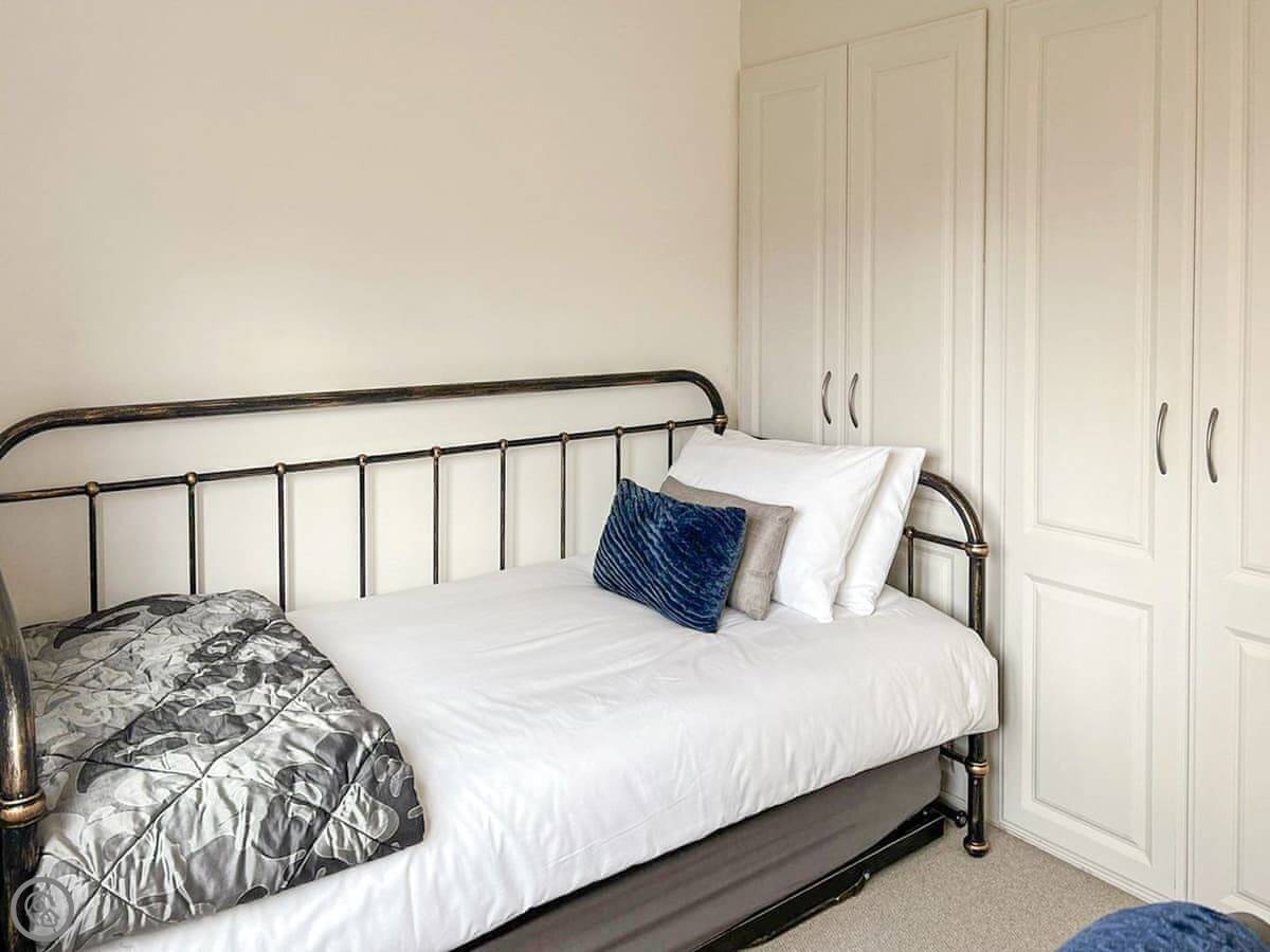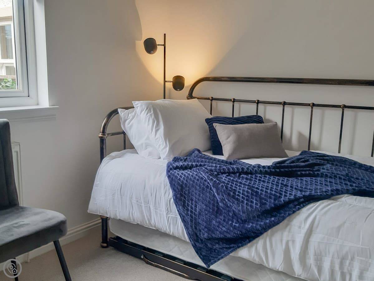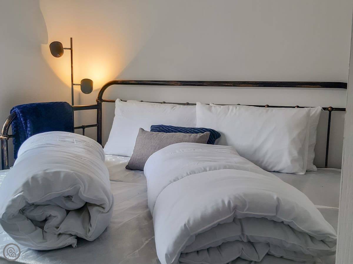 The place is clean and modern inside. You've got one proper double bed in the main bedroom. The second room has a day bed that pulls out into another double, so it can be set up as twins if you like. There's one bathroom with a walk-in shower. Everything you'd need is there, like a washing machine and Wi-Fi. Bedding and towels are included. No pets.