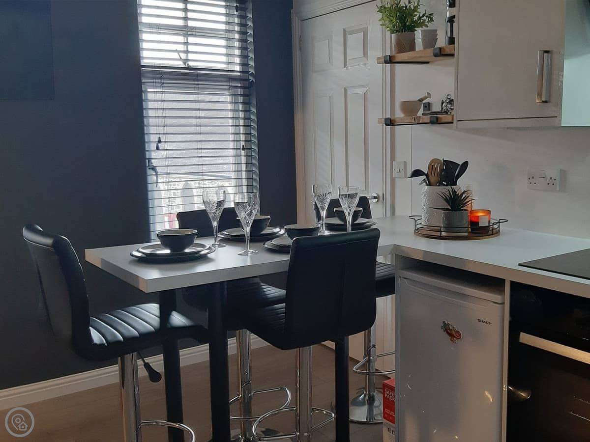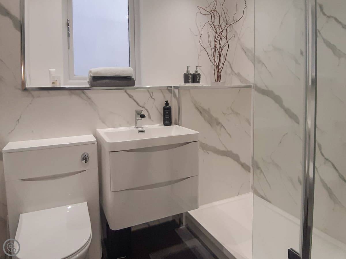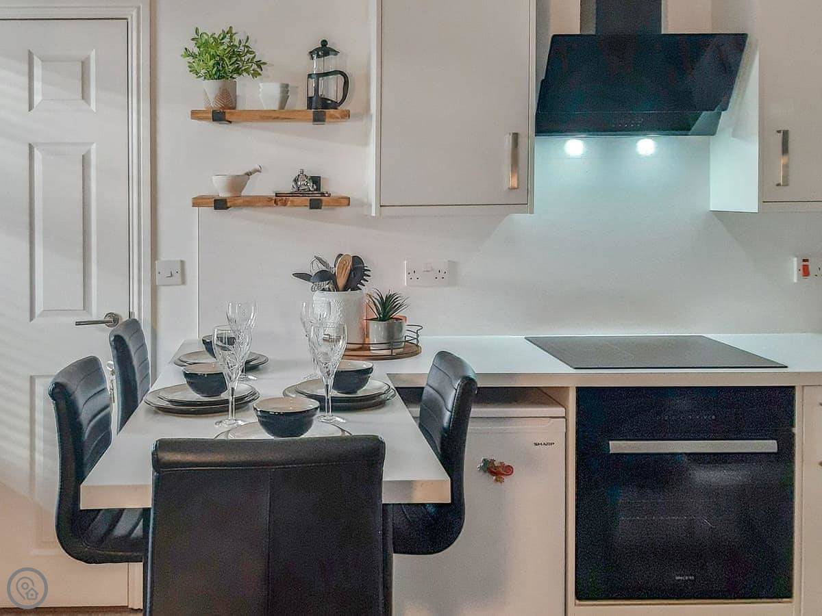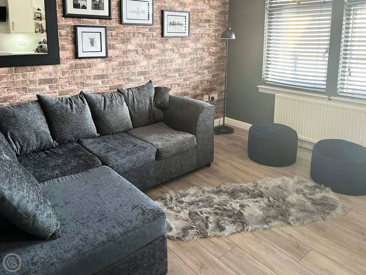 The place is clean and modern inside. You've got one proper double bed in the main bedroom. The second room has a day bed that pulls out into another double, so it can be set up as twins if you like. There's one bathroom with a walk-in shower. Everything you'd need is there, like a washing machine and Wi-Fi. Bedding and towels are included. No pets.