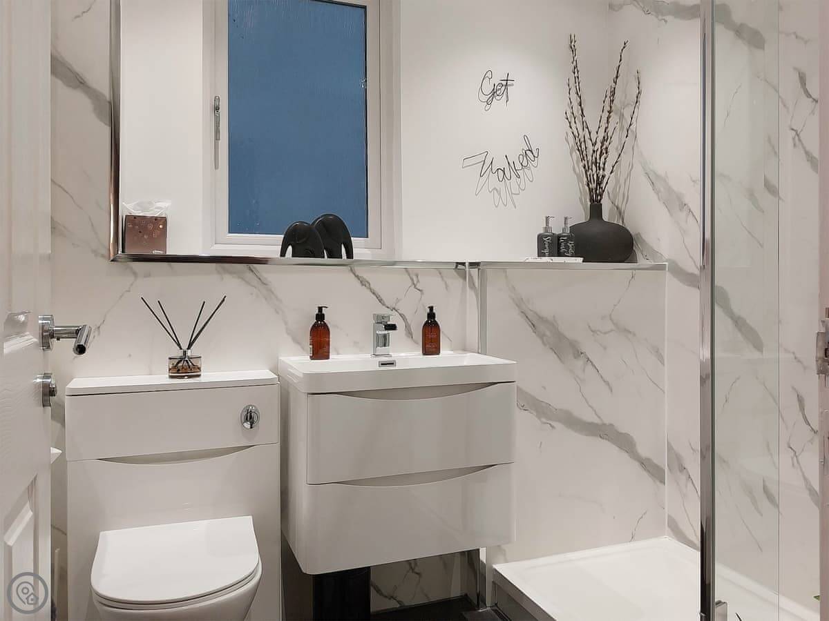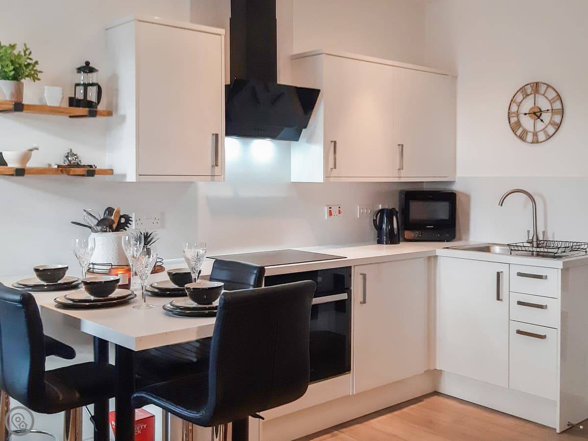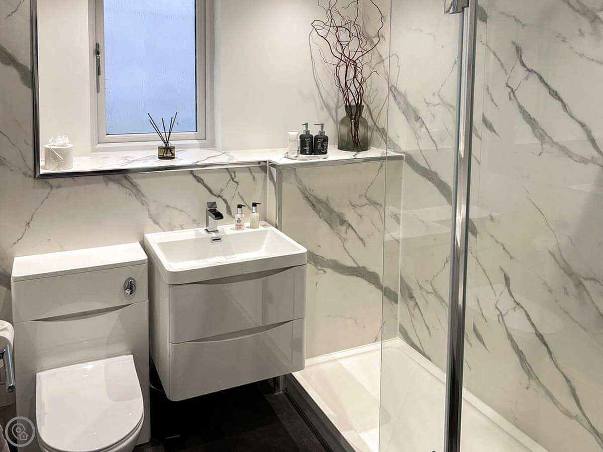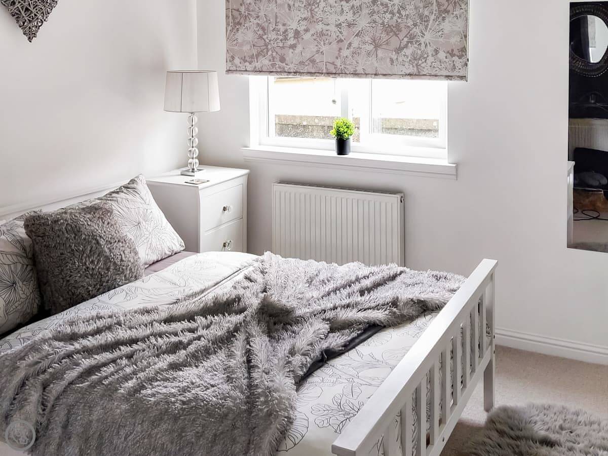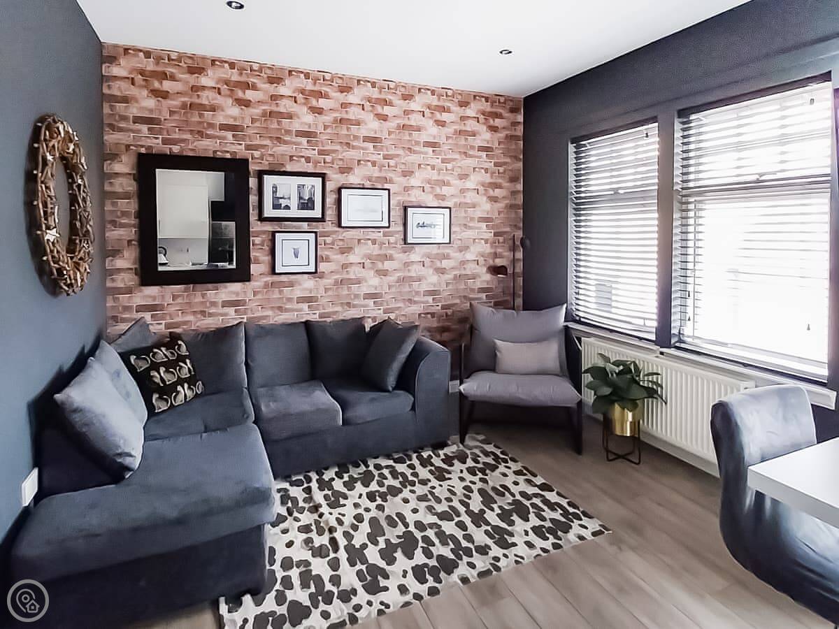 The place is clean and modern inside. You've got one proper double bed in the main bedroom. The second room has a day bed that pulls out into another double, so it can be set up as twins if you like. There's one bathroom with a walk-in shower. Everything you'd need is there, like a washing machine and Wi-Fi. Bedding and towels are included. No pets.