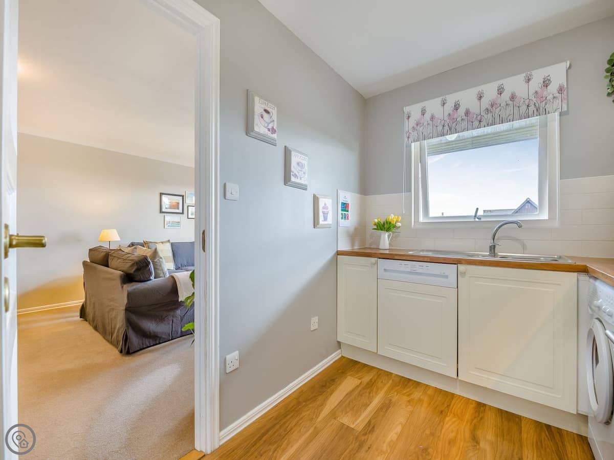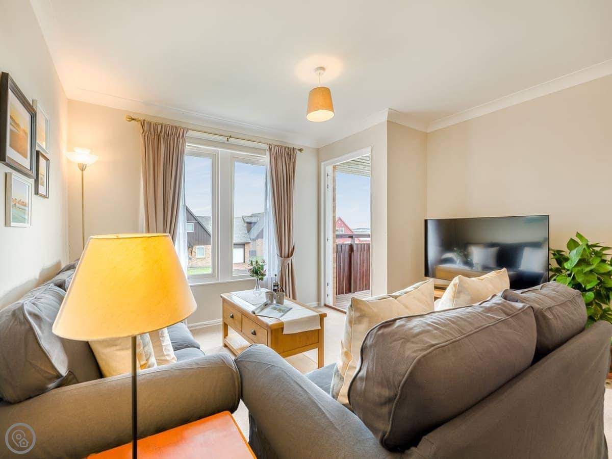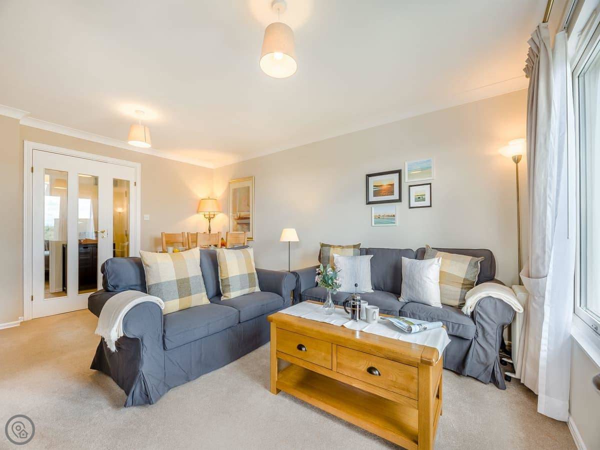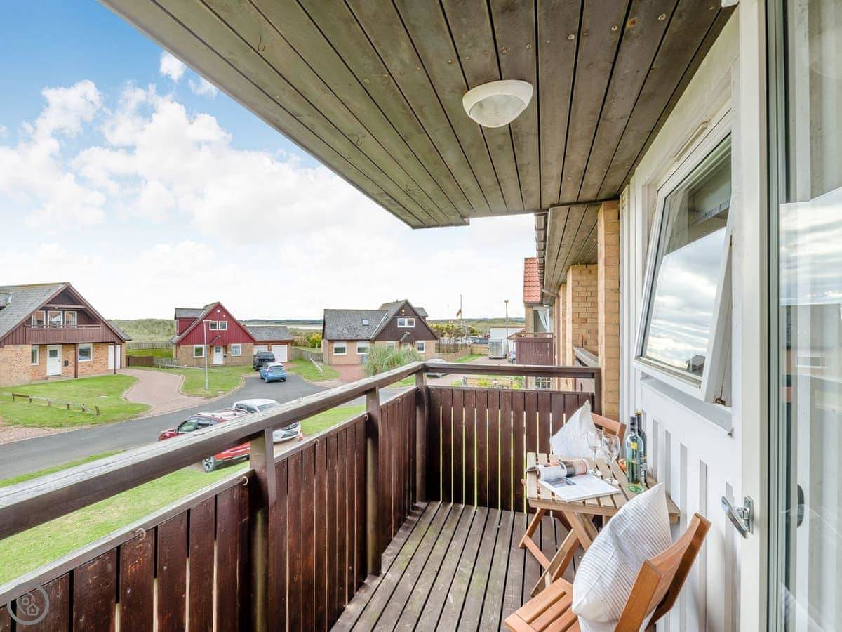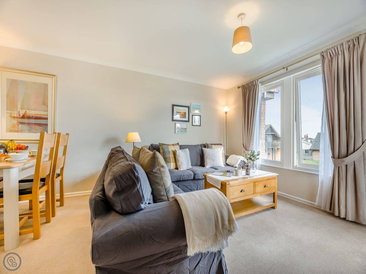 Dunes Court is a first floor apartment nestled amongst similar properties, situated less than 100 yards from the beautiful wide expanses of Beadnell Bay. Beautifully furnished throughout, with lots of thoughtful touches to ensure you have a welcoming and comfortable base to return to after a day of exploring. The communal hallway and stairs lead you up to the apartment. Stepping inside double glass doors open up into the spacious living room, with two large comfy sofas in front of large windows facing the sea. This room is open plan with the dining area, making this an inviting social space. The adjoining kitchen is well equipped, ideal for a self-catering stay. The balcony is the perfect spot to look out to the sea. There are two bedrooms, the master king bedroom as well as a bedroom with a double with a single bunk bed over, making this versatile for two couples as well as families. The apartment is completed with the well-presented bathroom.