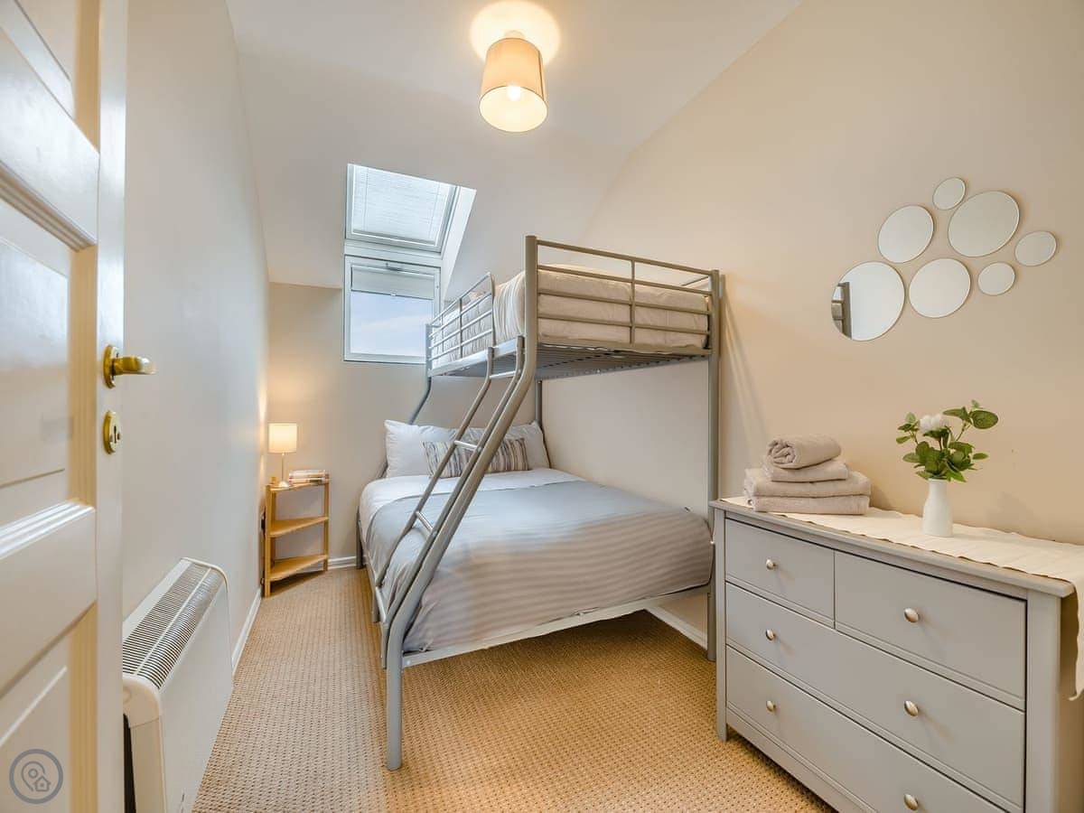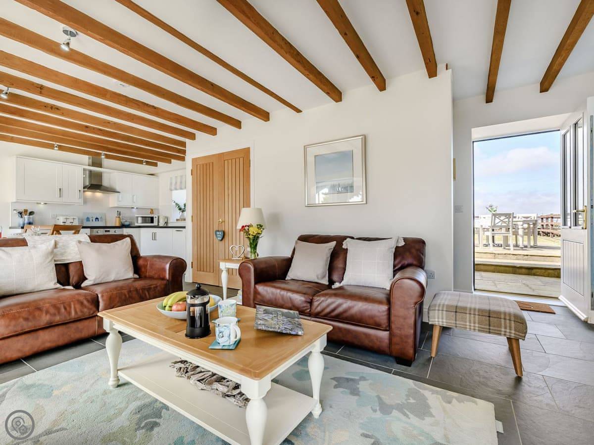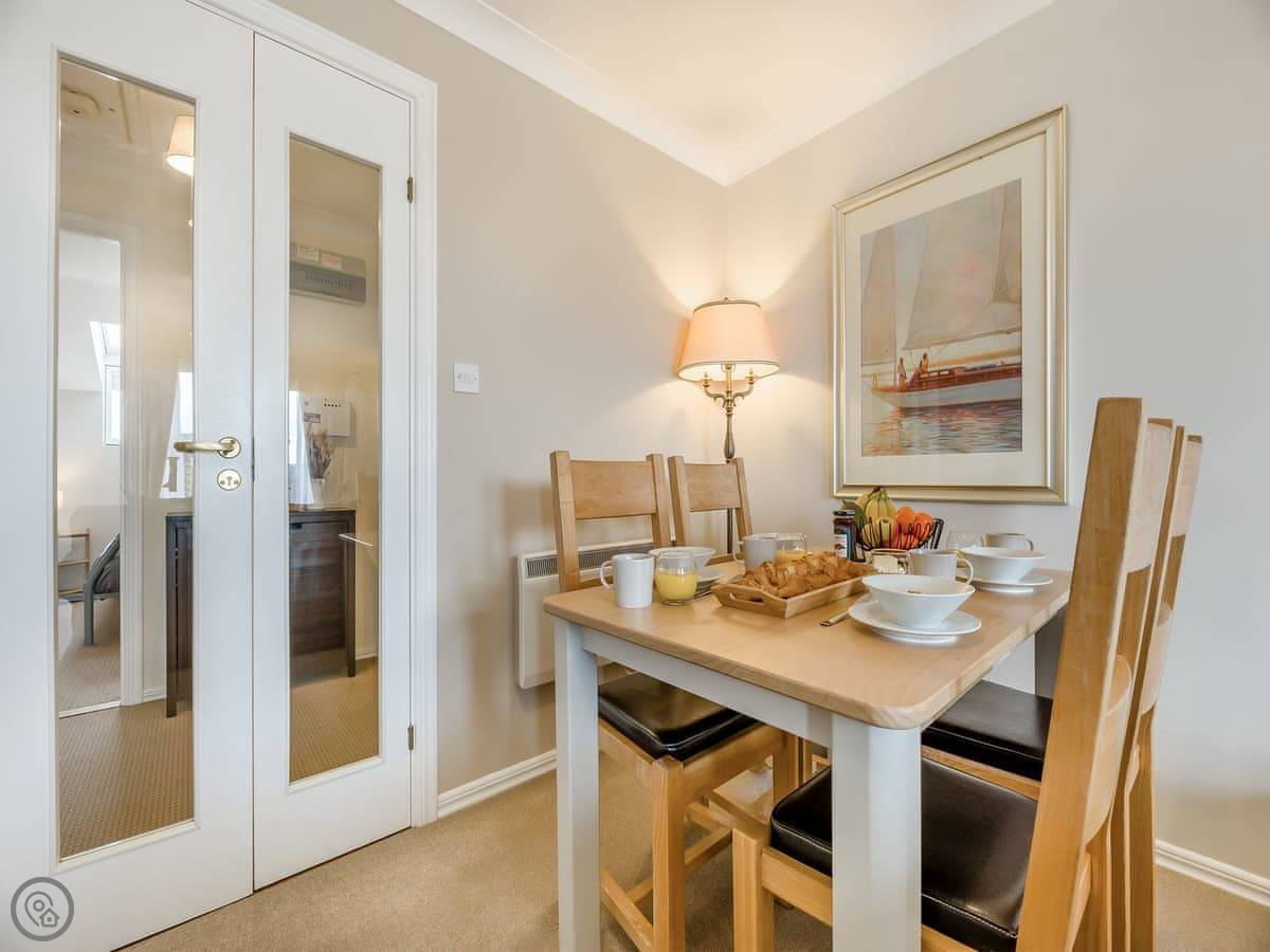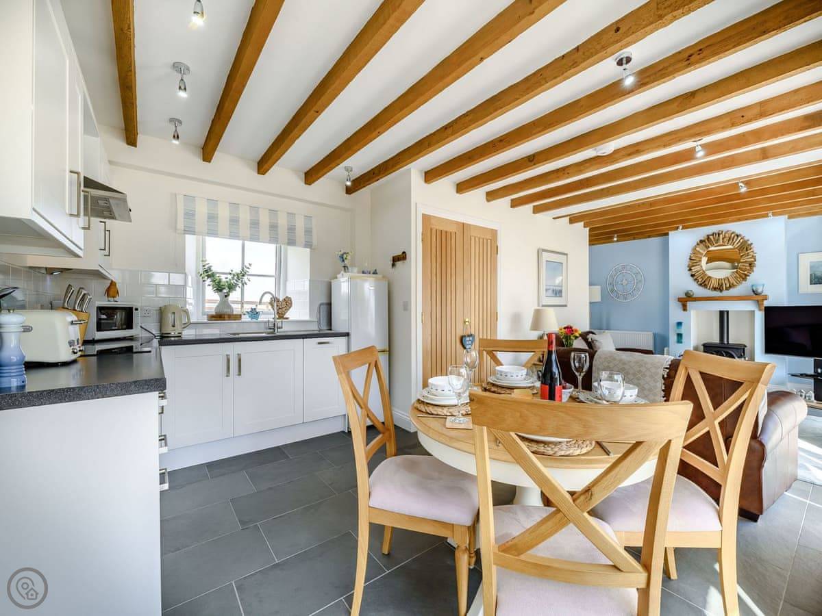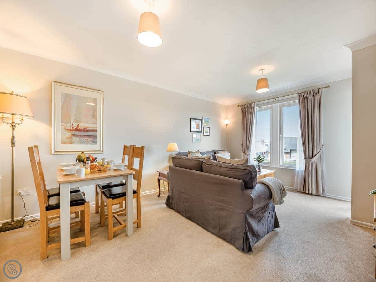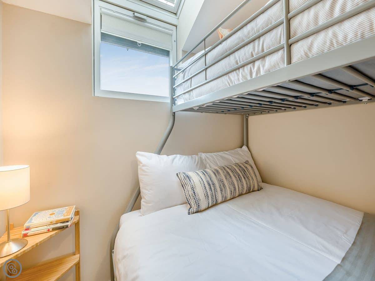 Dunes Court is a first floor apartment nestled amongst similar properties, situated less than 100 yards from the beautiful wide expanses of Beadnell Bay. Beautifully furnished throughout, with lots of thoughtful touches to ensure you have a welcoming and comfortable base to return to after a day of exploring. The communal hallway and stairs lead you up to the apartment. Stepping inside double glass doors open up into the spacious living room, with two large comfy sofas in front of large windows facing the sea. This room is open plan with the dining area, making this an inviting social space. The adjoining kitchen is well equipped, ideal for a self-catering stay. The balcony is the perfect spot to look out to the sea. There are two bedrooms, the master king bedroom as well as a bedroom with a double with a single bunk bed over, making this versatile for two couples as well as families. The apartment is completed with the well-presented bathroom.