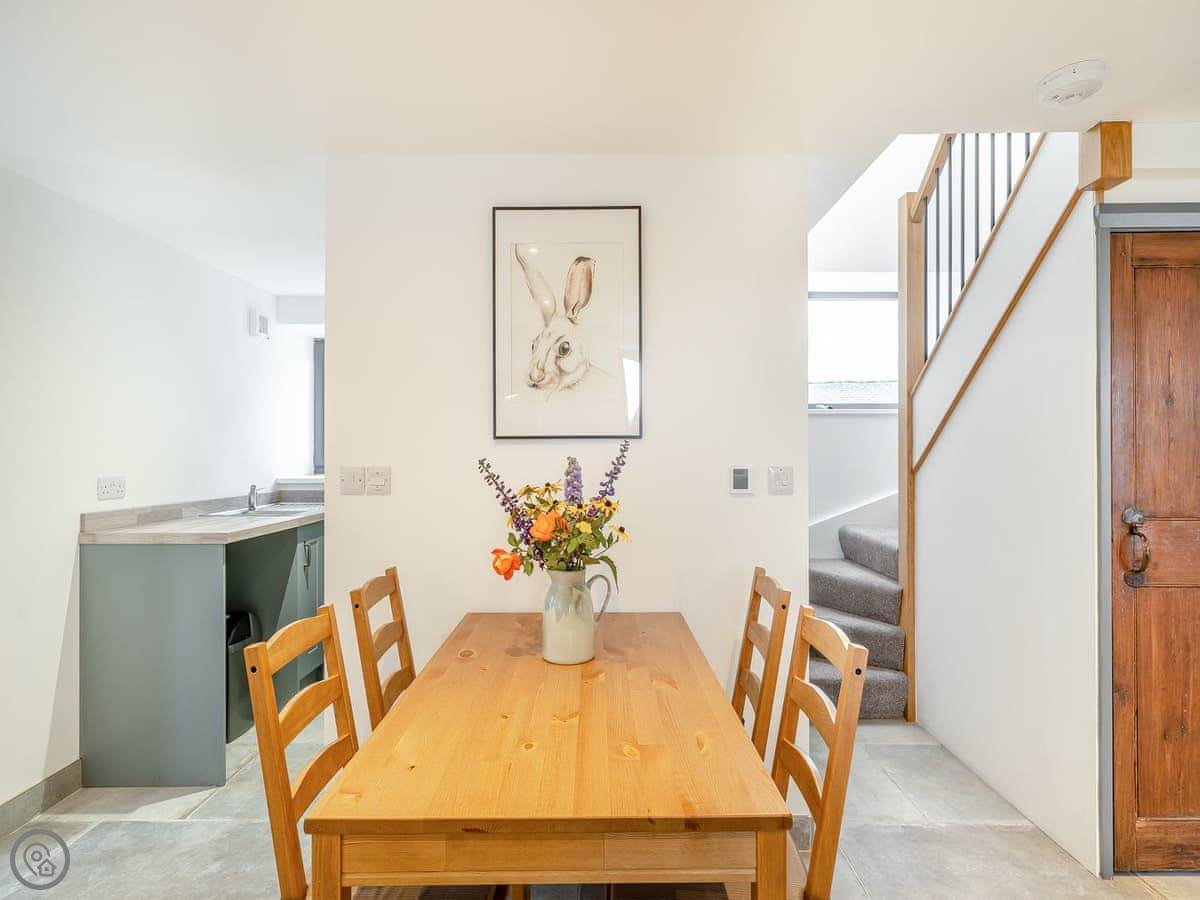 Downstairs is all open plan. Kitchen with a dishwasher and washing machine, then a living and dining area with a wood burner. There are double doors out to a little front garden with a table and chairs. The view from there is just fields. It's quiet.