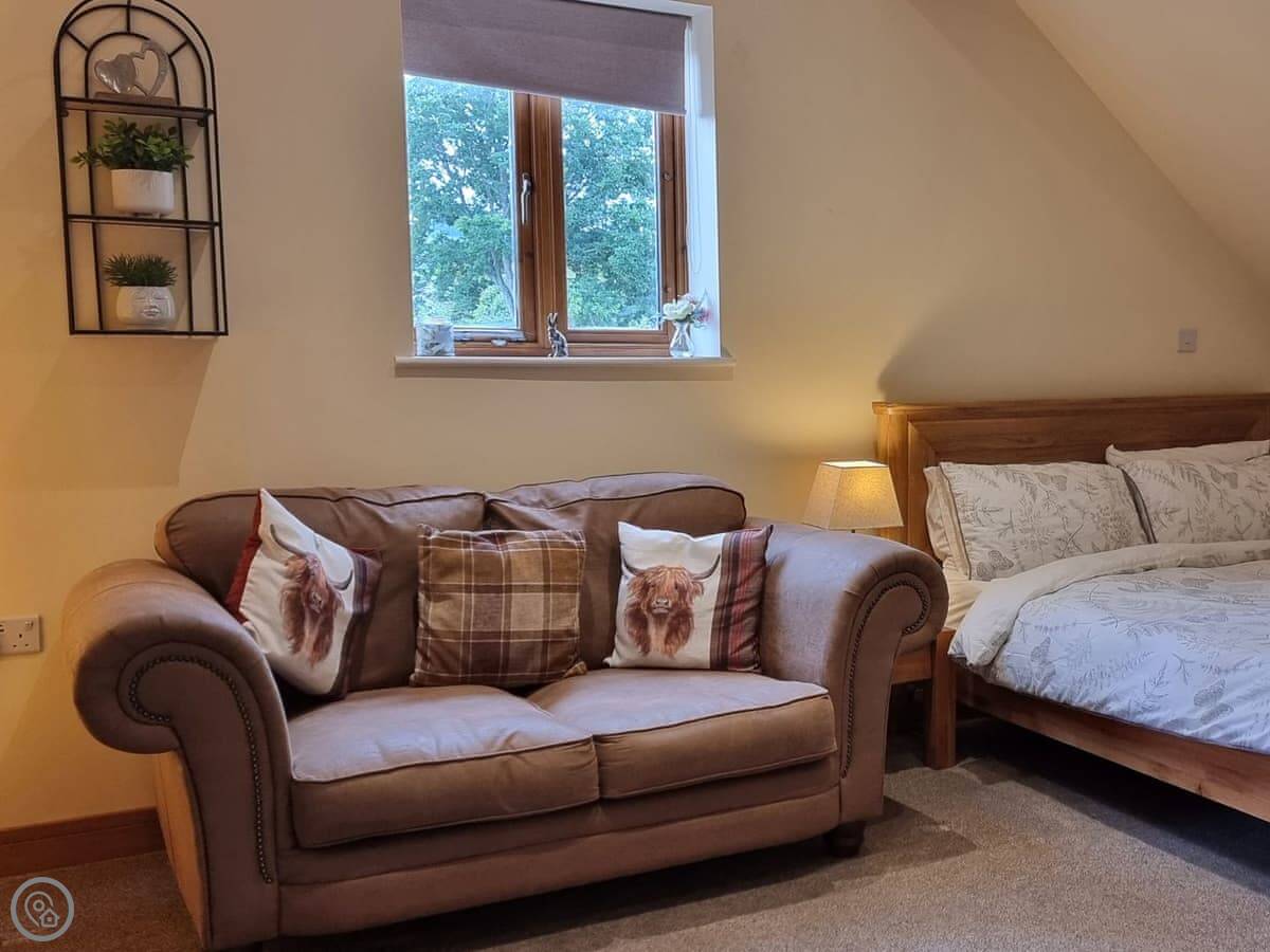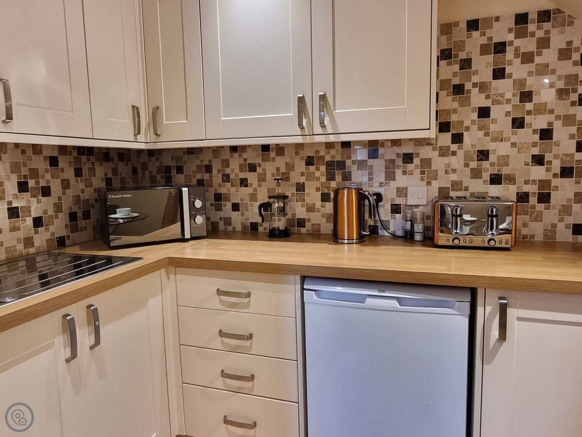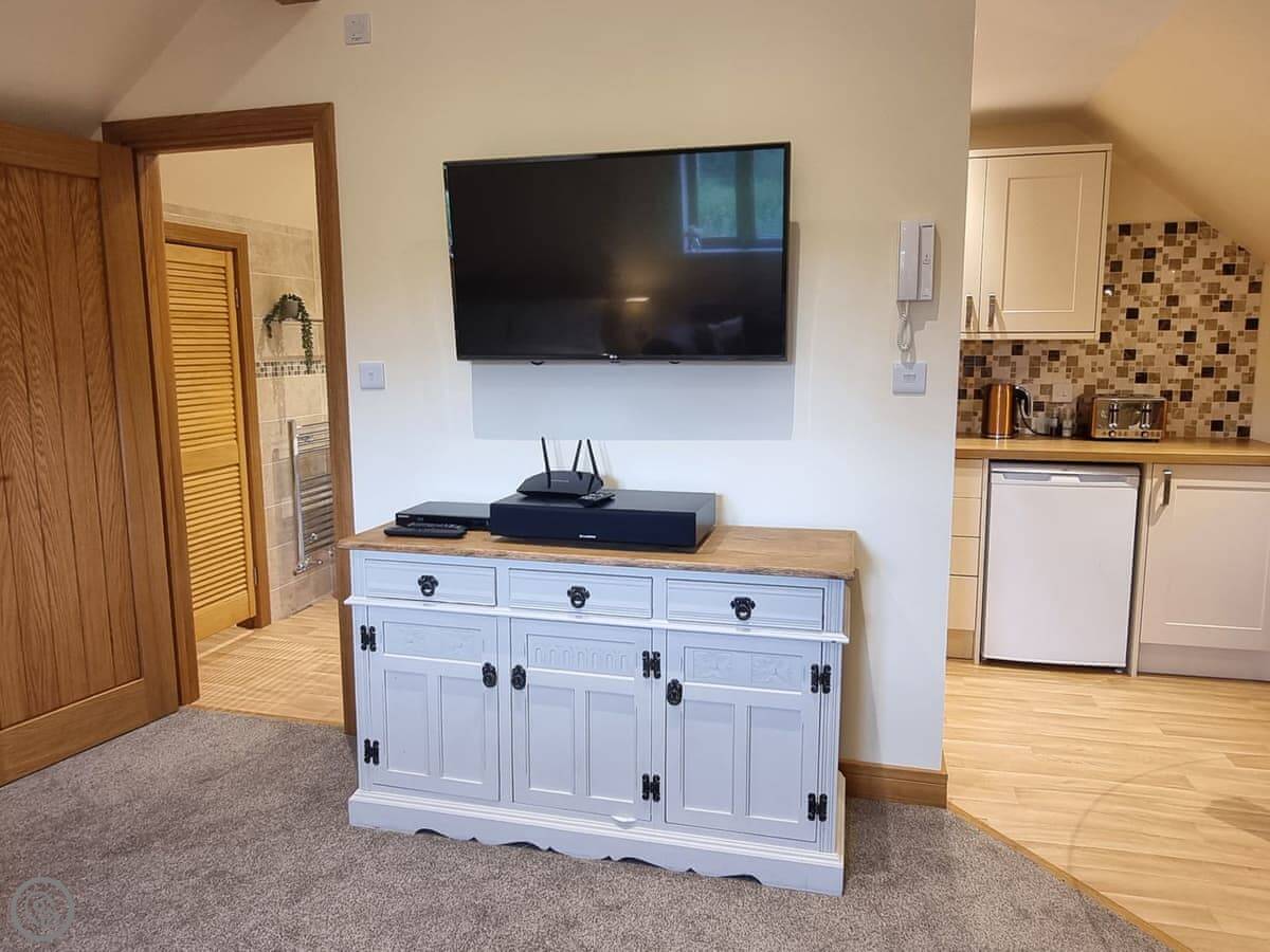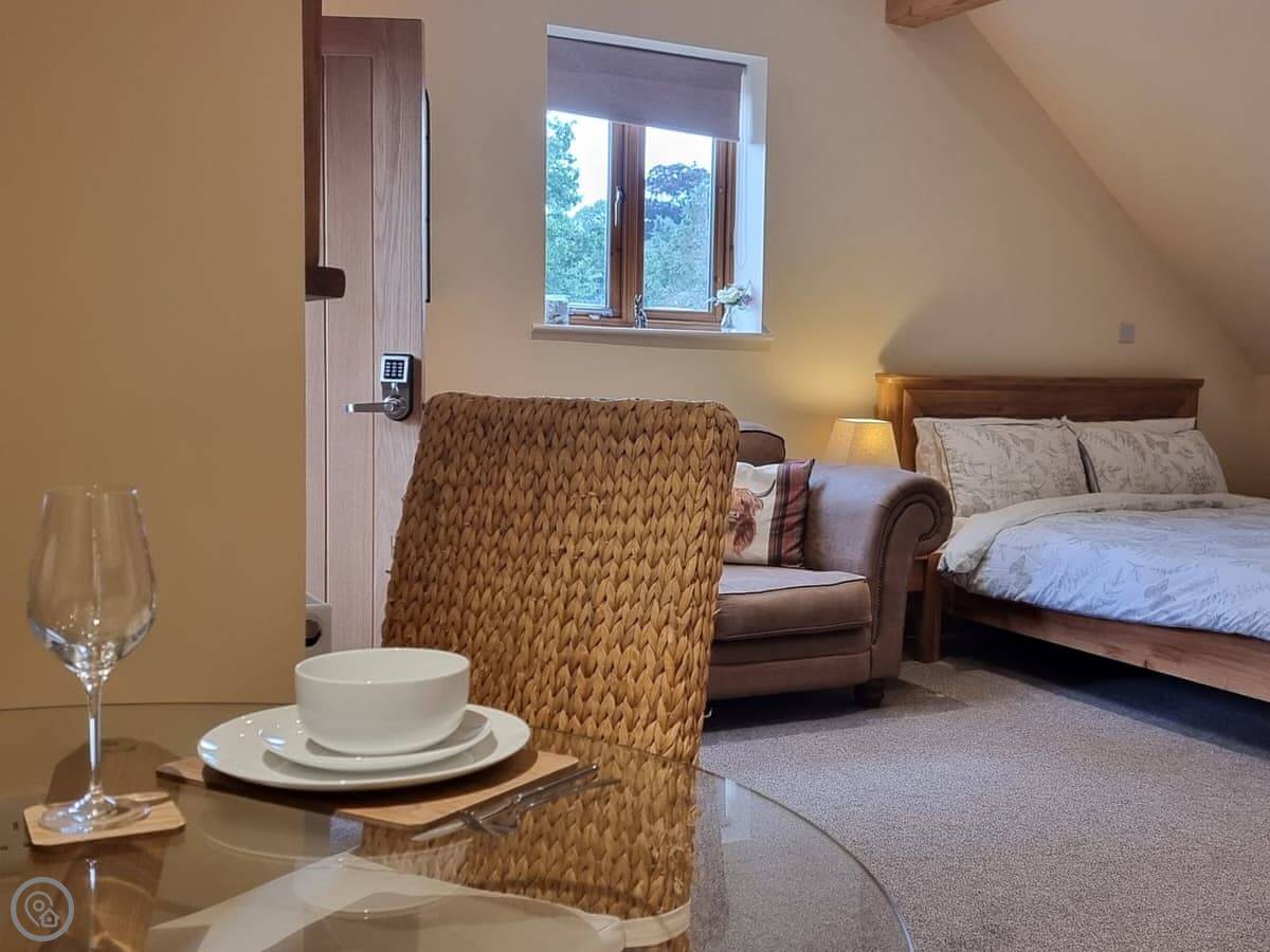 Orchard View is a first floor flat in our garden in Bilbrook. It's a studio, so it's all one open room with the bed, kitchen, and sitting area together. The ceiling is high with some oak beams, which looks nice.