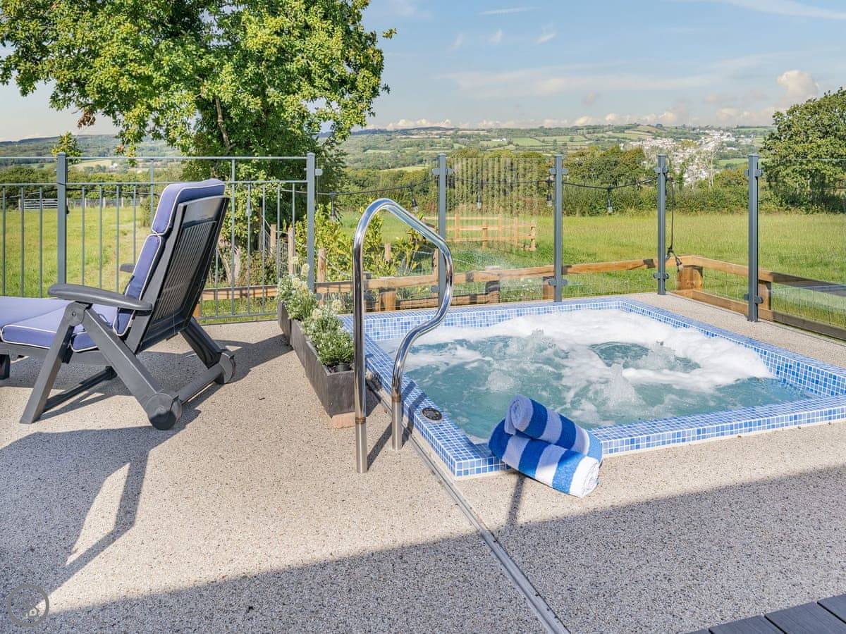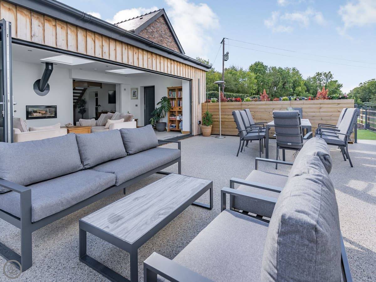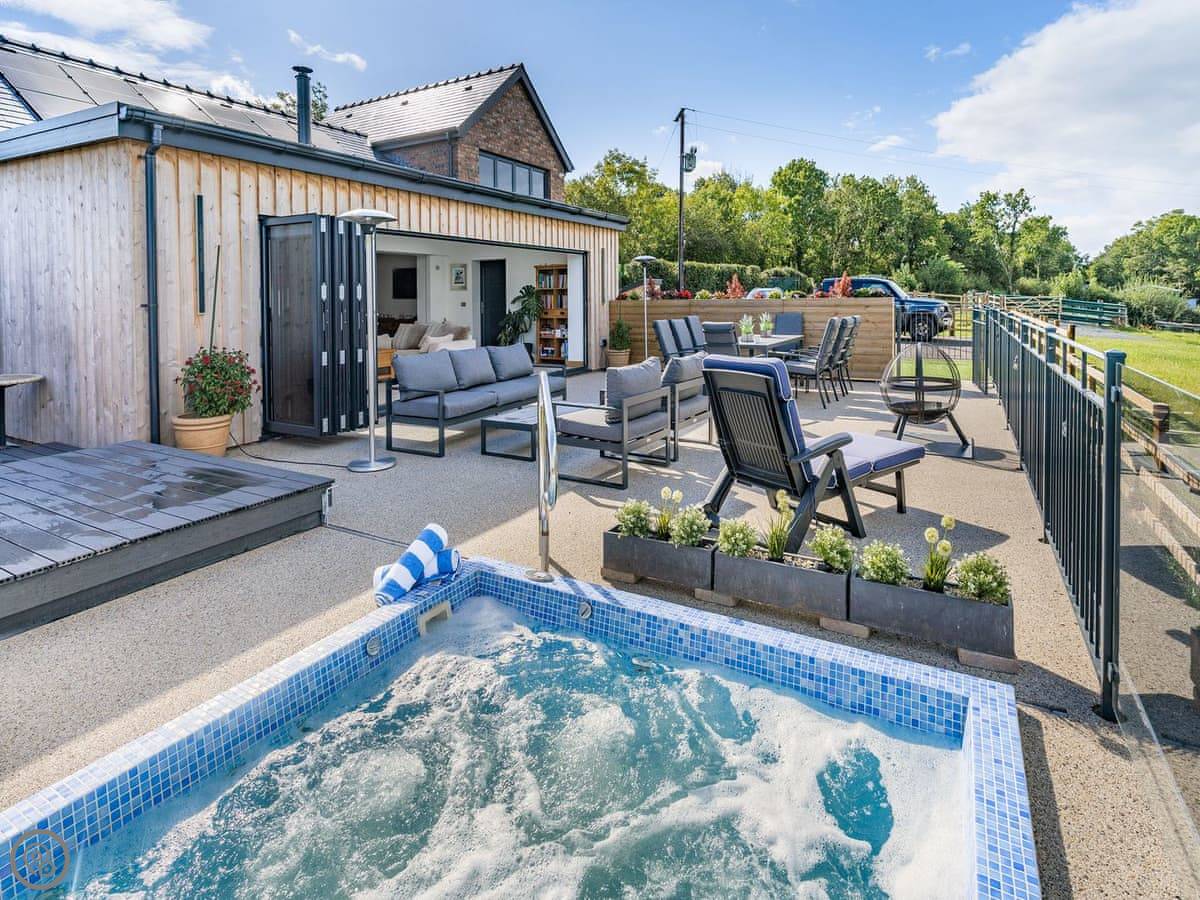 Outside, there's a patio area with a lot going on. There's a sunken hot tub, plenty of seating and a brick barbecue with a fire pit. The garden is yours to use.