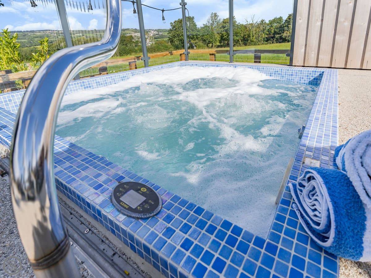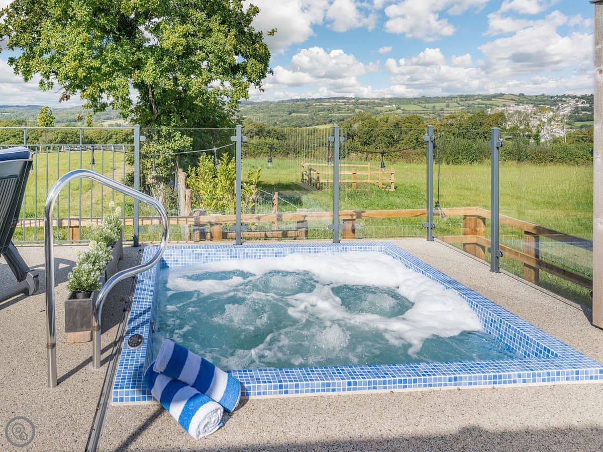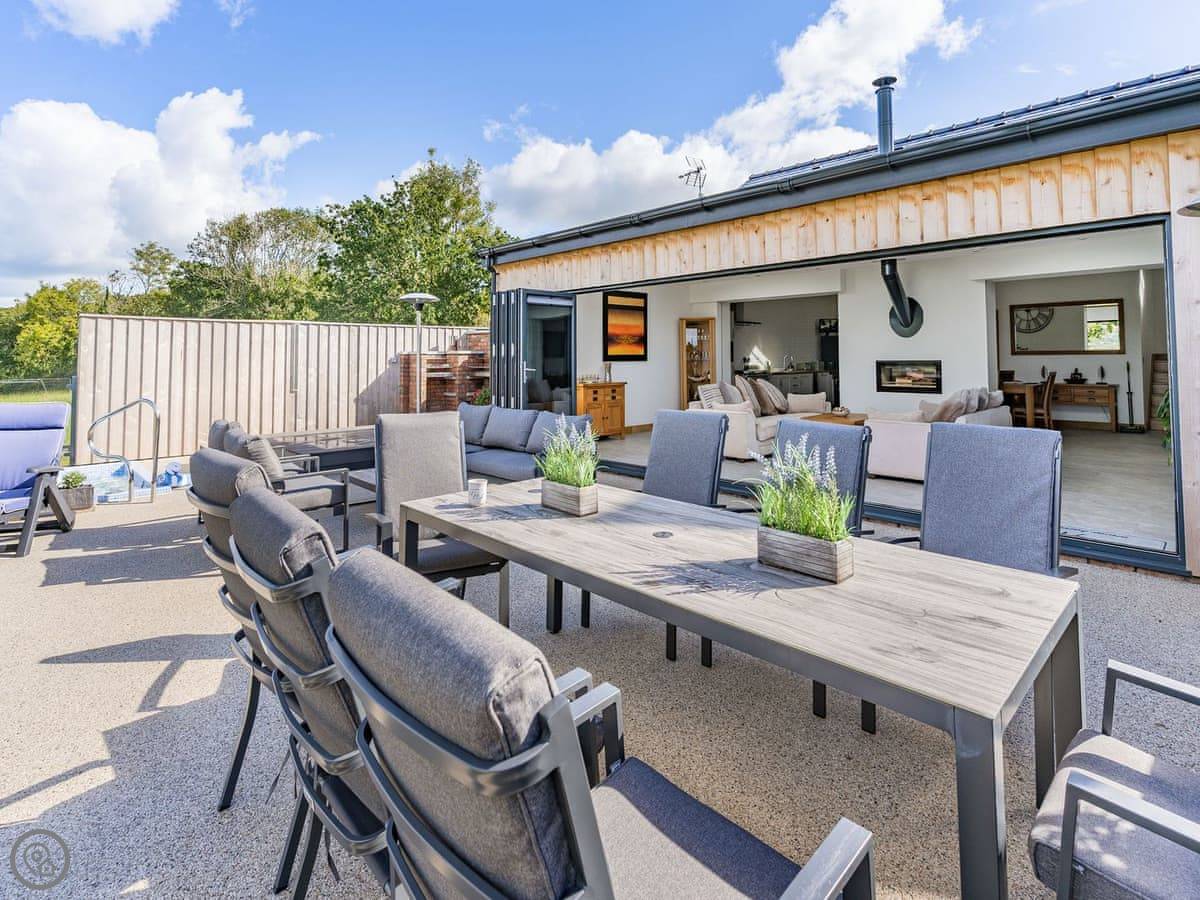 Outside, there's a patio area with a lot going on. There's a sunken hot tub, plenty of seating and a brick barbecue with a fire pit. The garden is yours to use.