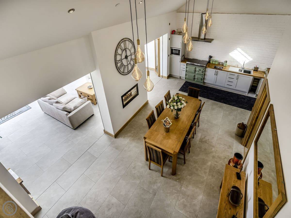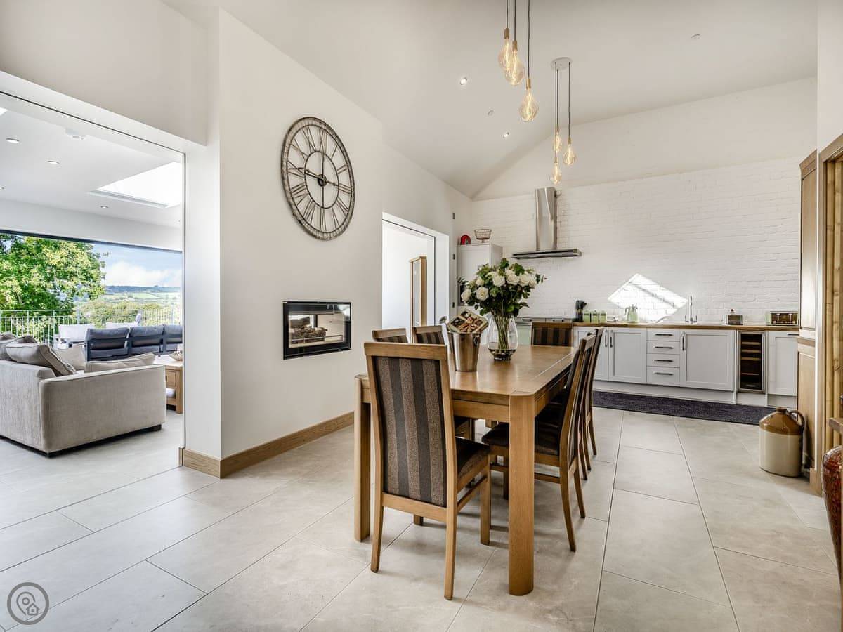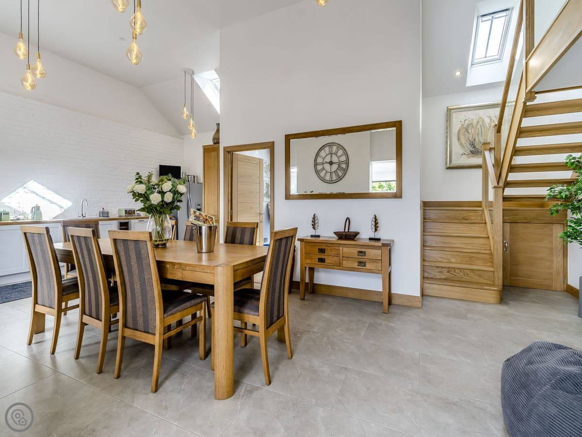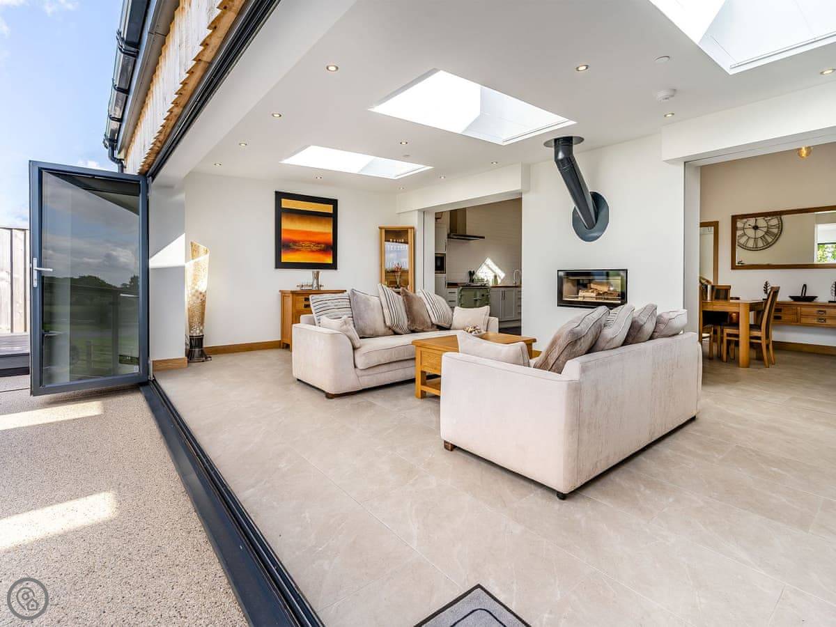 It sleeps six people across three bedrooms. You get two bathrooms, which helps. One's an ensuite upstairs. The place has a 5 Star rating, which means it's been finished to a high standard. It's modern inside, open plan. There's a big wood burner in the middle of the main room, and it's got a Sky Glass TV and WiFi.