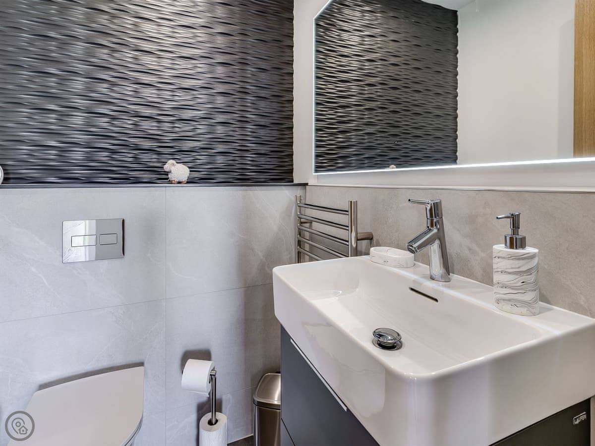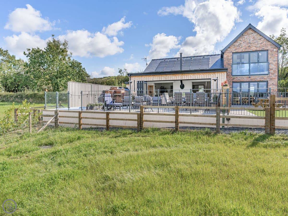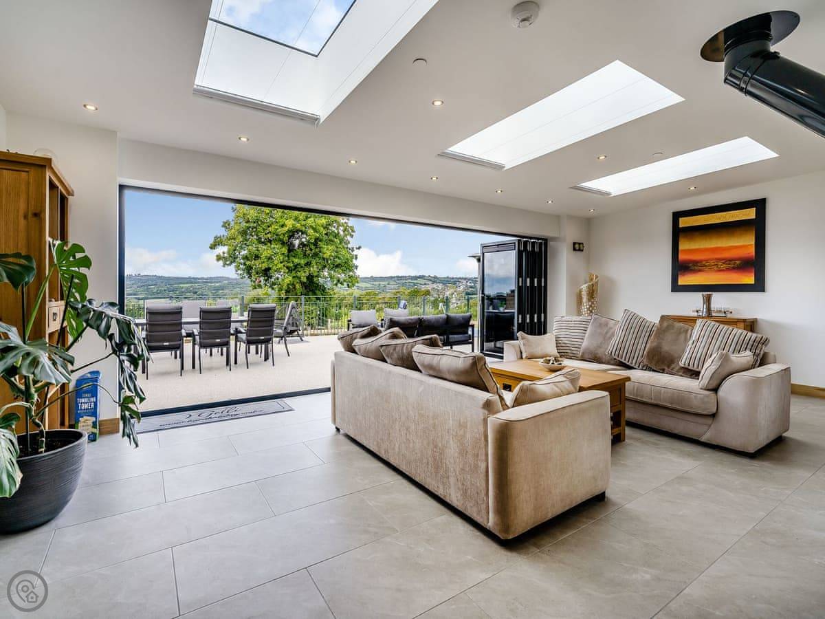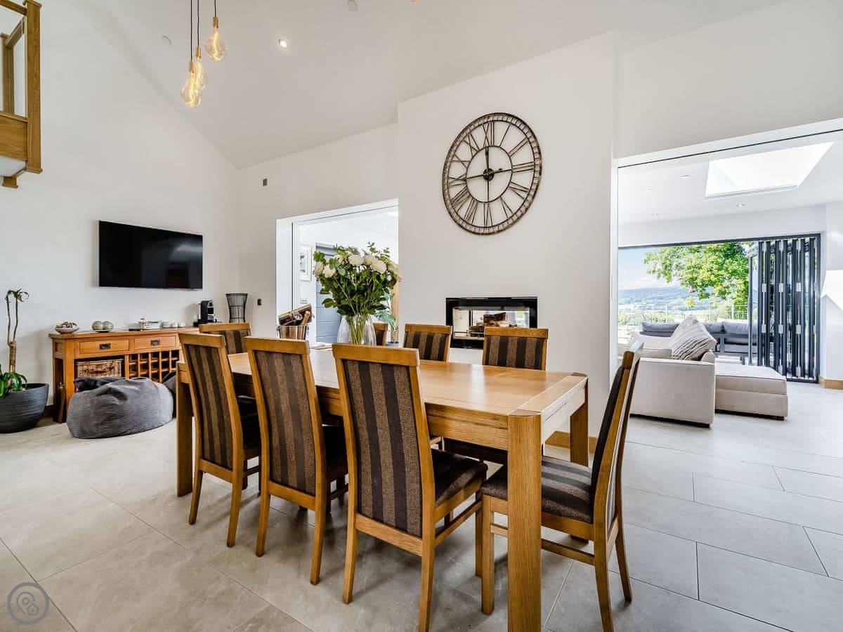 It sleeps six people across three bedrooms. You get two bathrooms, which helps. One's an ensuite upstairs. The place has a 5 Star rating, which means it's been finished to a high standard. It's modern inside, open plan. There's a big wood burner in the middle of the main room, and it's got a Sky Glass TV and WiFi.