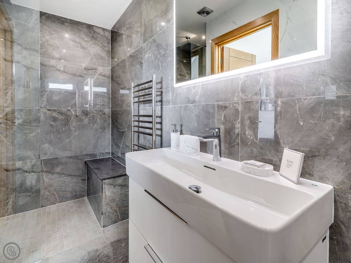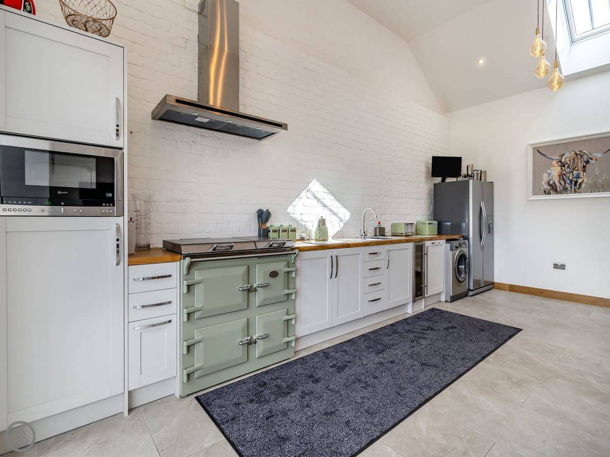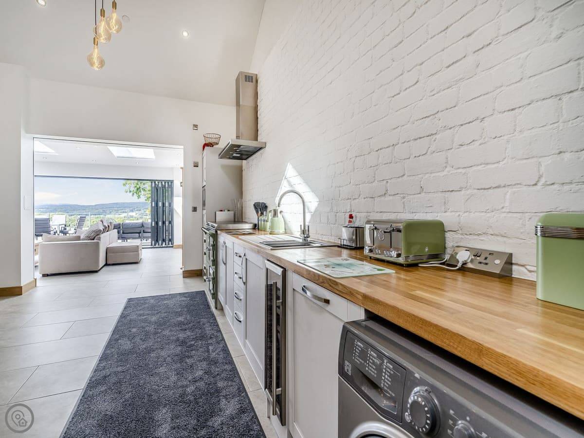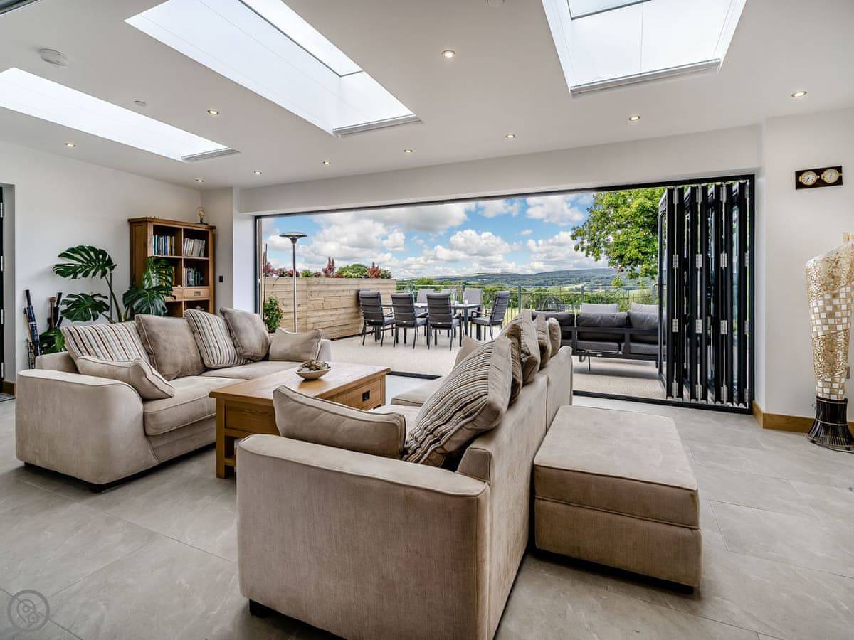 It sleeps six people across three bedrooms. You get two bathrooms, which helps. One's an ensuite upstairs. The place has a 5 Star rating, which means it's been finished to a high standard. It's modern inside, open plan. There's a big wood burner in the middle of the main room, and it's got a Sky Glass TV and WiFi.