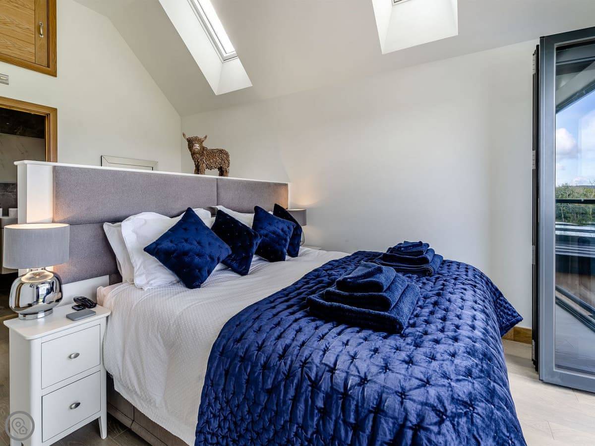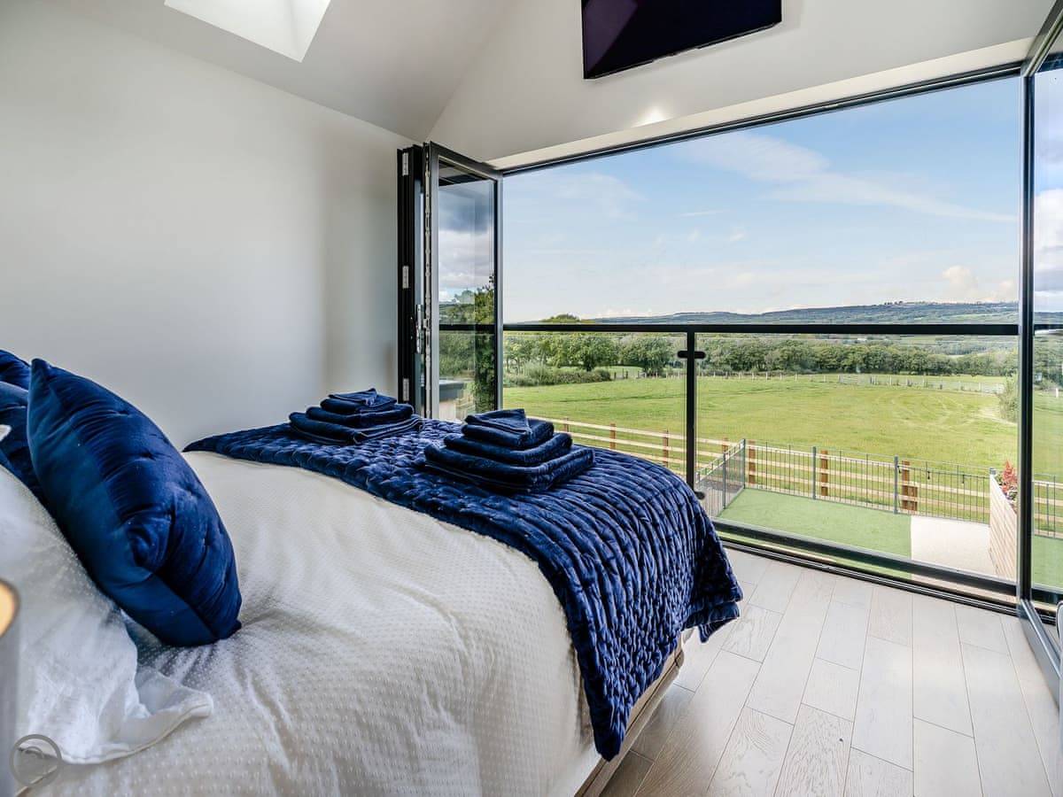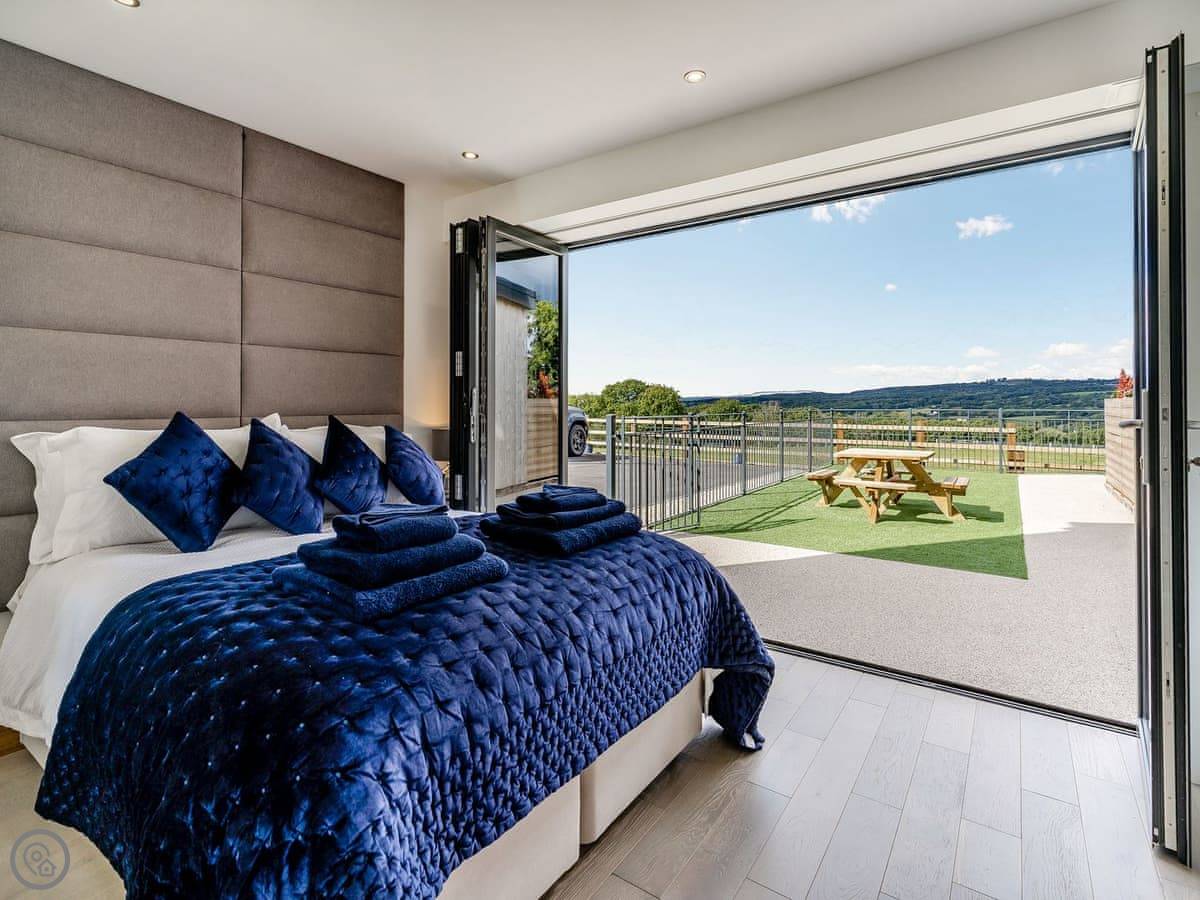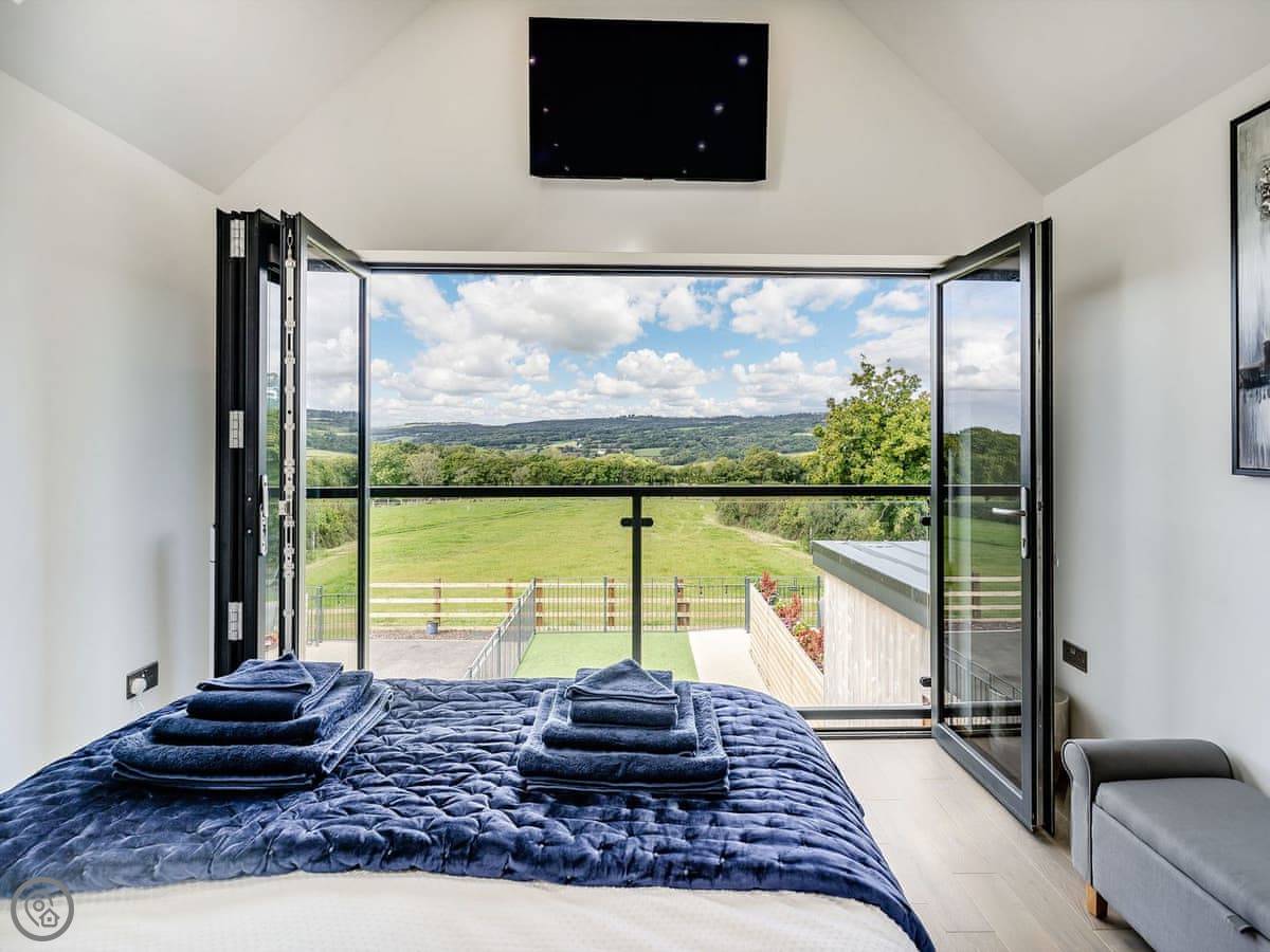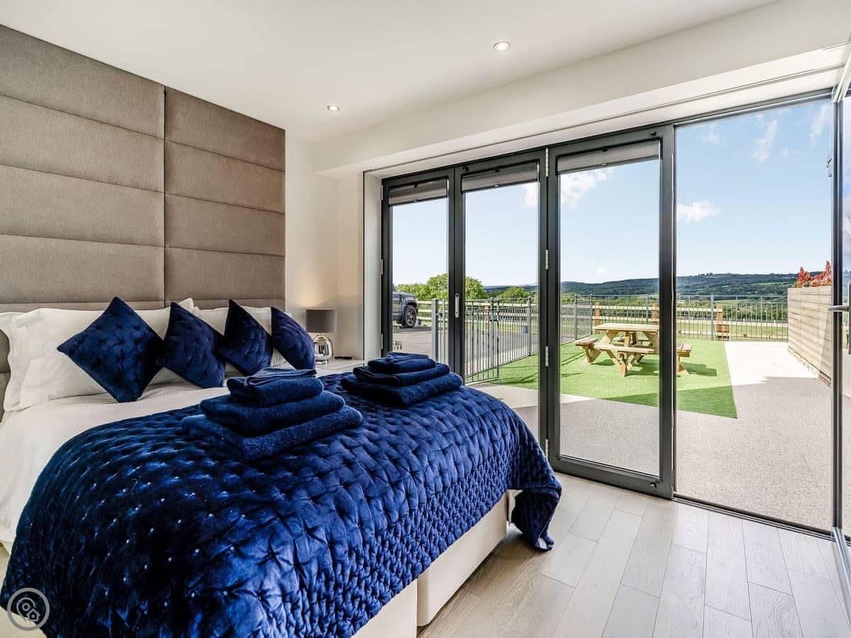 The main bedroom upstairs has a super kingsize bed and its own shower. It also has really good views over the fields. Downstairs, one bedroom has patio doors straight out to the garden and a bathroom next to it with a bath and walk-in shower. The bed in there can be two singles if you need that. The other downstairs room is flexible, with a double sofa bed and a single cabin bed, so it's good for a family.