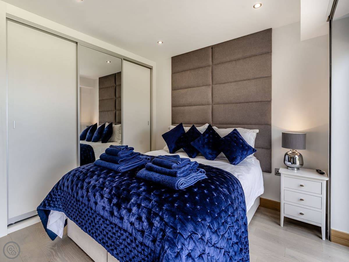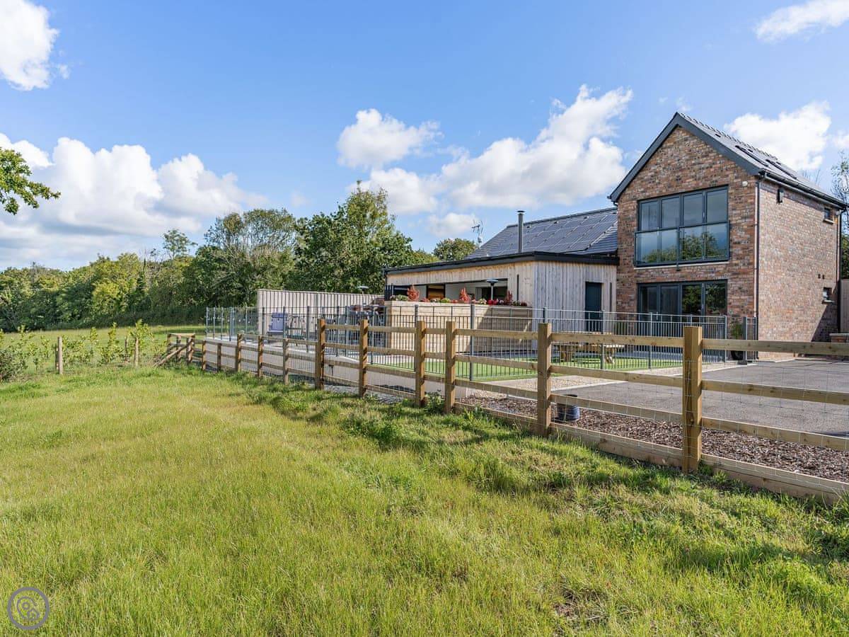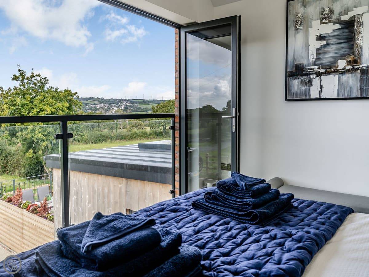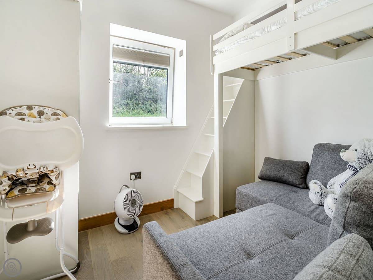 The main bedroom upstairs has a super kingsize bed and its own shower. It also has really good views over the fields. Downstairs, one bedroom has patio doors straight out to the garden and a bathroom next to it with a bath and walk-in shower. The bed in there can be two singles if you need that. The other downstairs room is flexible, with a double sofa bed and a single cabin bed, so it's good for a family.