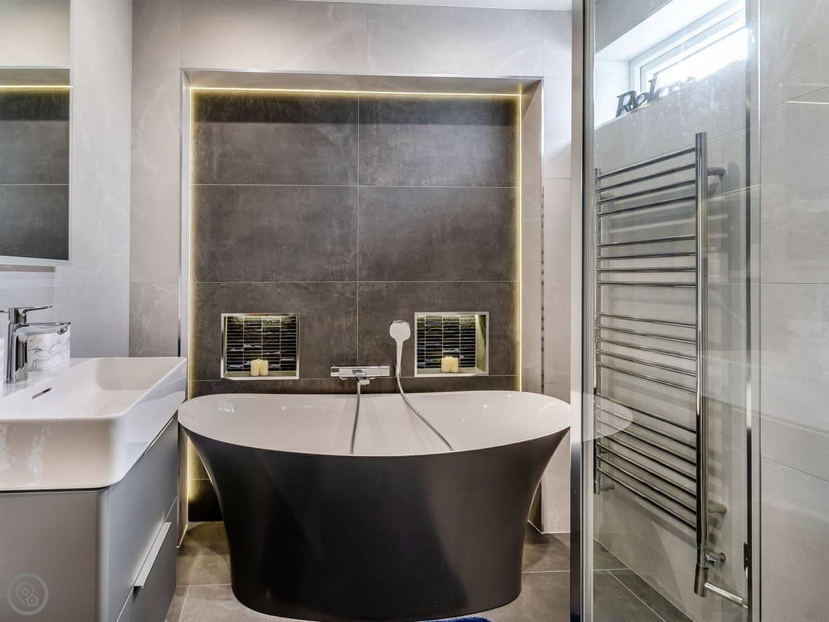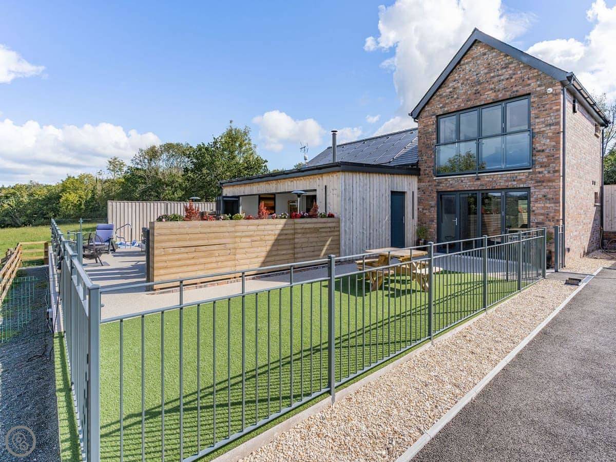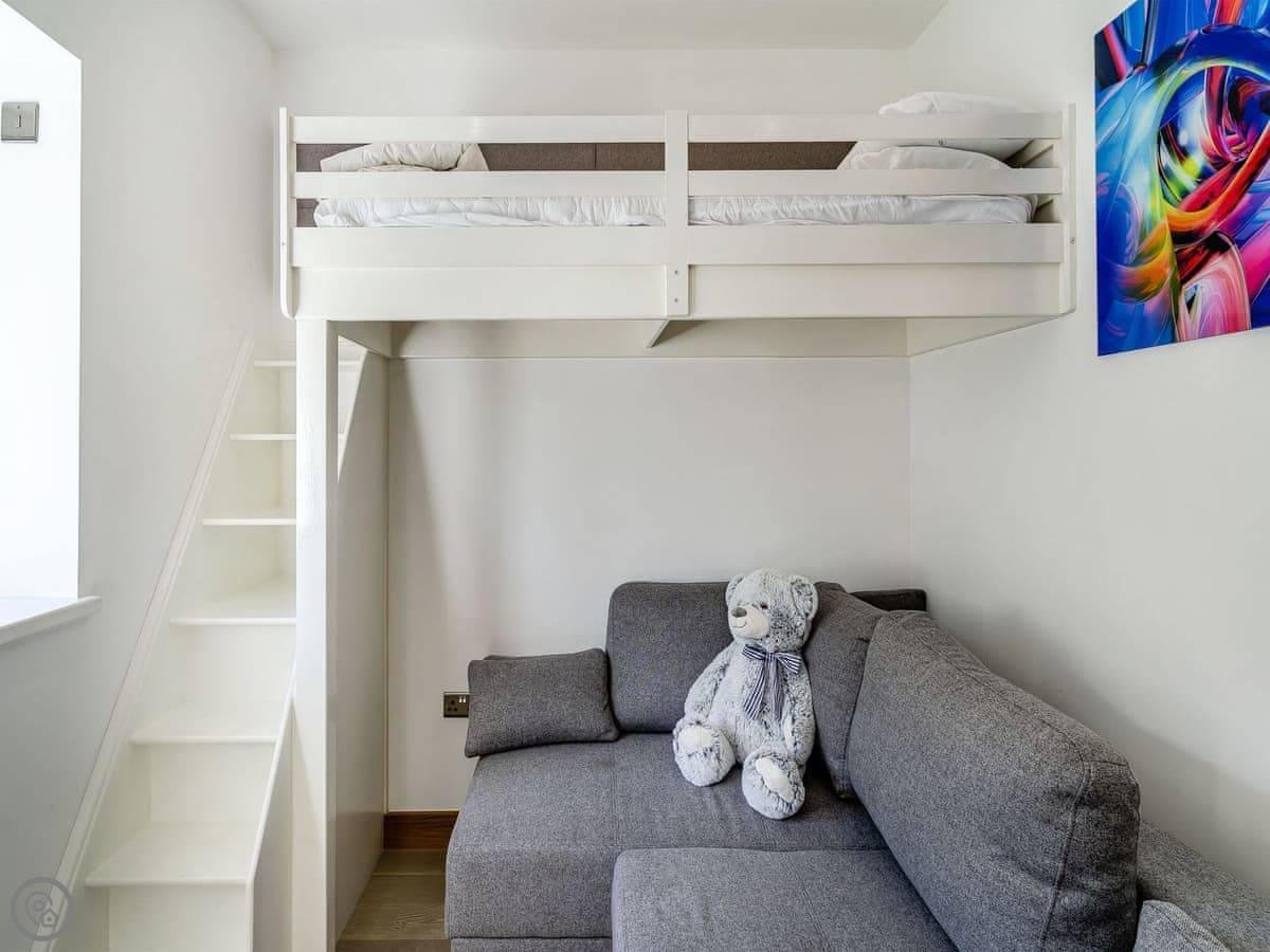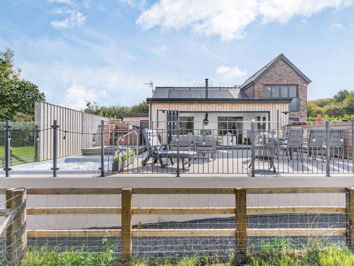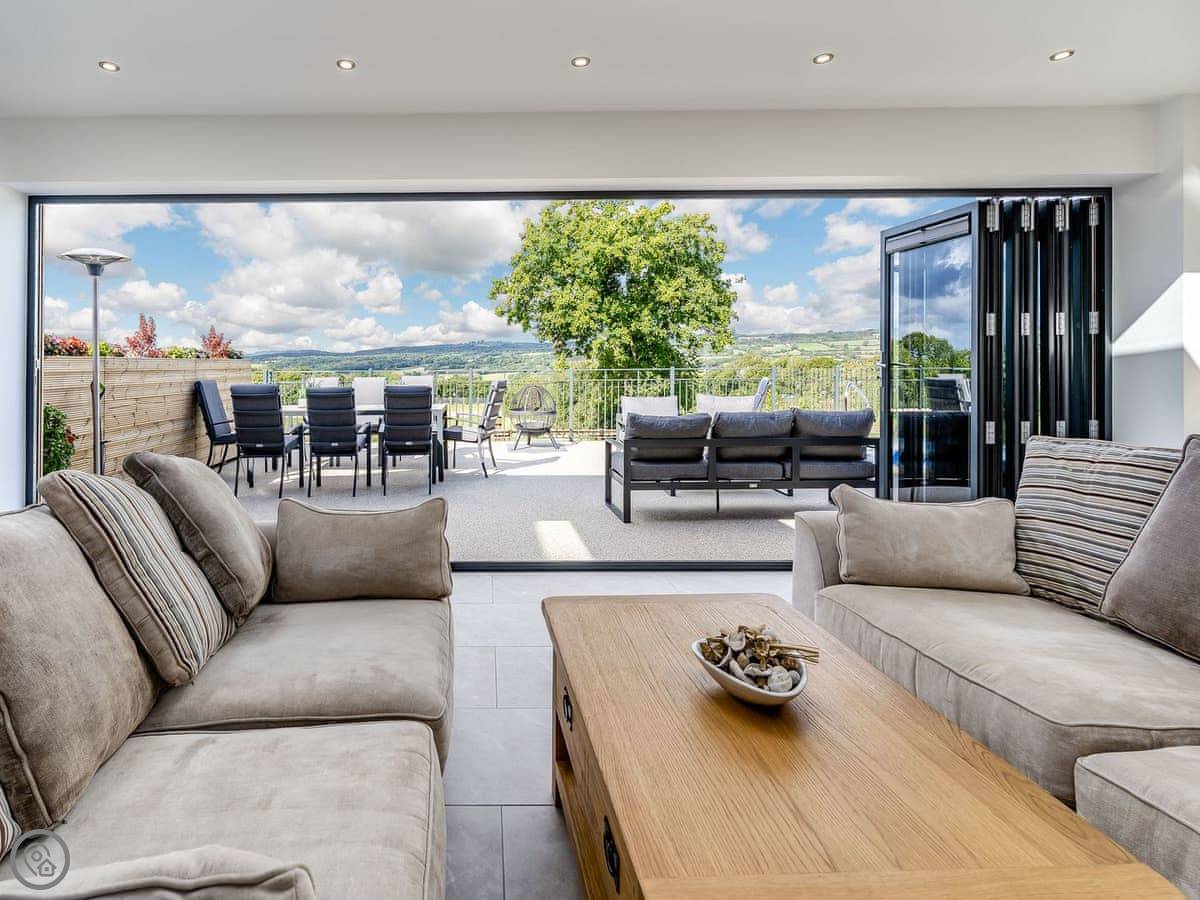 The main bedroom upstairs has a super kingsize bed and its own shower. It also has really good views over the fields. Downstairs, one bedroom has patio doors straight out to the garden and a bathroom next to it with a bath and walk-in shower. The bed in there can be two singles if you need that. The other downstairs room is flexible, with a double sofa bed and a single cabin bed, so it's good for a family.