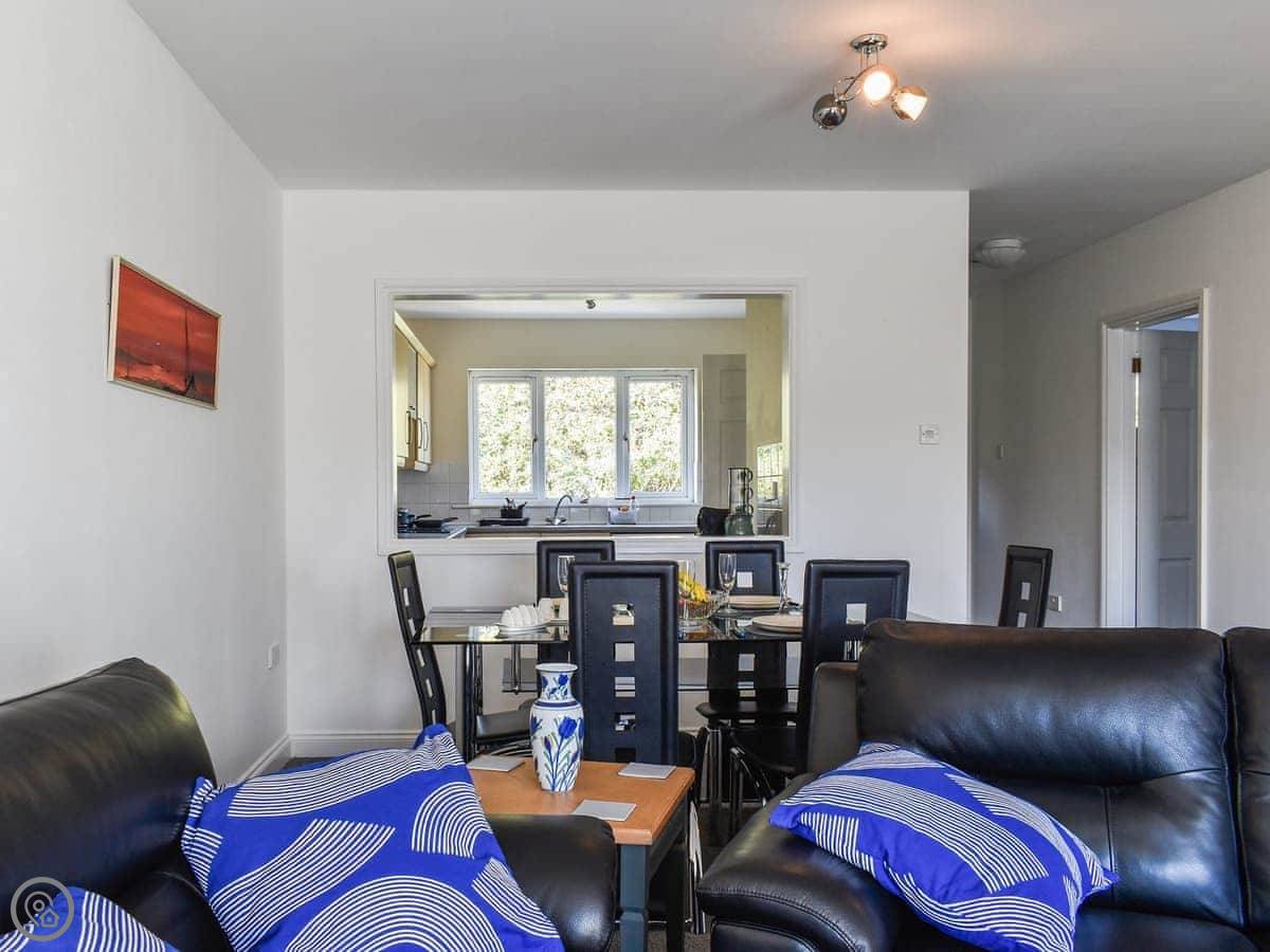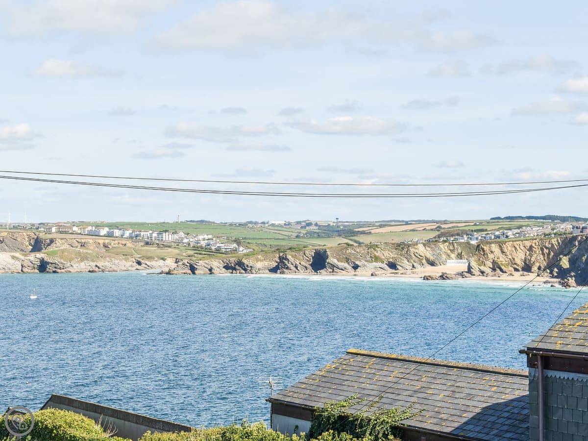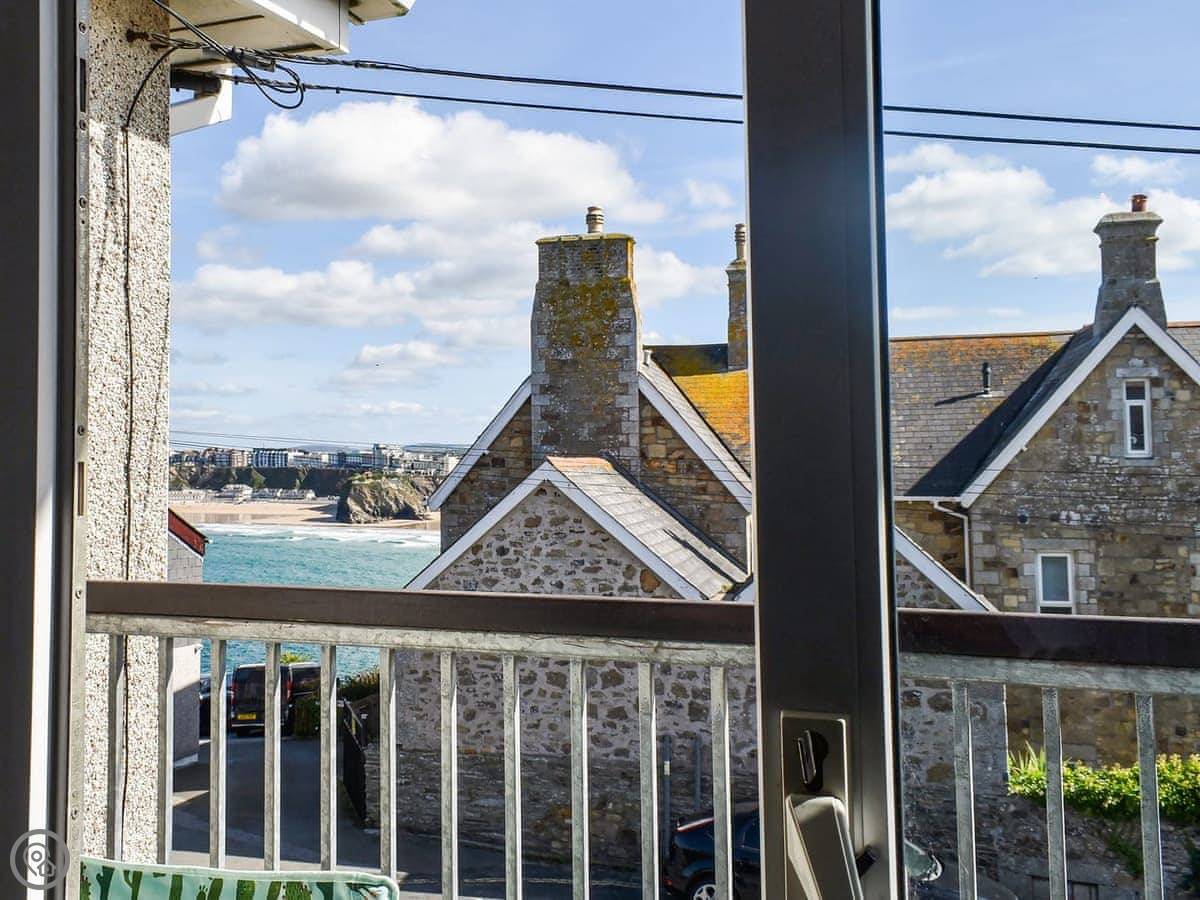 The main living area is all open plan. Kitchen, dining table, sofa and a big TV. Views from the window are over Fistral beach. You can see the sea.